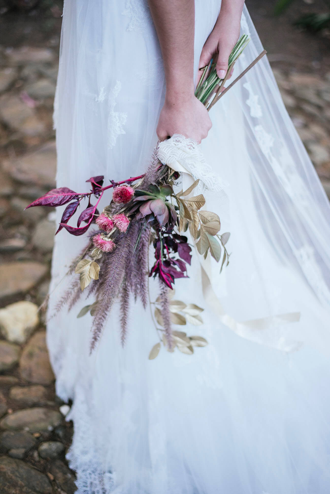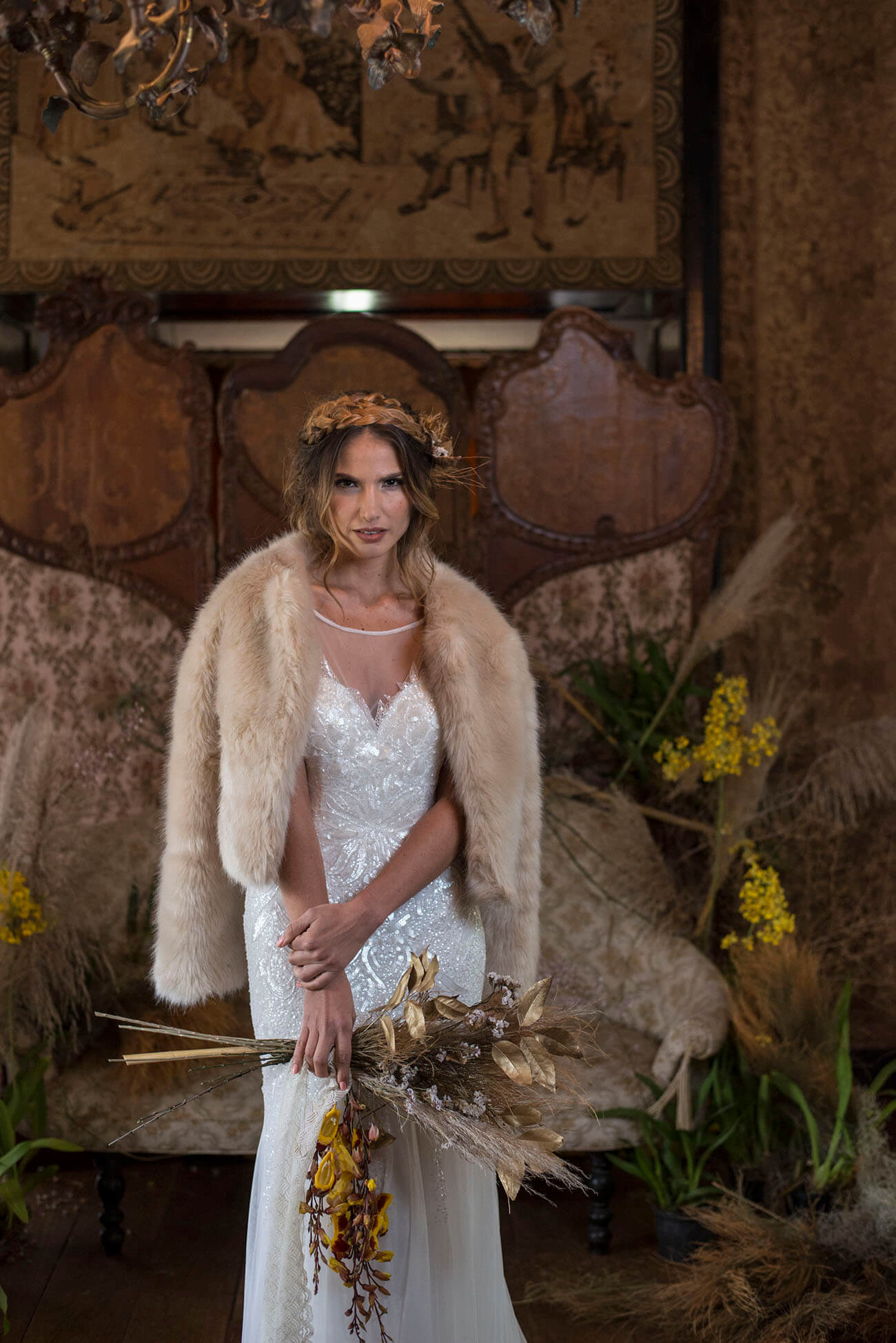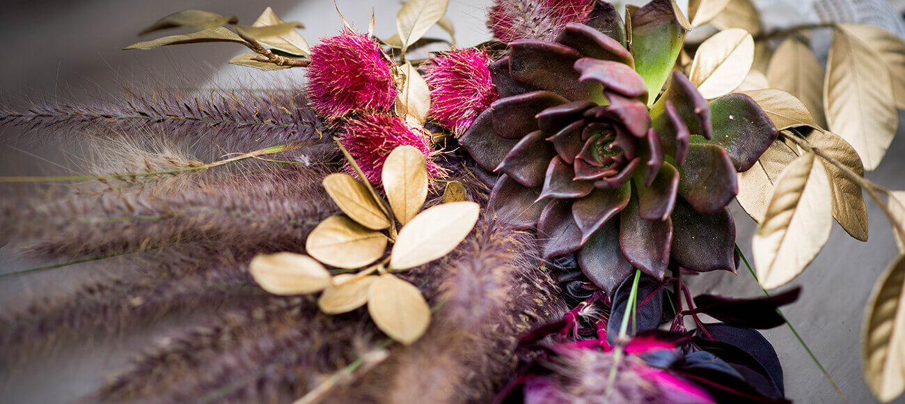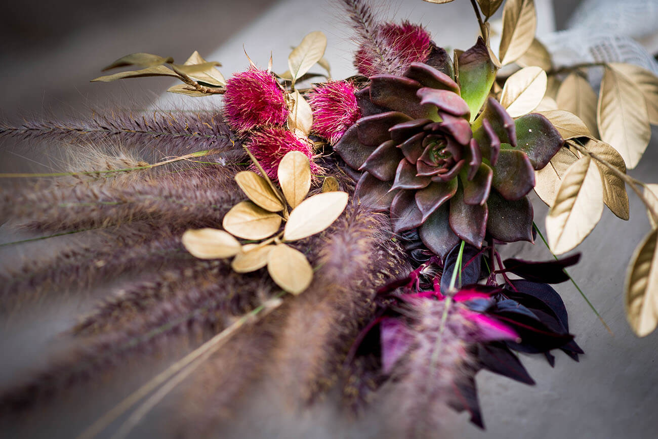 La propuesta es evocar su entorno árido, sus colores tostados y tierras. Como en este ramo, de follajes naturales, pero secos; de plumones, toques dorados, ocres y amarillos quemados.