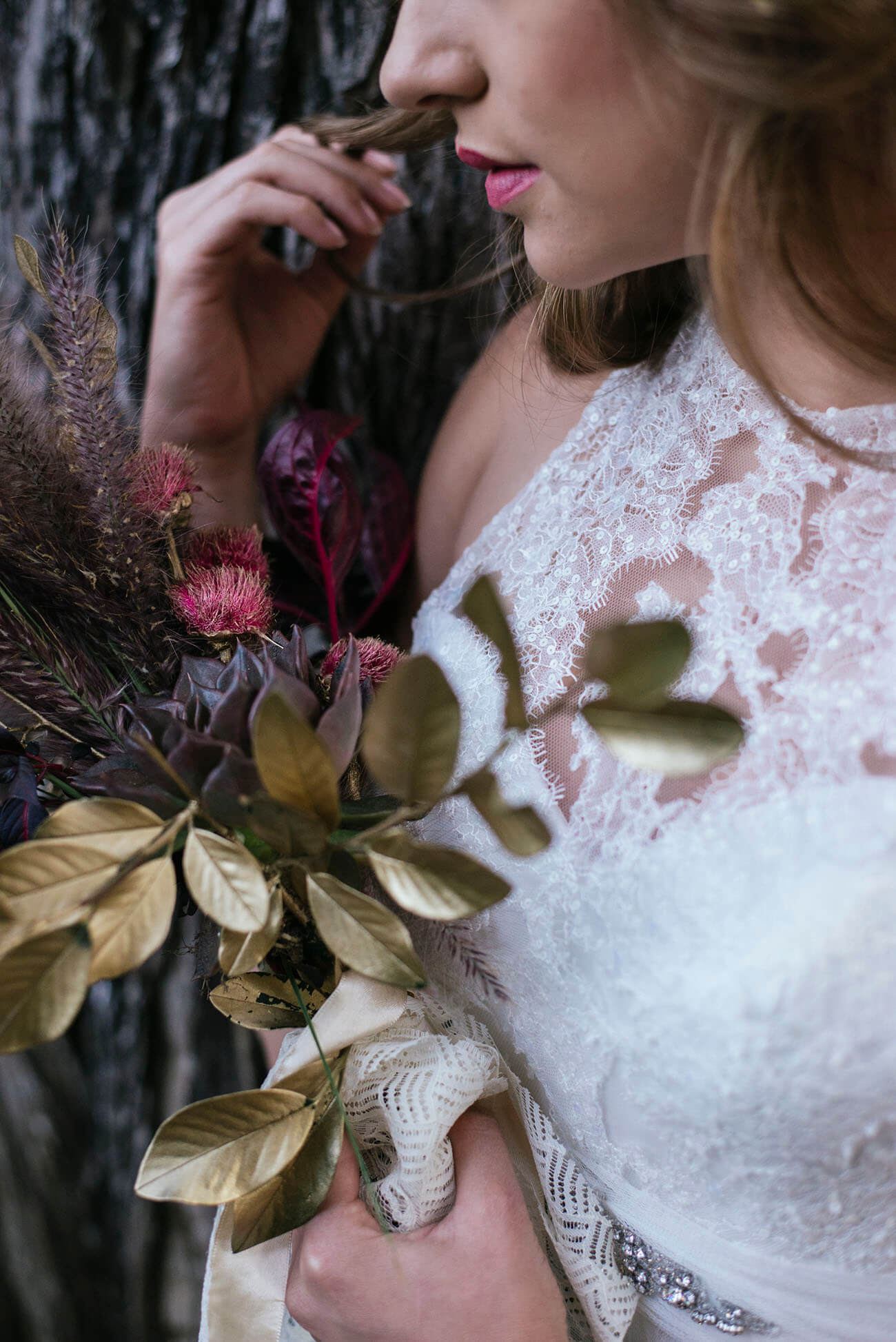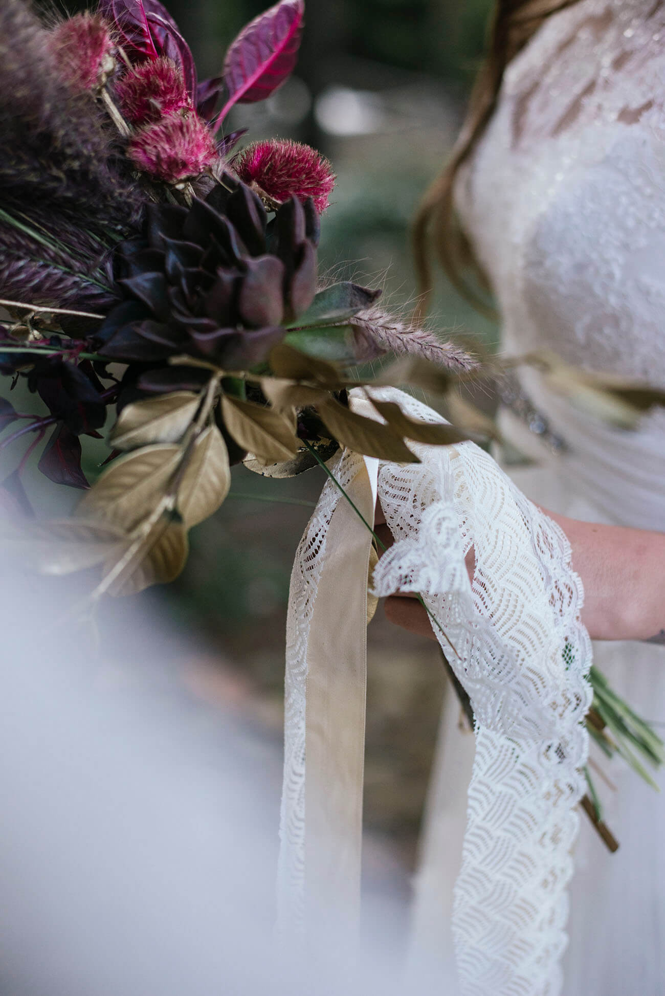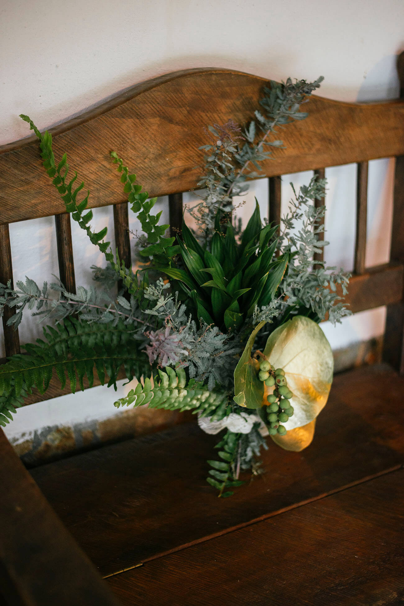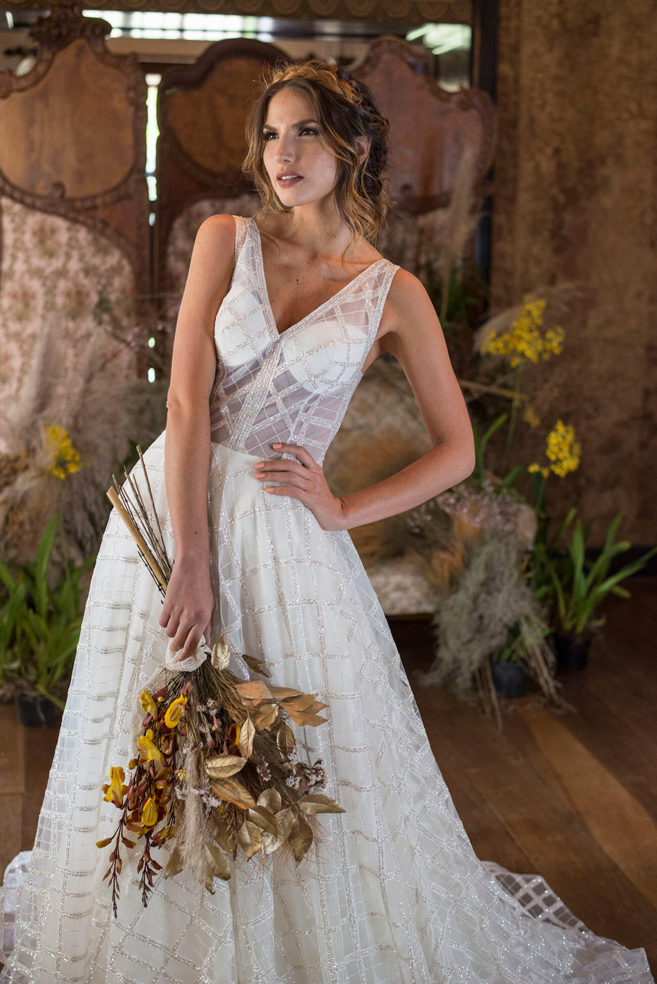La propuesta es evocar su entorno árido, sus colores tostados y tierras. Como en este ramo, de follajes naturales, pero secos; de plumones, toques dorados, ocres y amarillos quemados.