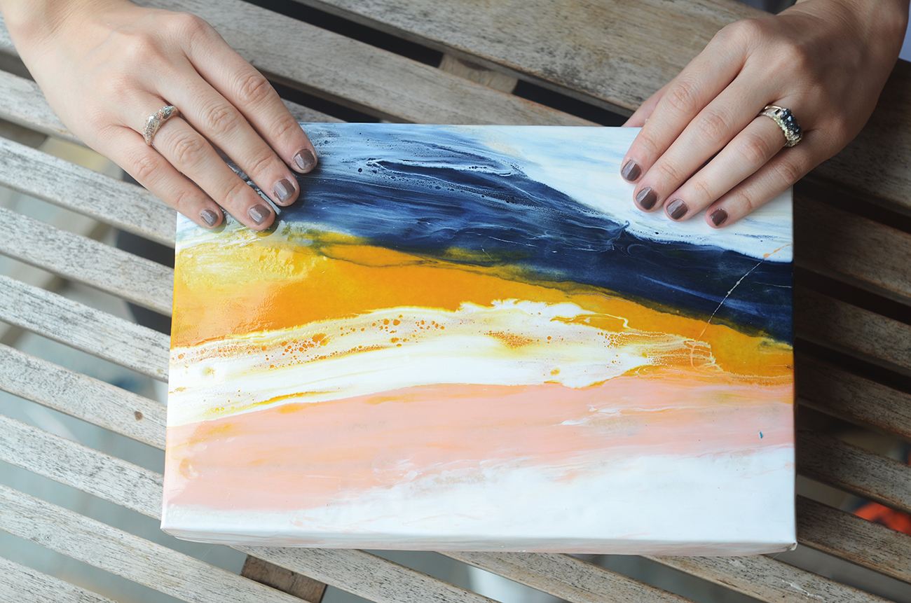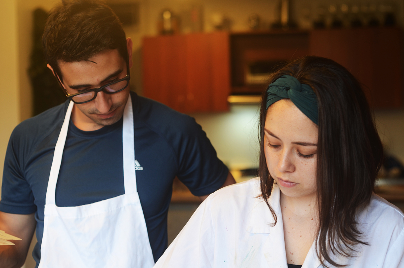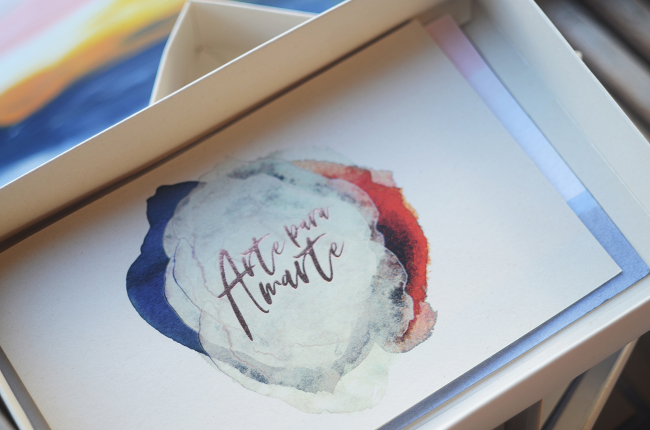 Aunque ella es la que pinta, la artista; él es el apoyo incondicional, el que la ayuda todo el tiempo. Él mezclaba colores, ella los volvía cielo. Él terminaba de armar las cajas que ella doblaba. Él metía las tarjetas cuidadosamente y les echaba el aroma cítrico, ella escribía una nota personalizada para cada invitado. Un proceso de dos. Un mes y medio. 220 invitados. 140 cajas. 140 obras de arte. 140 muestras de amor.