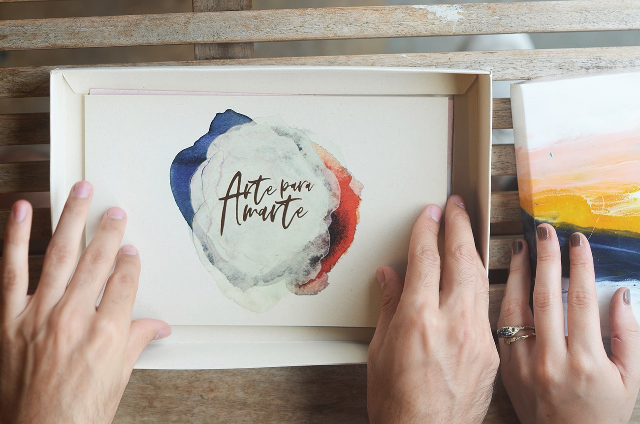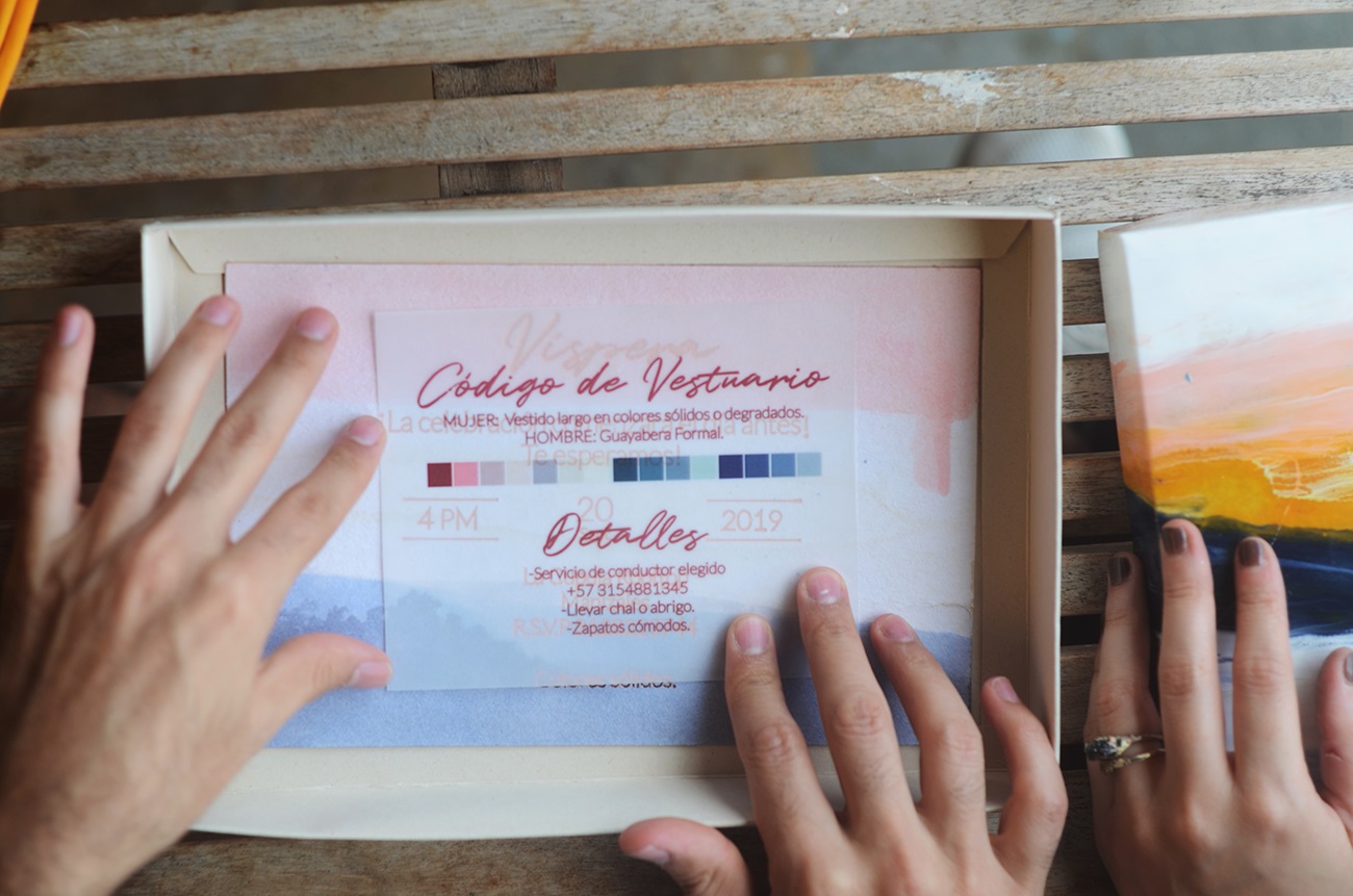 Para las invitaciones, quisieron algo especial, algo que sin palabras les dijera a cada una de las personas lo importantes que son, la buena compañía que significan, el cariño que les tienen. Lo lograron: la invitación es una caja en Earth Pack pintada en acrílico con resina, que semeja un lienzo; que parece el mar con un cielo atardecido. Una obra. Dentro, se encuentran una pieza tejida en macramé que se puede usar como llavero y tres tarjetas teñidas: la del nombre, Arte para Amarte; la de los detalles, que explica la gama de colores para el vestuario, la fecha, la hora y otras especificaciones; y la de la víspera, que invita a una reunión el día antes en La Cúpula, un rooftop de Manizales.