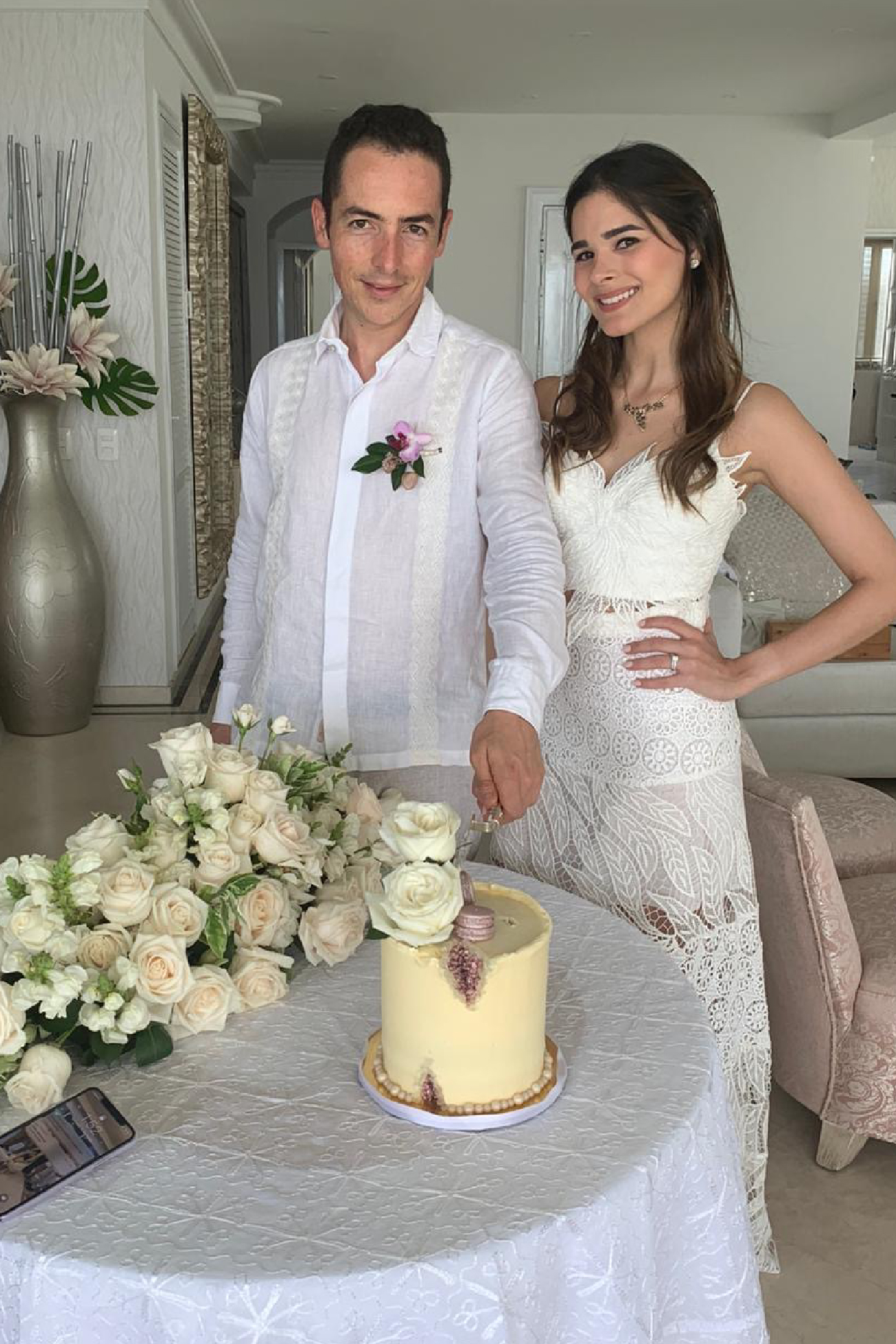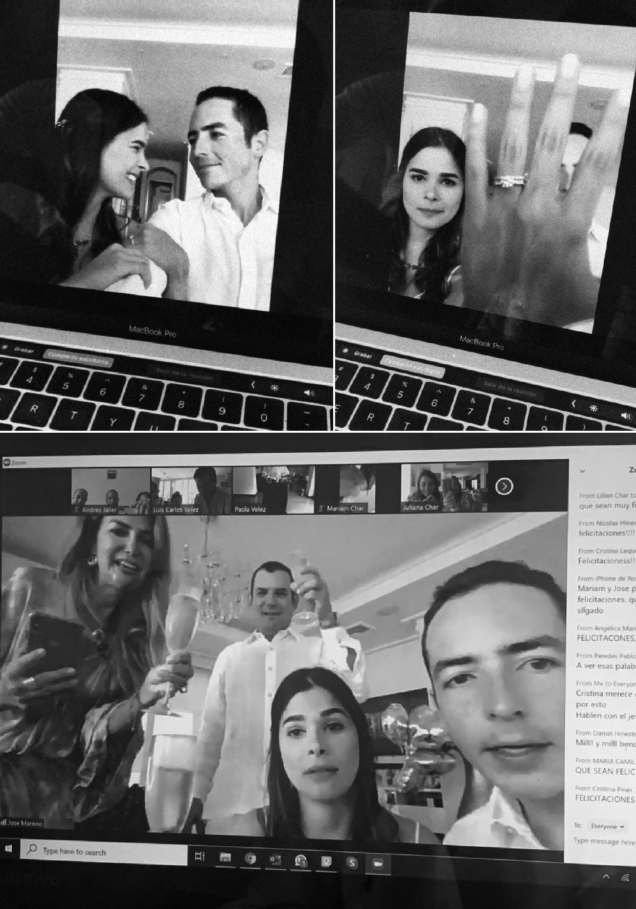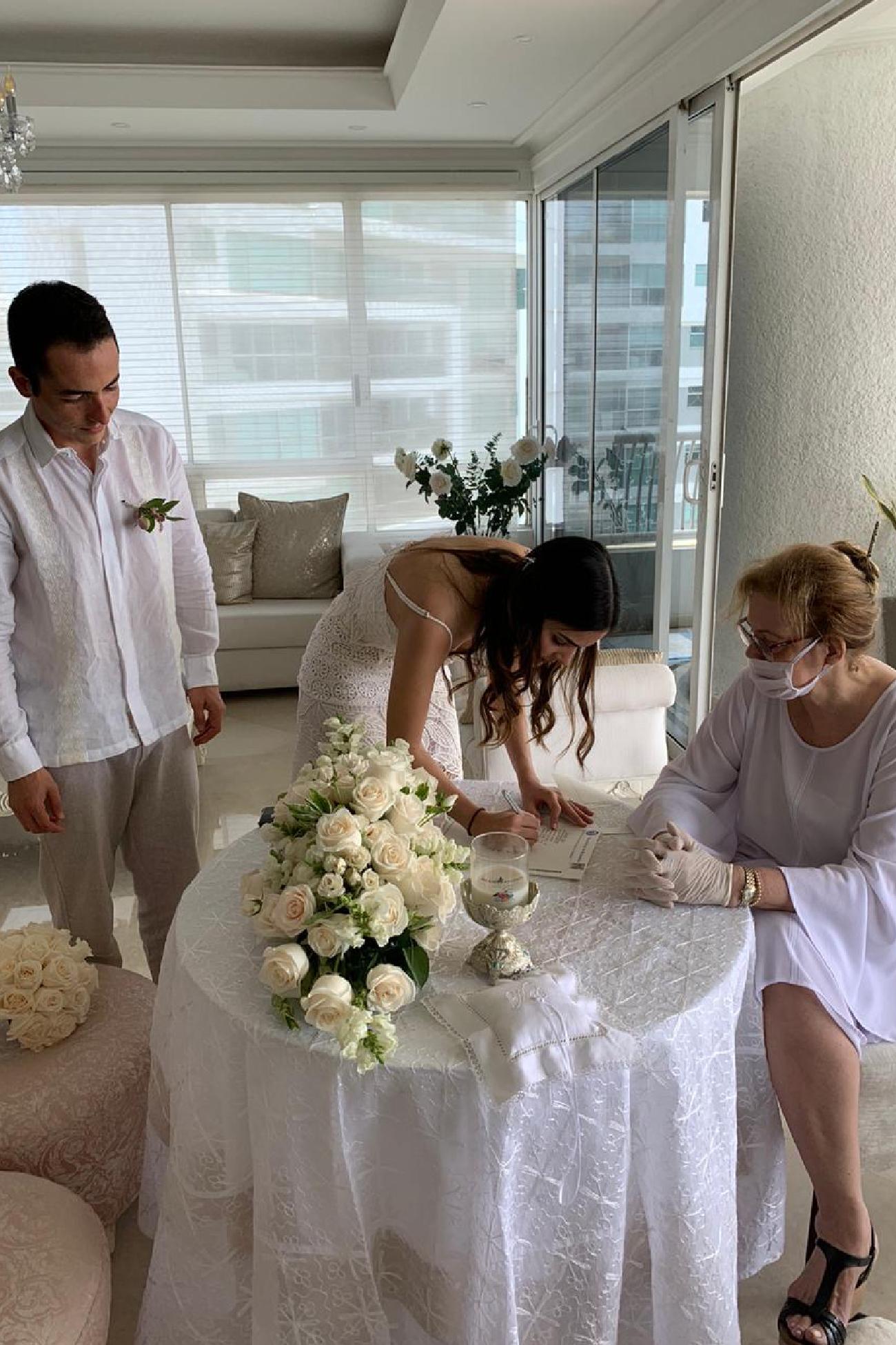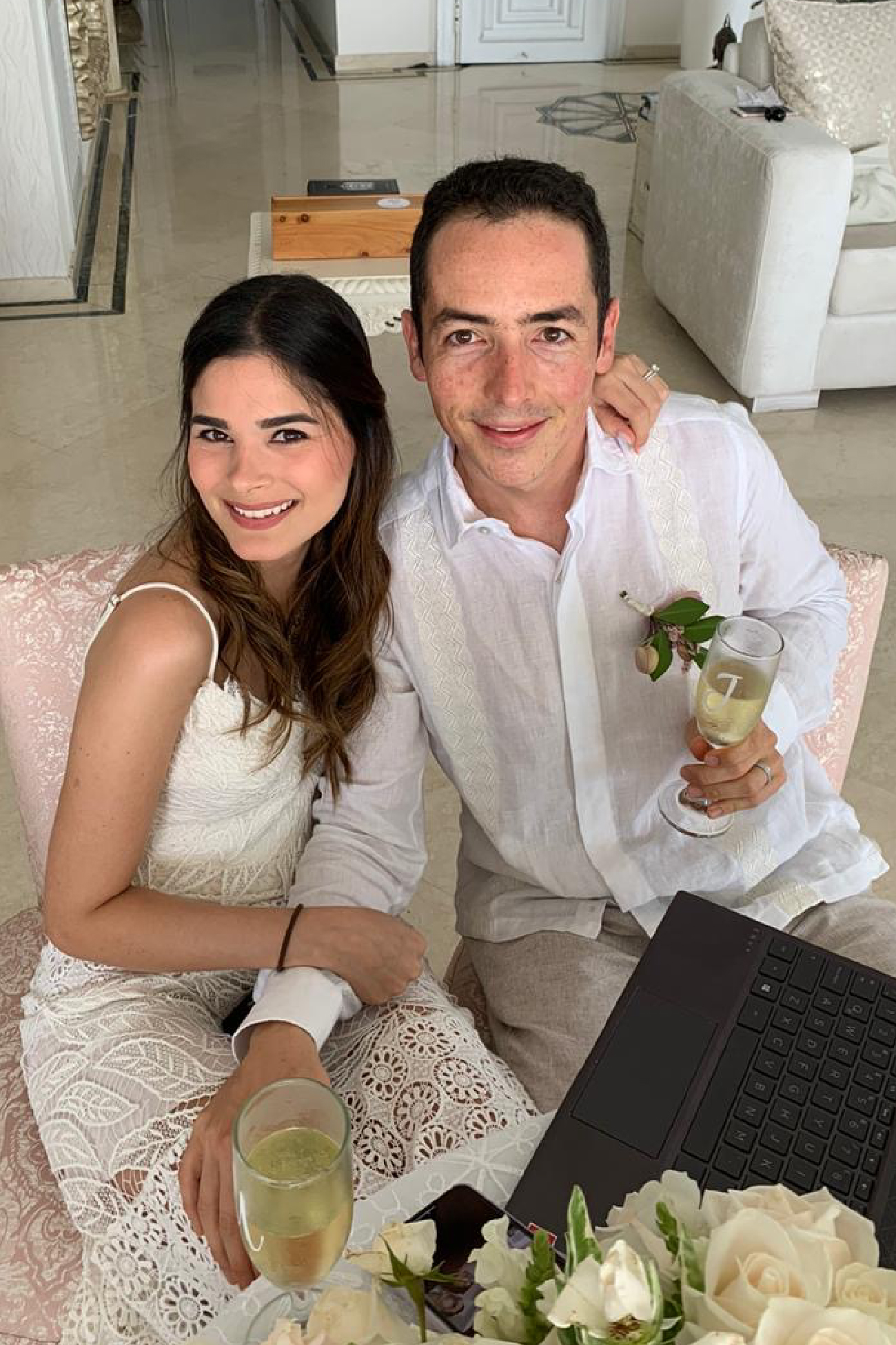 FECHA: mayo 2 de 2020. HORA: 11:30 a.m. CIUDAD: Cartagena. LUGAR: casa de Mariam. NÚMERO DE INVITADOS: 250 usuarios en Zoom. WEDDING PLANNER: Mary Cueter. FOTOGRAFÍA: la mamá de ella. VESTIDO DE LA NOVIA: Goretty Medina. ZAPATOS DE LA NOVIA: Aquazurra. ACCESORIOS DE LA NOVIA: accesorios de la abuela. MAQUILLAJE Y PEINADO: Mariam Char. COMIDA: Adriana Santos. POSTRES: Samara Rabah Patisserie y La Pastelería by Natalia Martínez. FLORES: Viva Flor y Juliana Solano Char. DECORACIÓN: Juliana Solano. RAMO: floristería Al Ala. ANILLOS: VEO Jewelry.