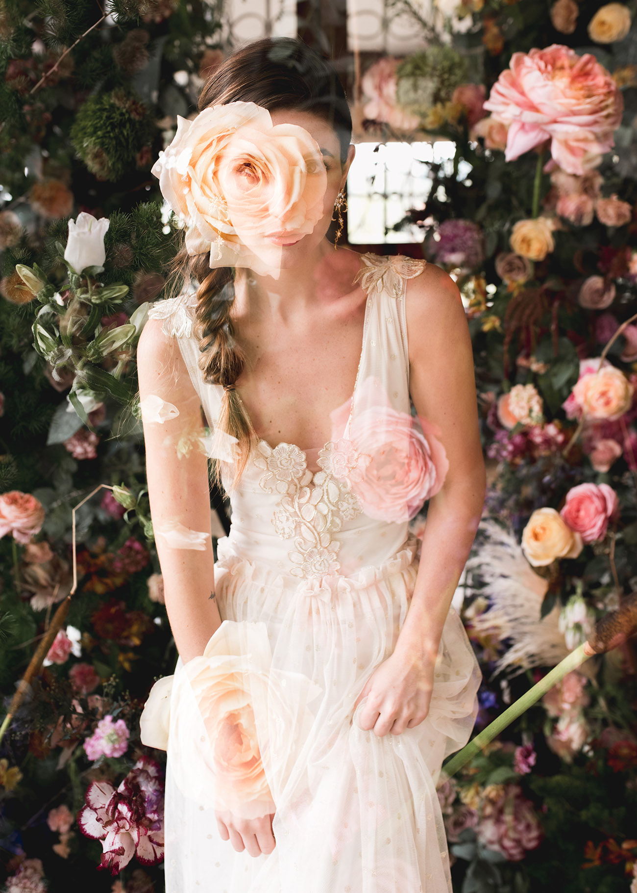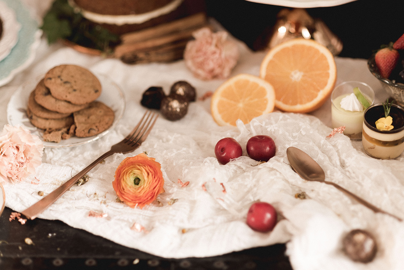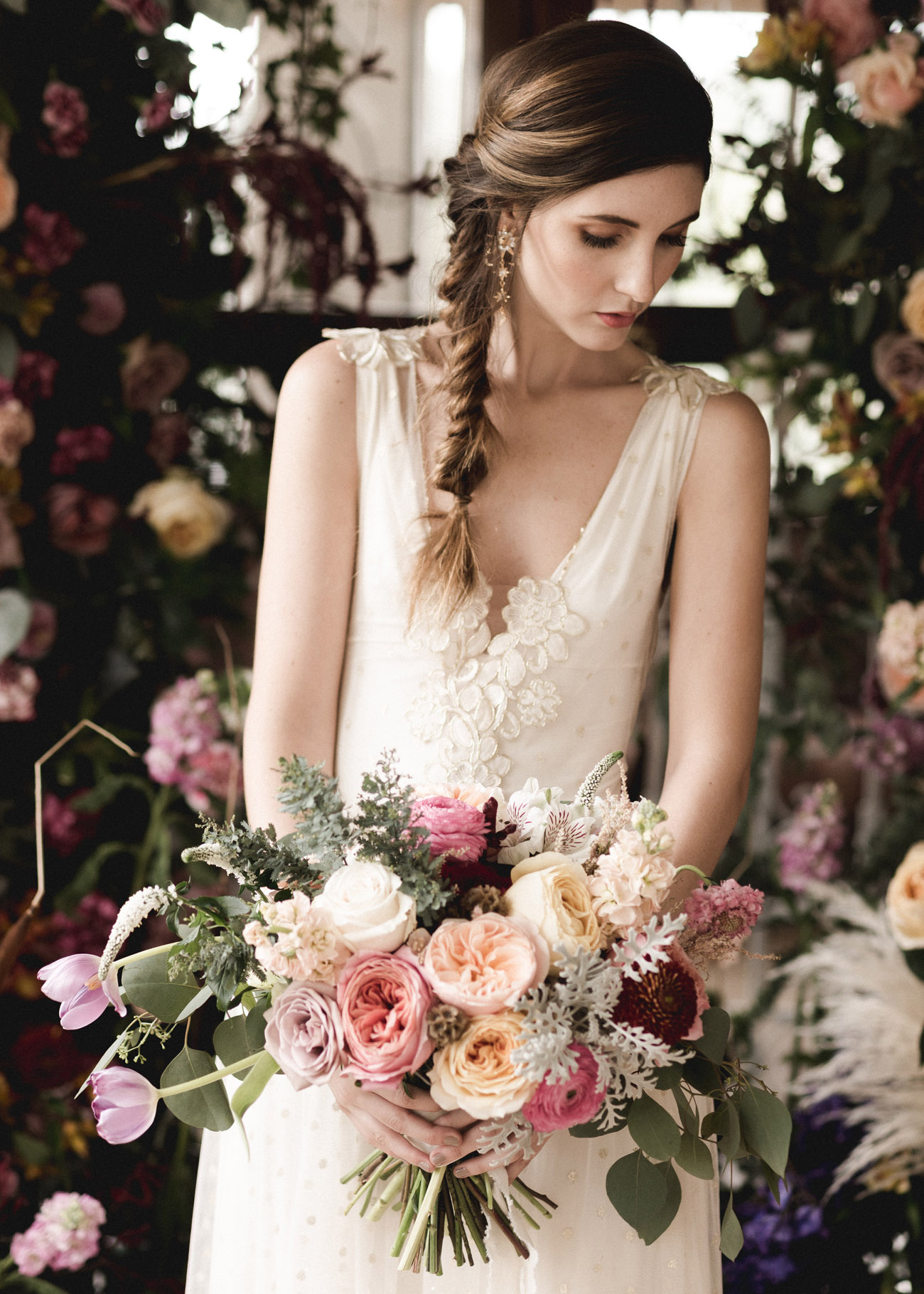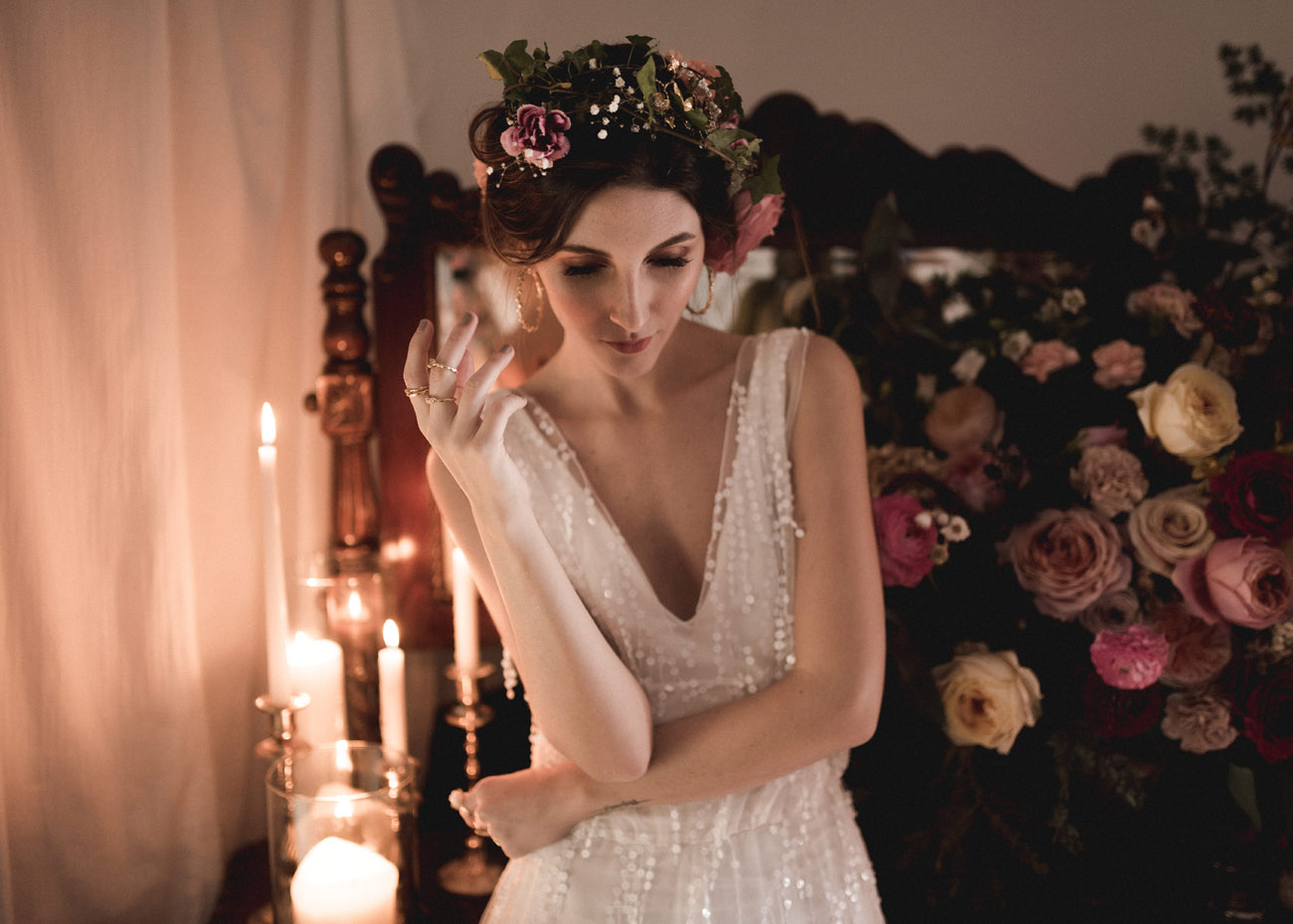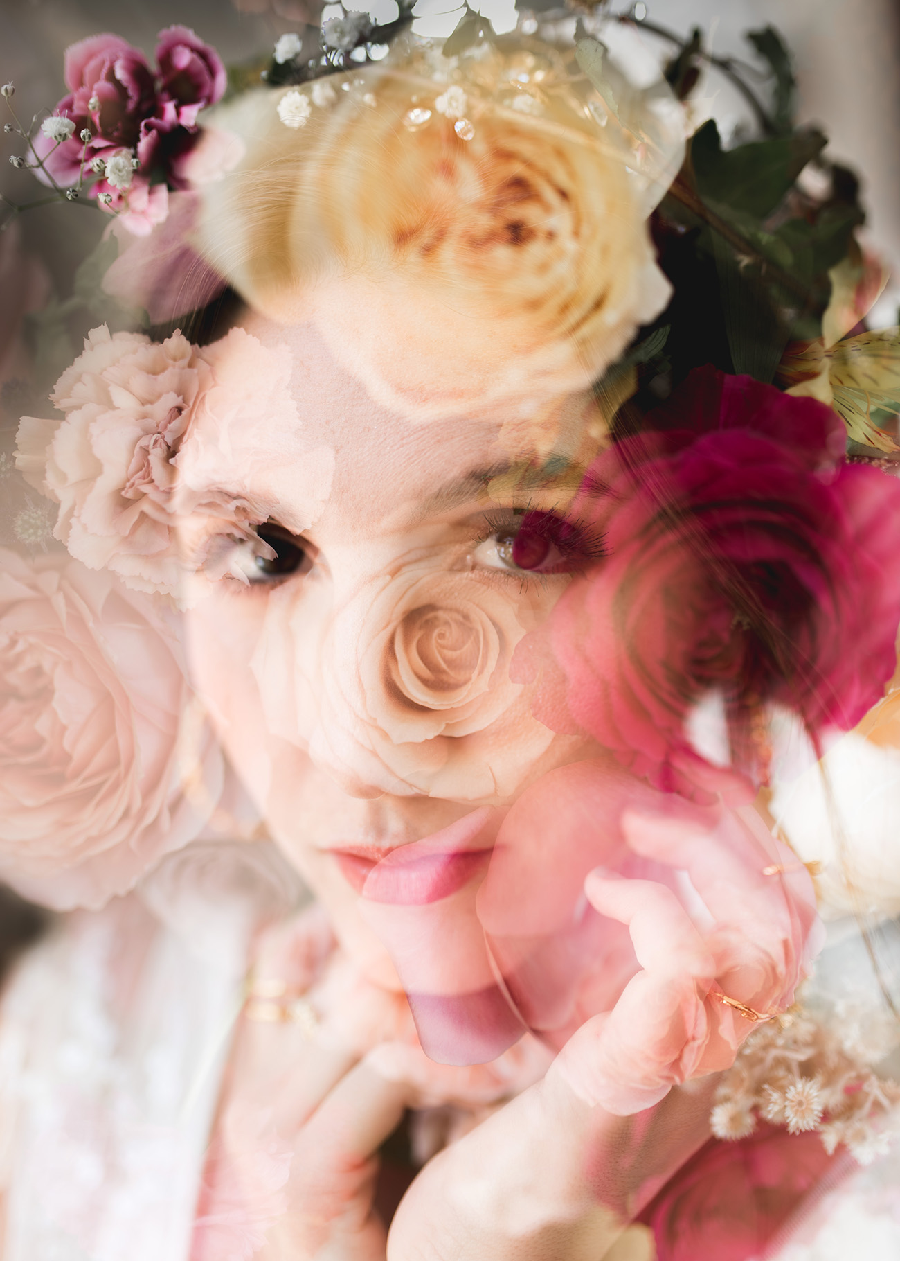 Flores en primer plano. Muy cerca. Claveles, rosas, ranúnculos, tulipanes, Verónicas. Flores entre dulces, entre frutas, entre velas. Flores que se lucen por igual entre luces y sombras. Entre la naturalidad del día y el misterio de la penumbra. Flores para acompañar a una novia de aquí, pensada por proveedores locales, que parece bajada de un tablero de Pinterest. Flores que la rodean, que están en su cabeza, en sus manos, en su vestido, en sus accesorios. Que también podrían estar en su altar, en su ceremonia, en su mesa de tortas y postres, en sus centros de mesa. Flores para una novia romántica, etérea, amante de la naturaleza, de lo orgánico, de la frescura y belleza de lo simple.