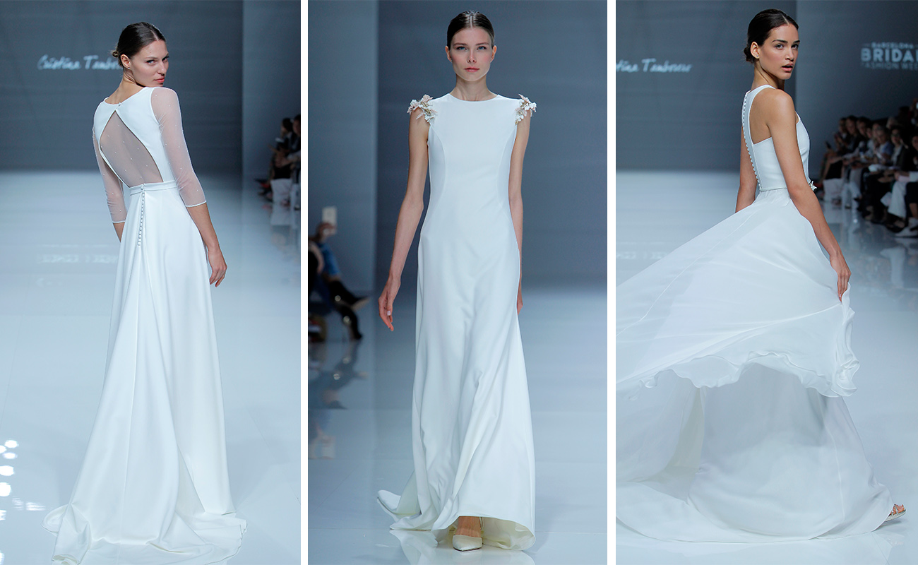 Lo bonito de esta colección es la naturalidad en sí misma. En los vestidos de Cristina Tamborero, diseñadora revelación de la moda nupcial en España, hay una estética minimalista con los detalles precisos para llamar la atención. Cortes geométricos y líneas rectas, algunos de ellos acompañados por flores modernas. De ahí el nombre de la colección, Hanami, inspirada en la tradición nipona de observar la belleza de las flores, en especial los árboles de cerezos, que florecen en los parques y jardines japoneses.