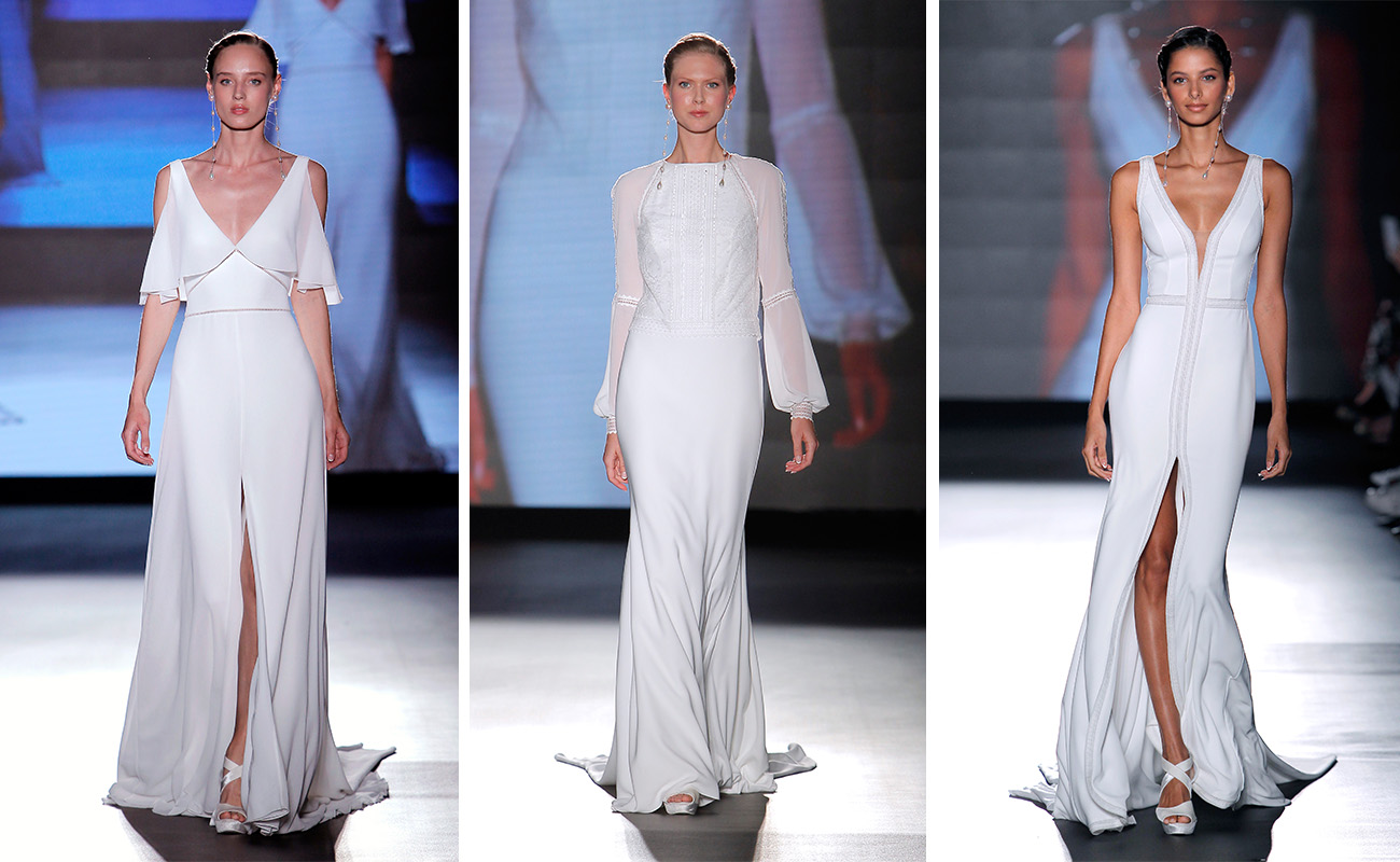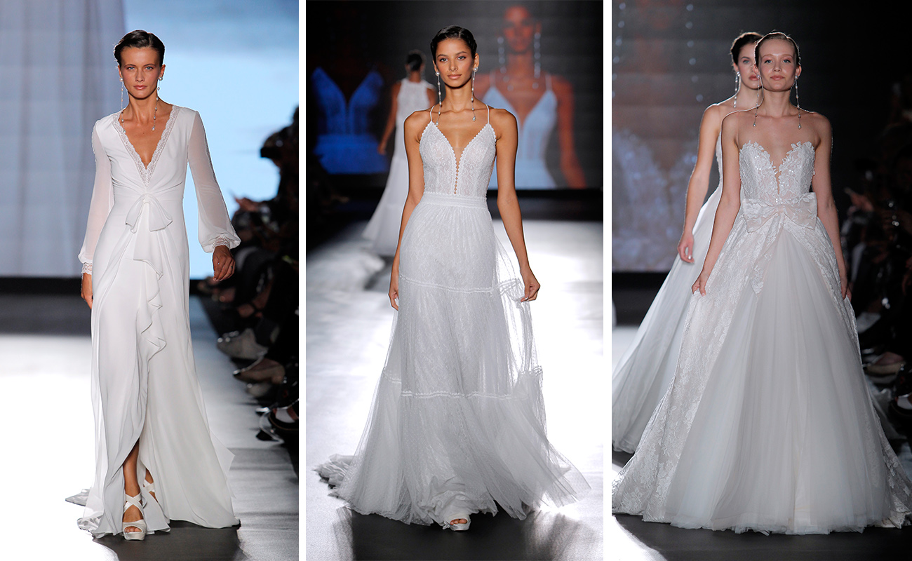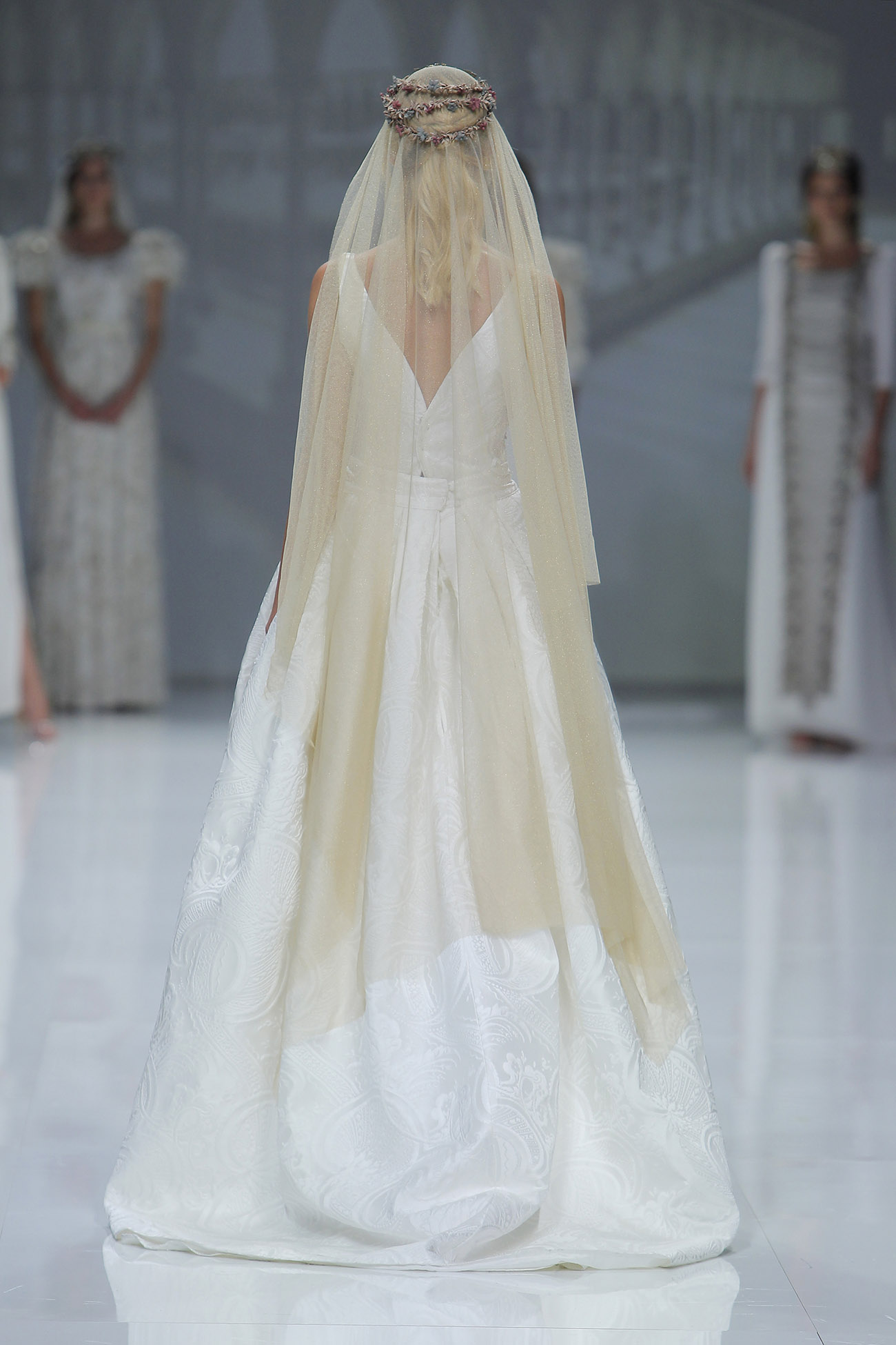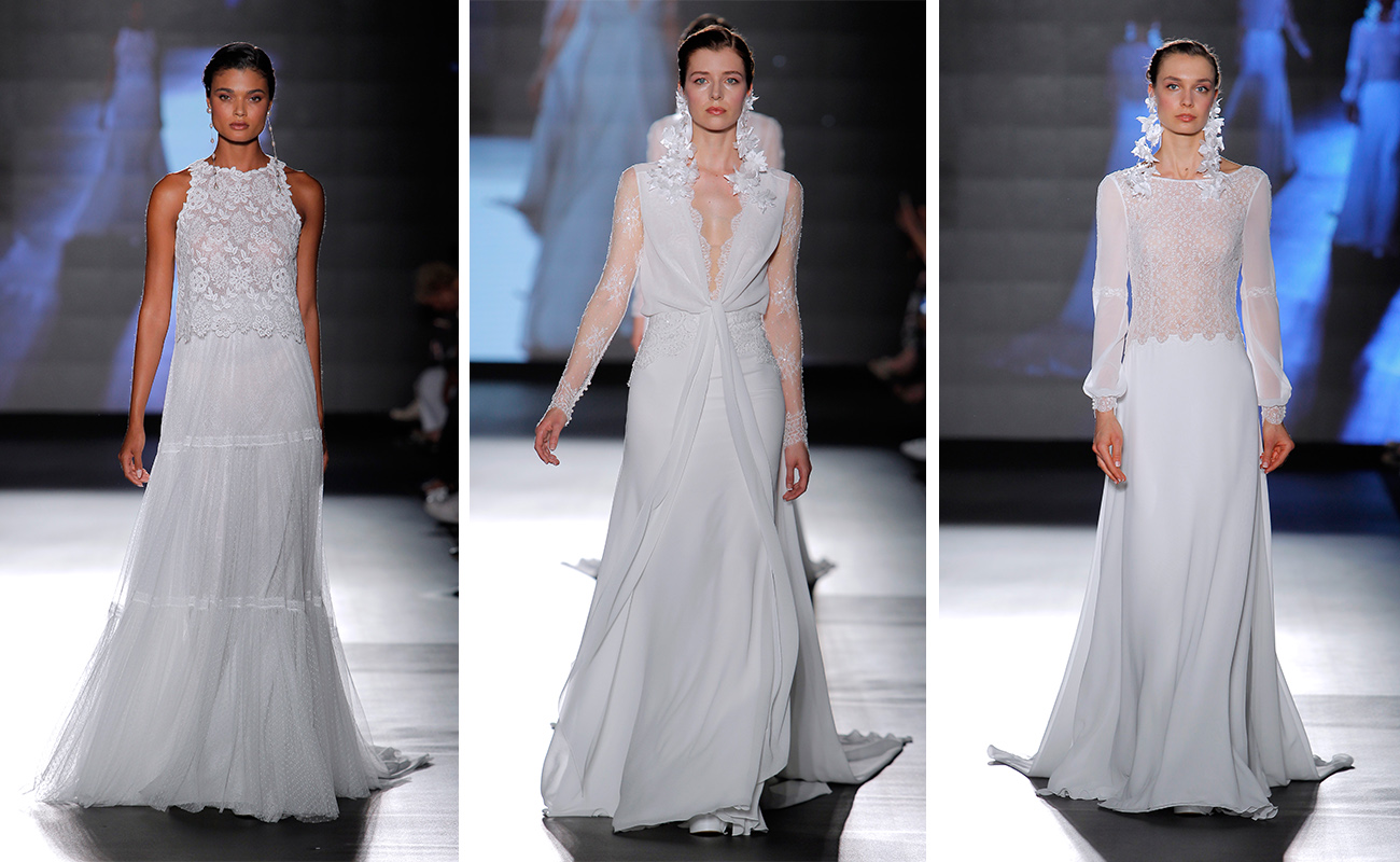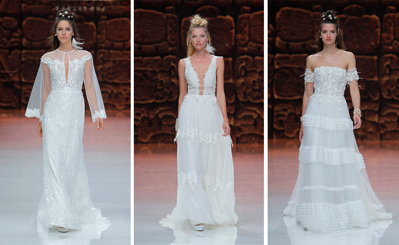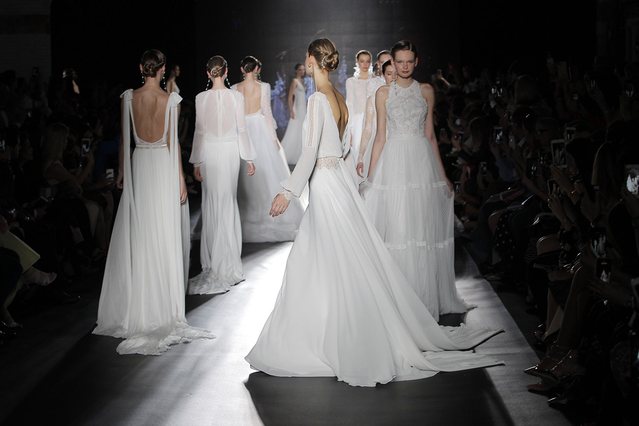 Diseños sofisticados y femeninos aparecen majestuosos entre cientos de espectadores de todas partes del mundo. Vestidos muy trabajados, la mayoría de ellos con apliques florales a lo largo y ancho. Escotes ilusión, la clásica silueta en A, favorable para todos los cuerpos, transparencias, bodys con falda sobrepuesta, piezas con corte princesa, grandes velos y capas en tul que recuperan el concepto de novia clásica.