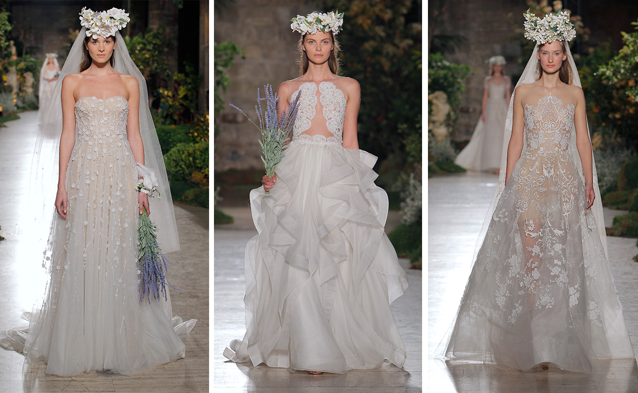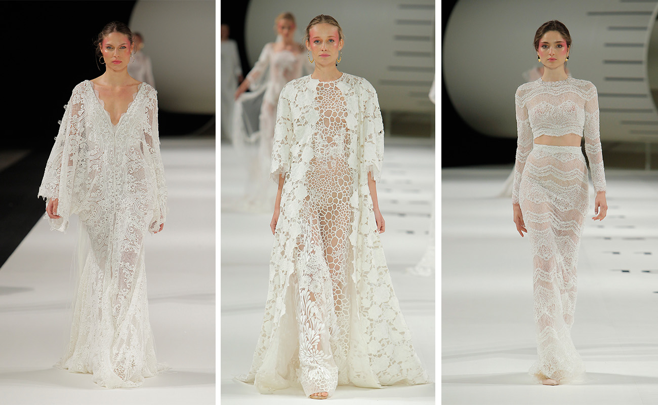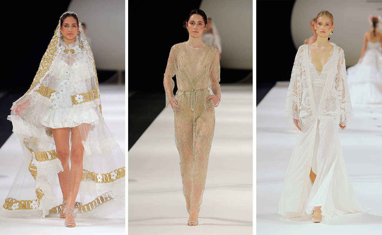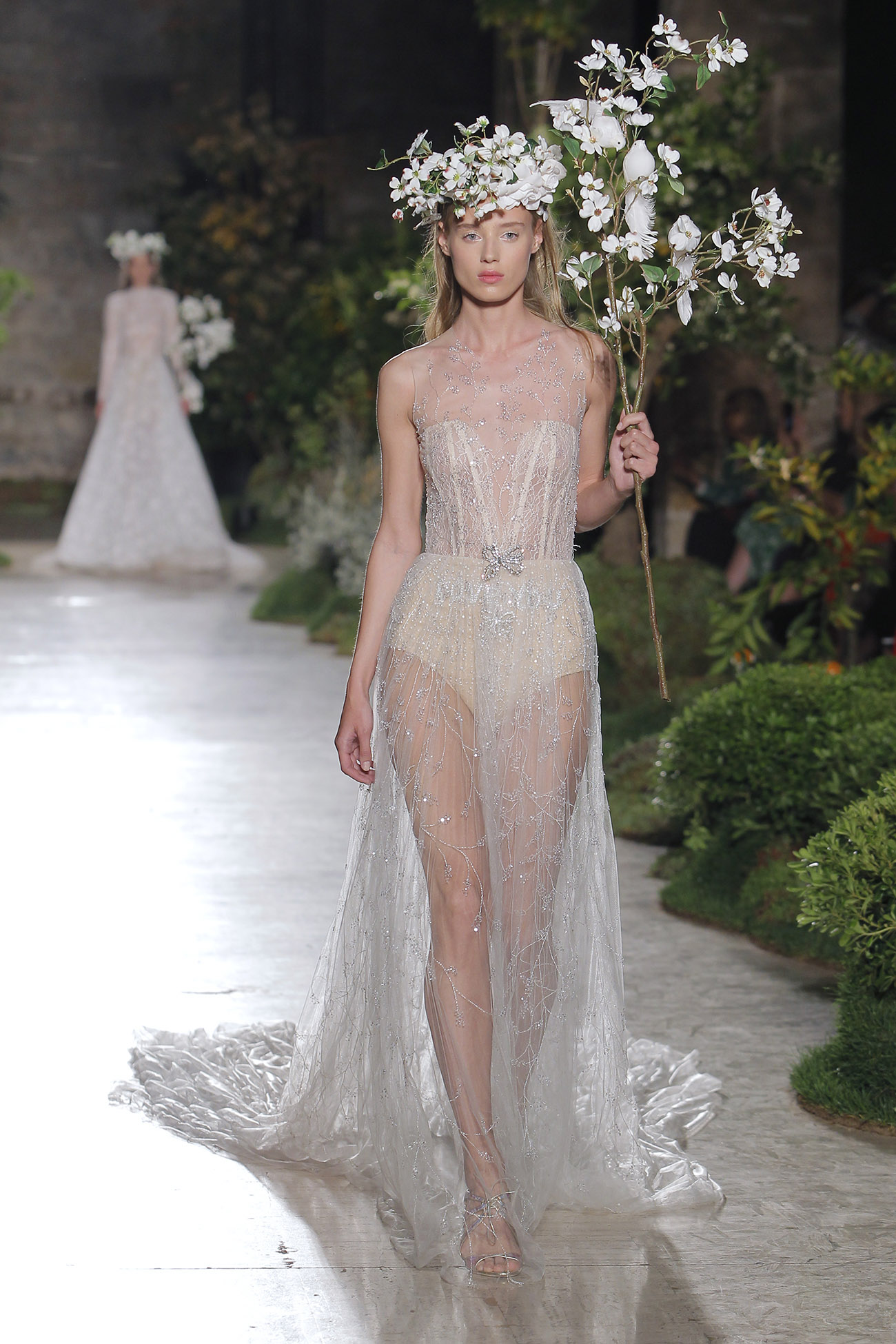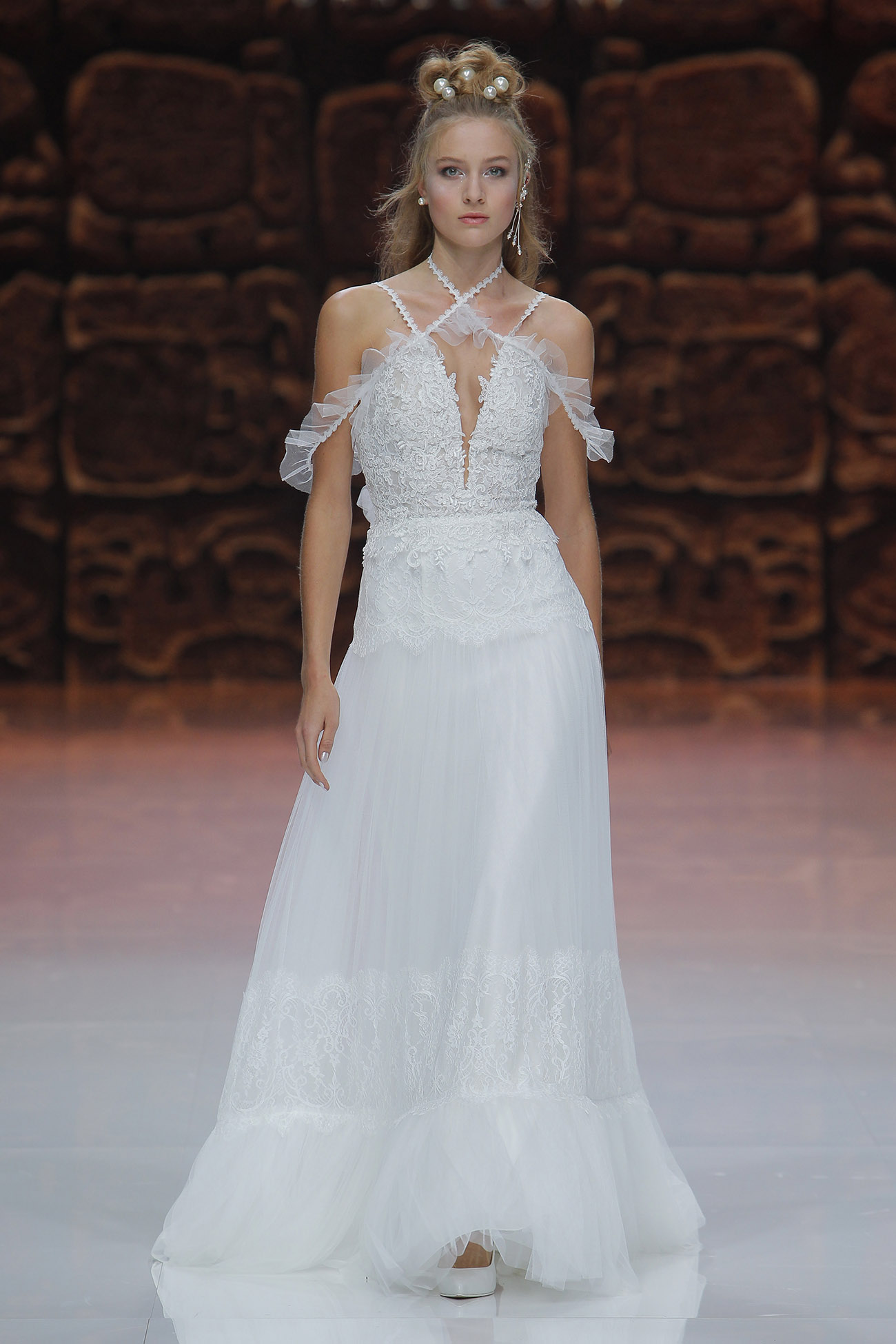 Diseños sofisticados y femeninos aparecen majestuosos entre cientos de espectadores de todas partes del mundo. Vestidos muy trabajados, la mayoría de ellos con apliques florales a lo largo y ancho. Escotes ilusión, la clásica silueta en A, favorable para todos los cuerpos, transparencias, bodys con falda sobrepuesta, piezas con corte princesa, grandes velos y capas en tul que recuperan el concepto de novia clásica.