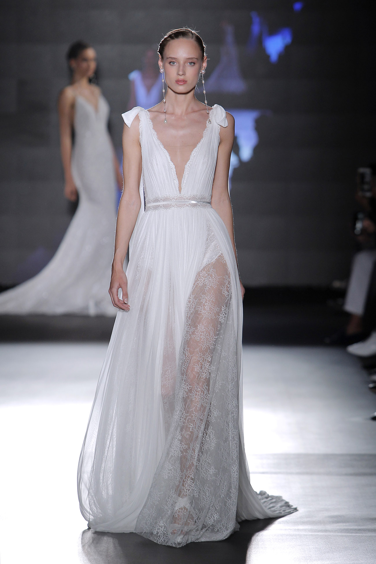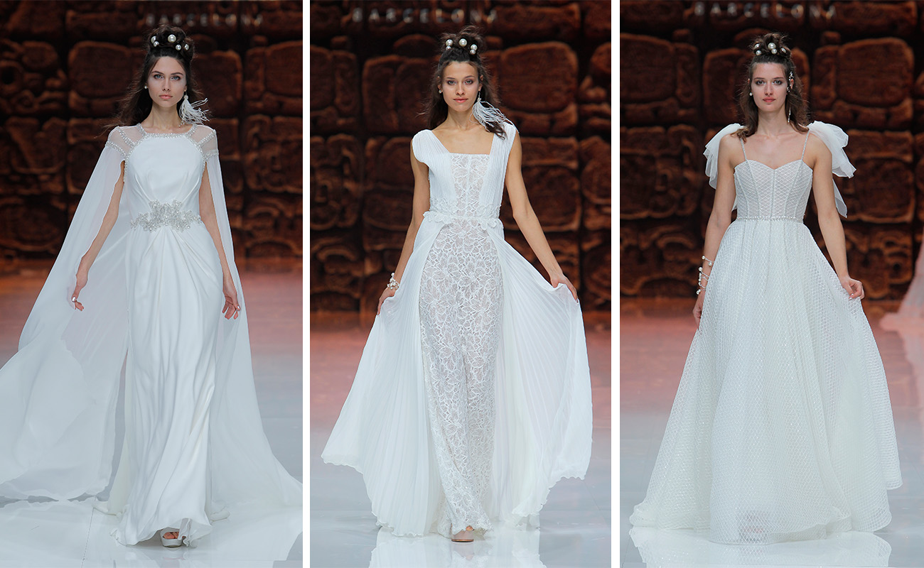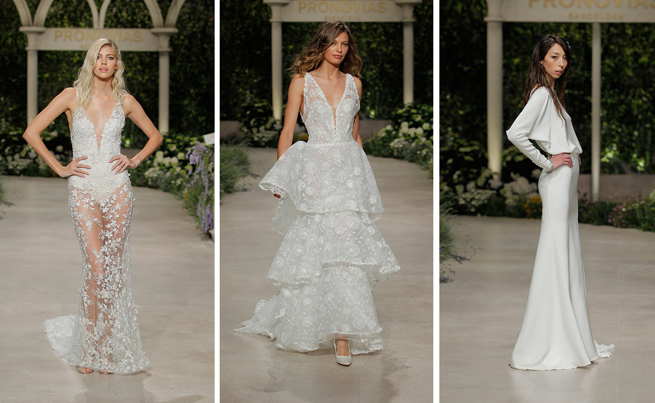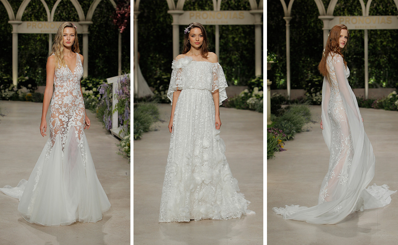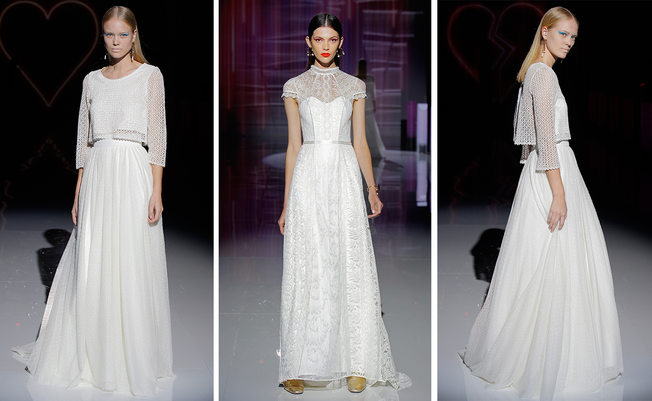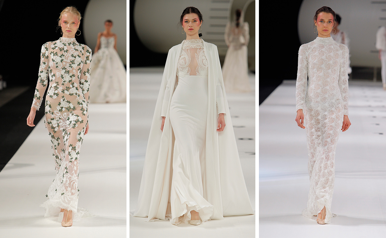 Diseños sofisticados y femeninos aparecen majestuosos entre cientos de espectadores de todas partes del mundo. Vestidos muy trabajados, la mayoría de ellos con apliques florales a lo largo y ancho. Escotes ilusión, la clásica silueta en A, favorable para todos los cuerpos, transparencias, bodys con falda sobrepuesta, piezas con corte princesa, grandes velos y capas en tul que recuperan el concepto de novia clásica.