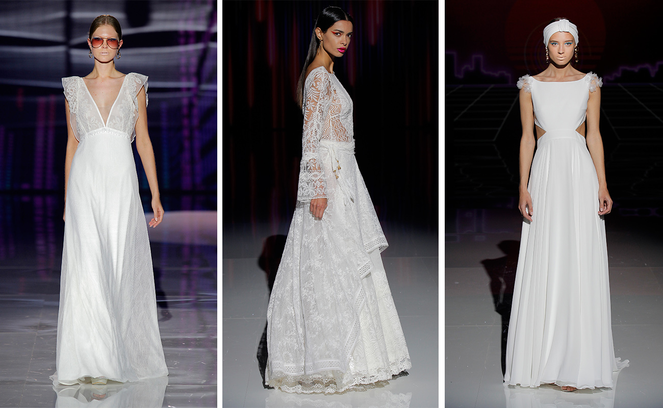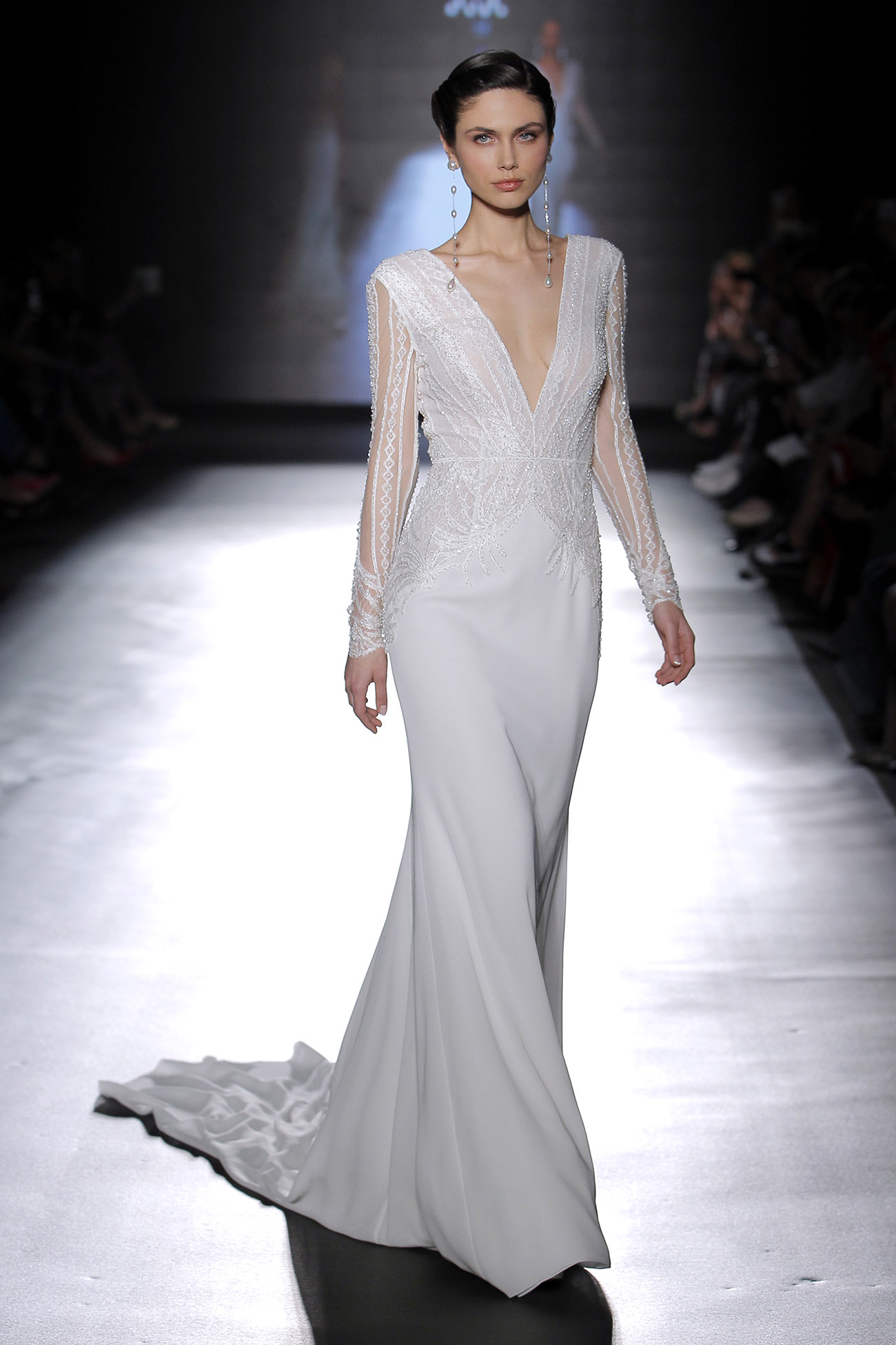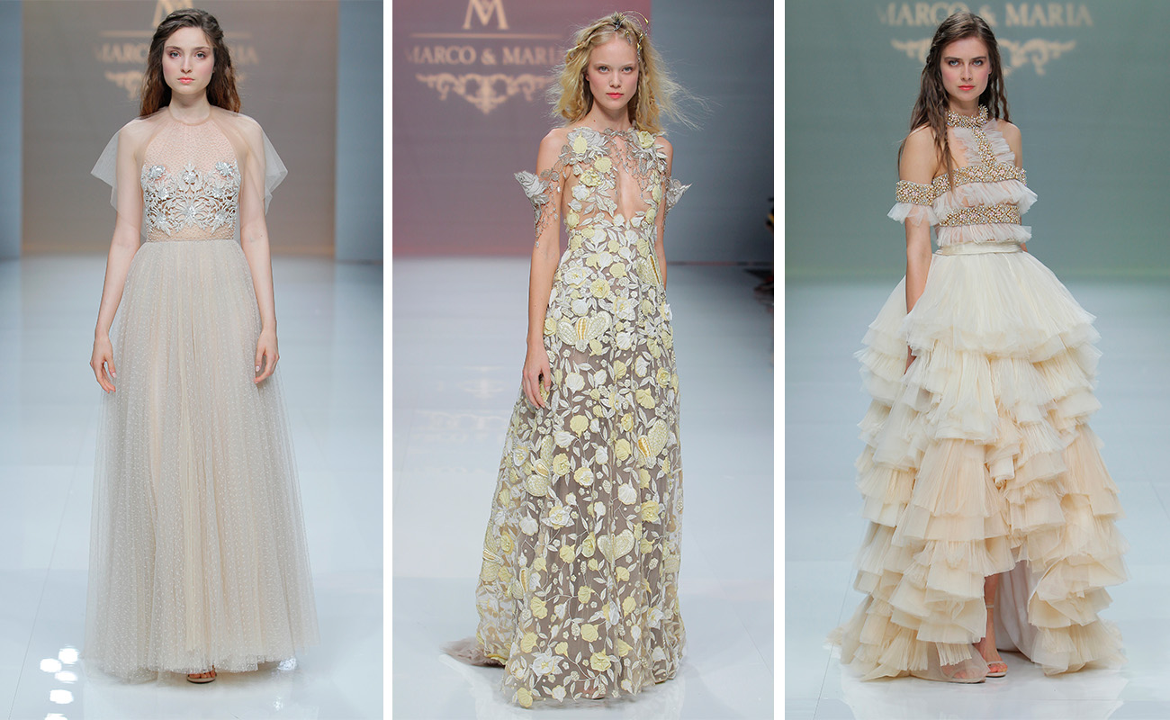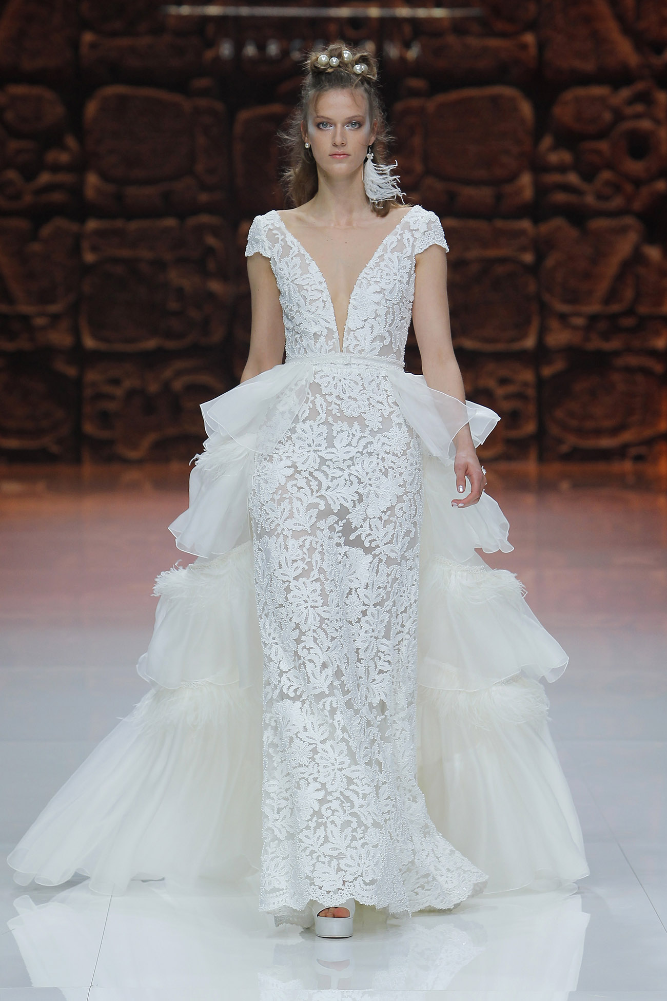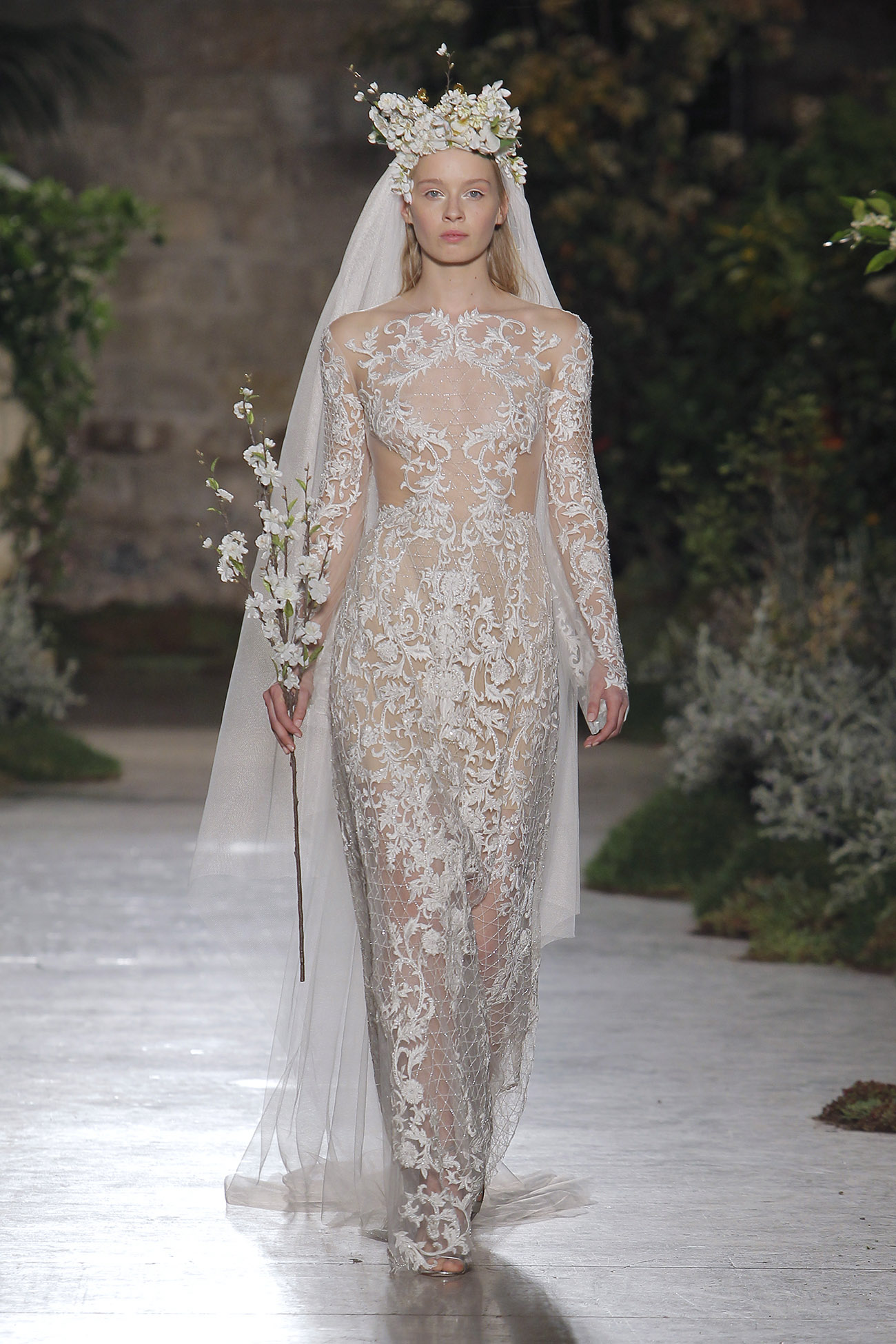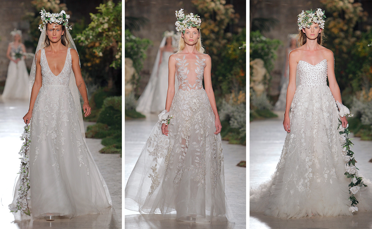 Diseños sofisticados y femeninos aparecen majestuosos entre cientos de espectadores de todas partes del mundo. Vestidos muy trabajados, la mayoría de ellos con apliques florales a lo largo y ancho. Escotes ilusión, la clásica silueta en A, favorable para todos los cuerpos, transparencias, bodys con falda sobrepuesta, piezas con corte princesa, grandes velos y capas en tul que recuperan el concepto de novia clásica.
