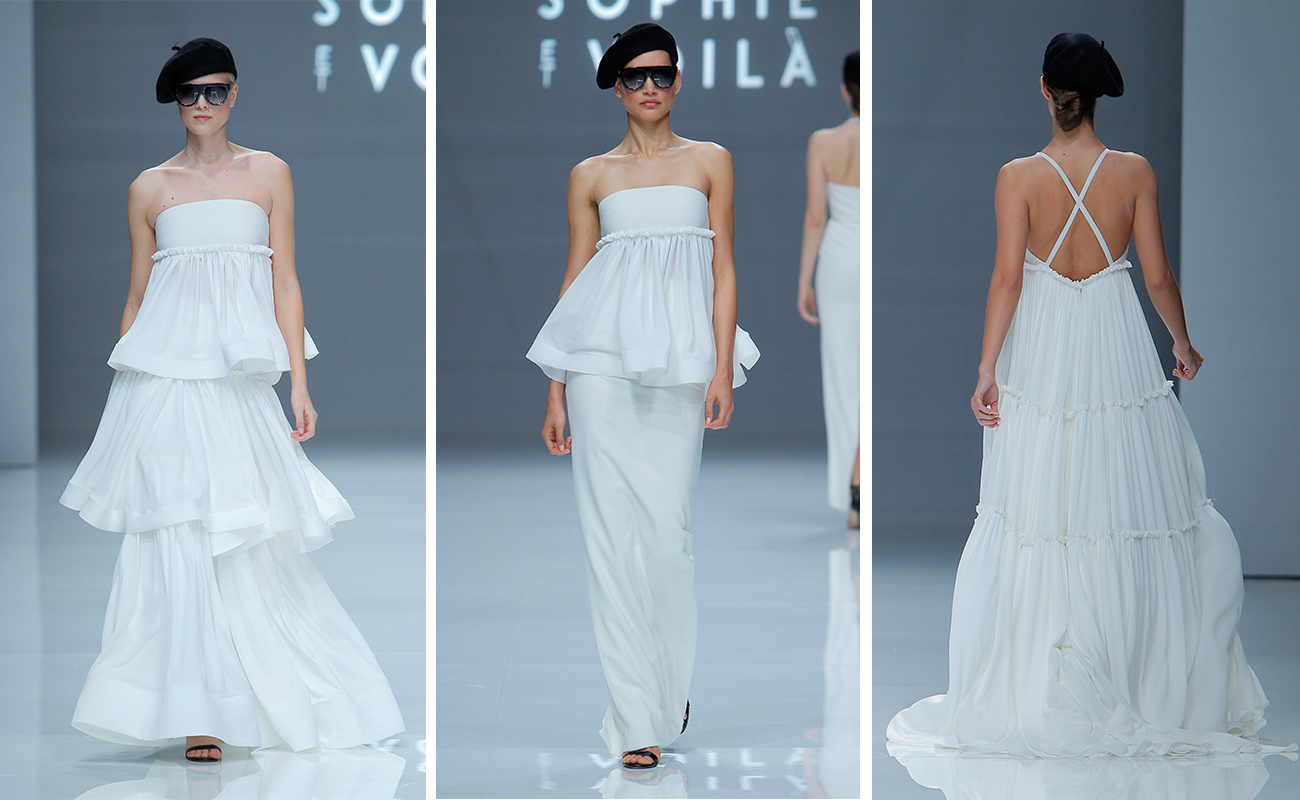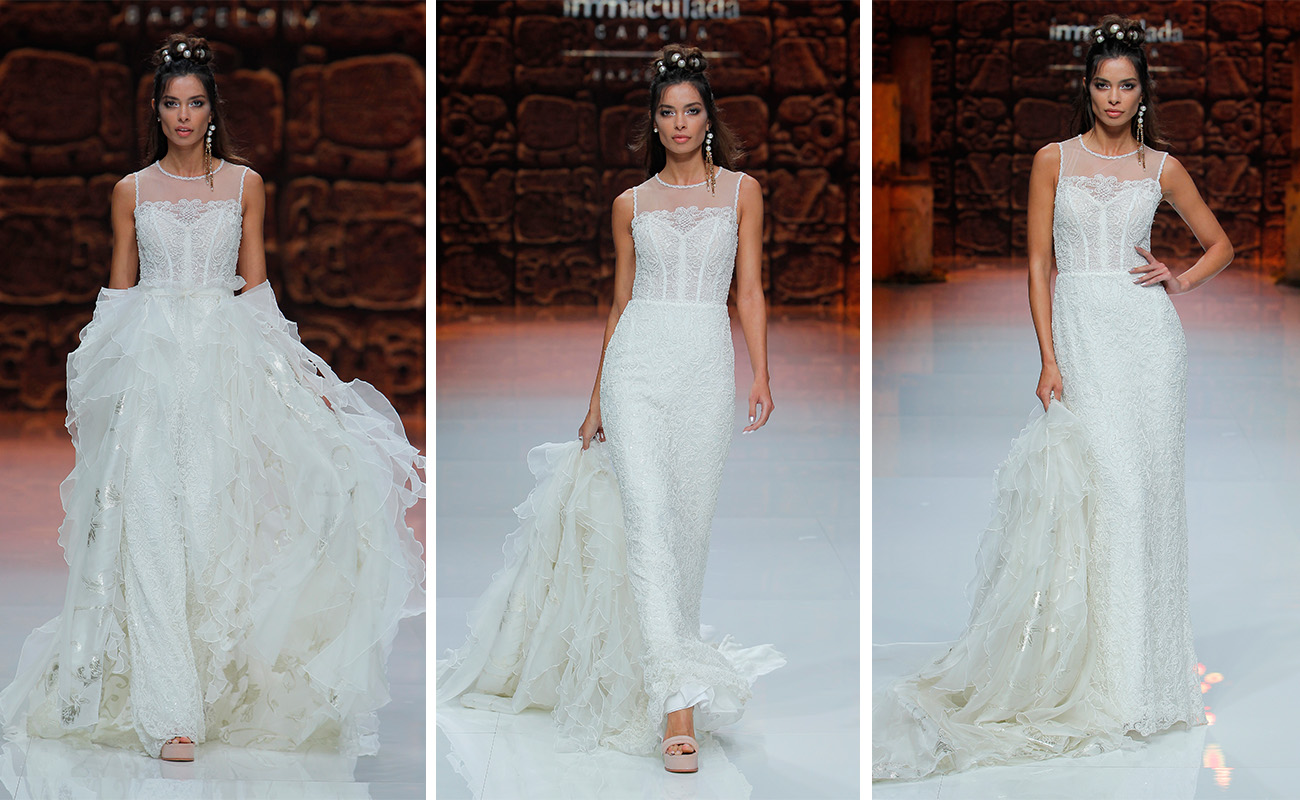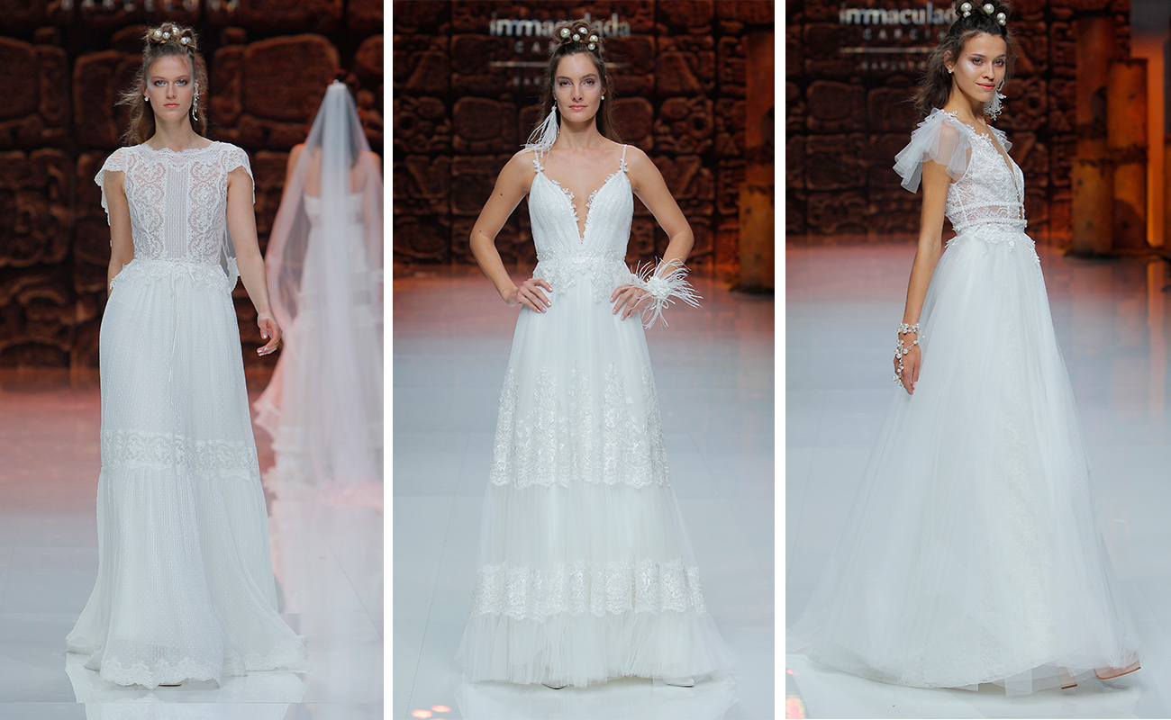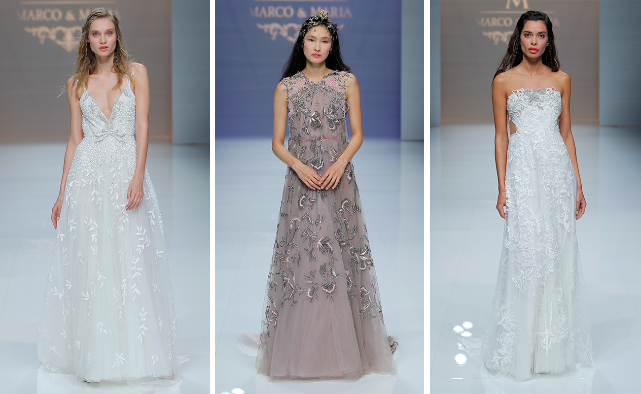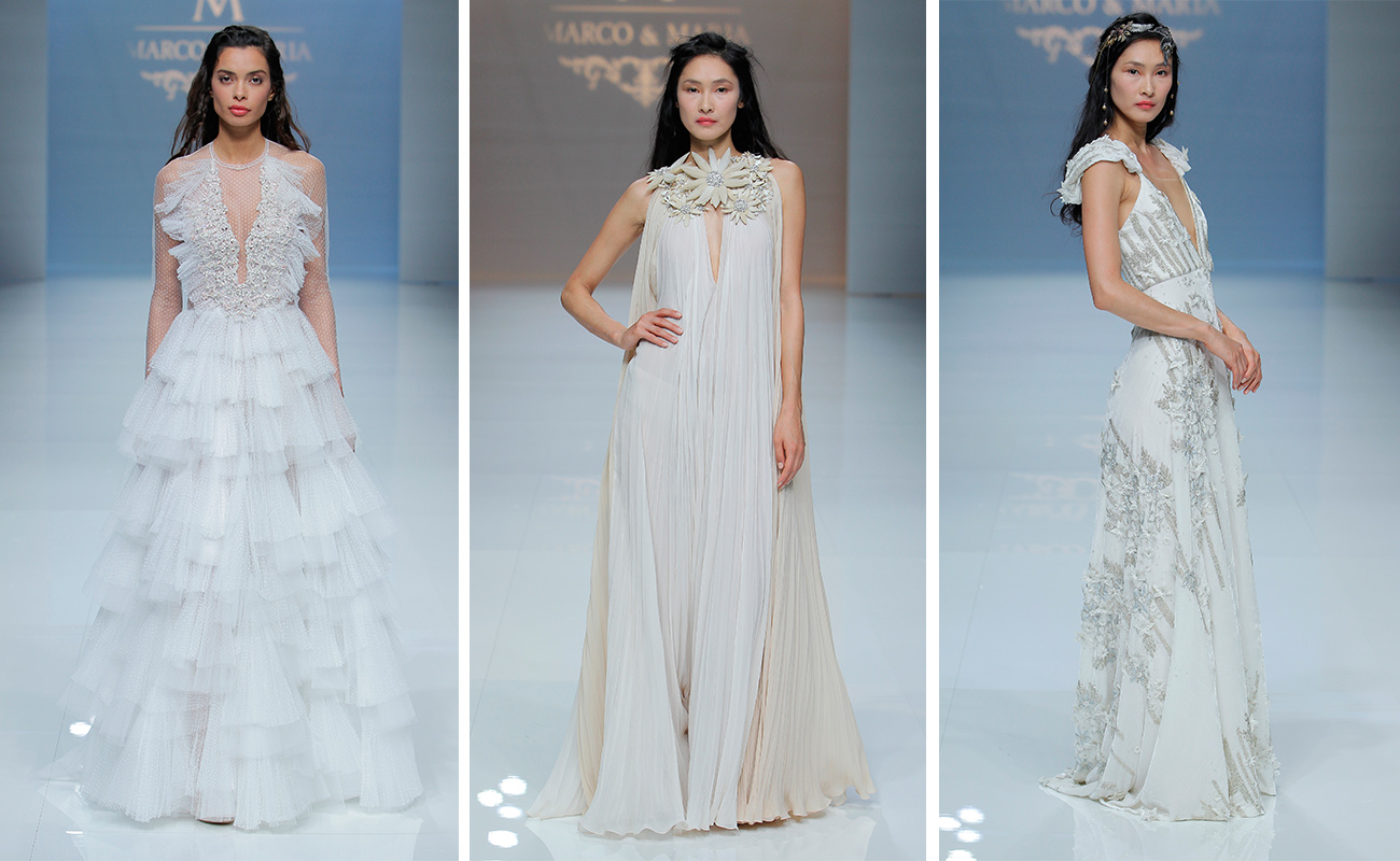 Diseños sofisticados y femeninos aparecen majestuosos entre cientos de espectadores de todas partes del mundo. Vestidos muy trabajados, la mayoría de ellos con apliques florales a lo largo y ancho. Escotes ilusión, la clásica silueta en A, favorable para todos los cuerpos, transparencias, bodys con falda sobrepuesta, piezas con corte princesa, grandes velos y capas en tul que recuperan el concepto de novia clásica.