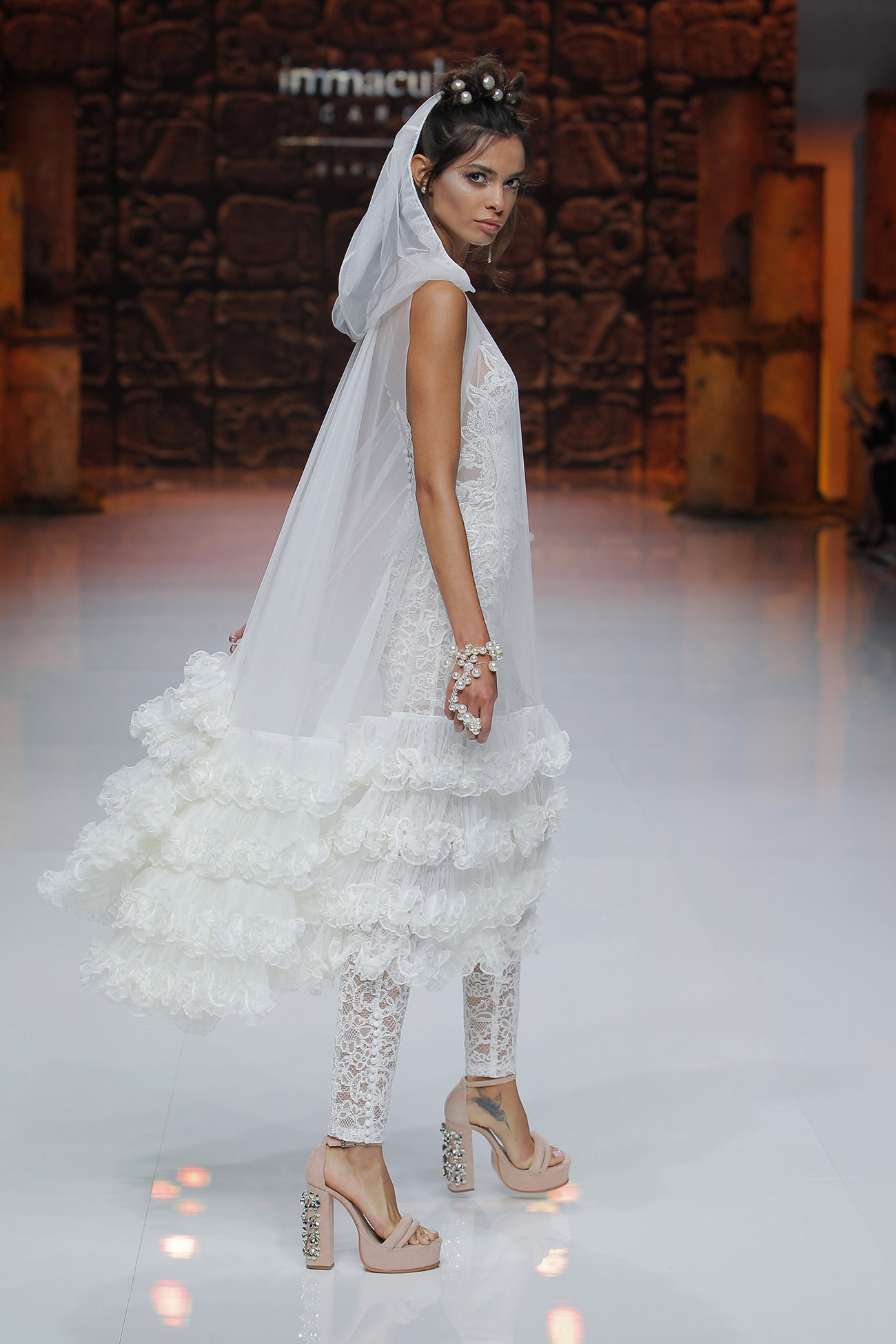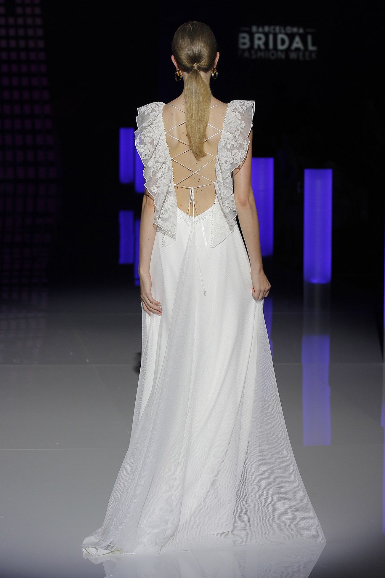 Hay canciones que siempre me van a recordar este desfile. Invisible, de Malú. Y Yo contigo, yo conmigo, de Morat y Álvaro Soler. Quizás porque no las conocía y me gustaron. Quizás por la energía tan bonita que despertó en mí mientras marcaban el paso de cada modelo sobre la pasarela. Volver a lo simple, a esa sencillez que nos recuerda que a veces no hace falta nada para tenerlo todo. Esta colección, inspirada en la diosa maya IX Chel, vuelve a la esencia de la novia con vestidos más personalizados en diseños limpios, algo más clásicos y con sencillez en el patrón; sutiles y elegantes. Siempre voy a recordar este desfile por su música, claro, pero también por sus piezas. Cercanas, ligeras, fluidas. Los Stories de mi cuenta de Instagram se llenaron de punticos y medio colapsaron porque quería publicar todas las fotos y los videos. Inmaculada García, dentro de mi top 5. Una elección muy, muy personal. ¡Bravo!