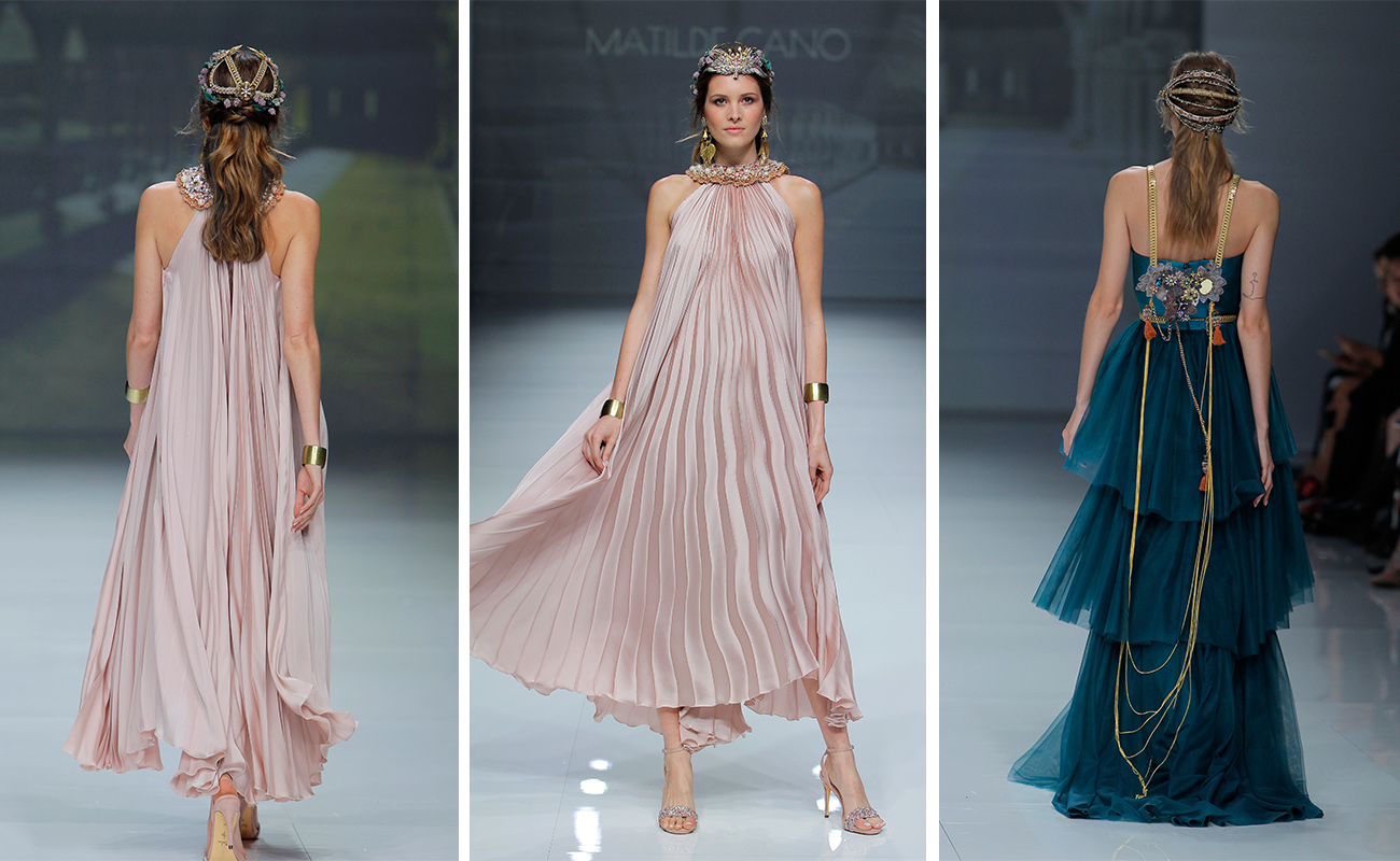 Me encanta ver cómo los complementos adquieren gran importancia en la industria. Por eso, aunque estamos hablando de vestidos de novia, y no de invitada, traigo a esta lista un par de propuestas de Matilde Cano. Coronas doradas medievales, cinturones en las caderas o aretas grandes que aportan toques de luz a cada una de las modelos que los lucen.