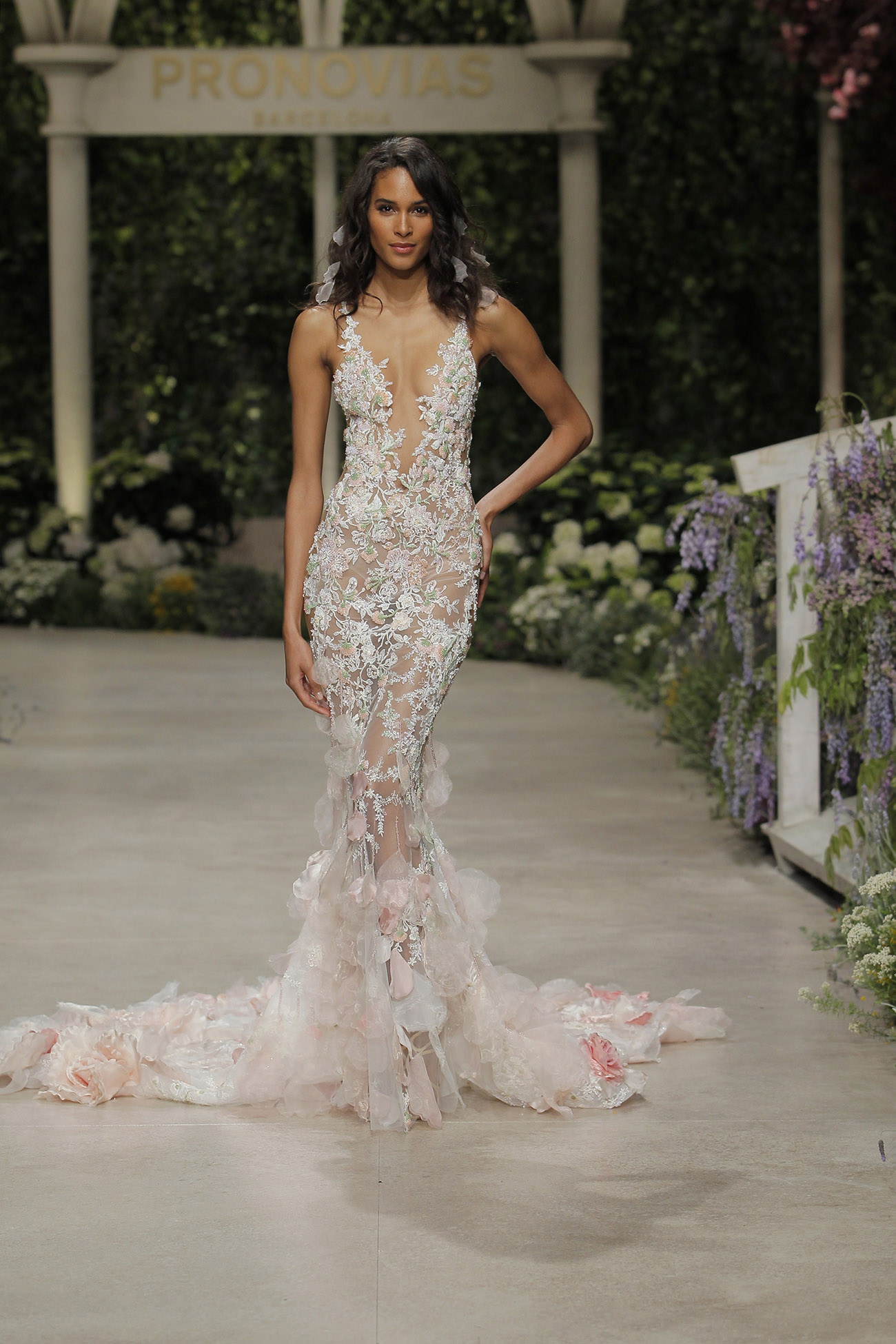 Con flores, de mil formas y colores. A esto se le llama empezar por lo alto. El Pabellón Italiano de la Fira se convirtió en un colorido jardín para el desfile inaugural de la feria. La firma nos trasladó a un escenario mágico con una propuesta que resalta la diversidad de los tejidos y las siluetas. Al ritmo de una melodía que reproducía los sonidos de la naturaleza, de la forma más bonita, desfilaron 45 vestidos de novia de la colección Pronovias Atelier 2019: In Bloom, delineados por su director, el francés Hervé Moreau.