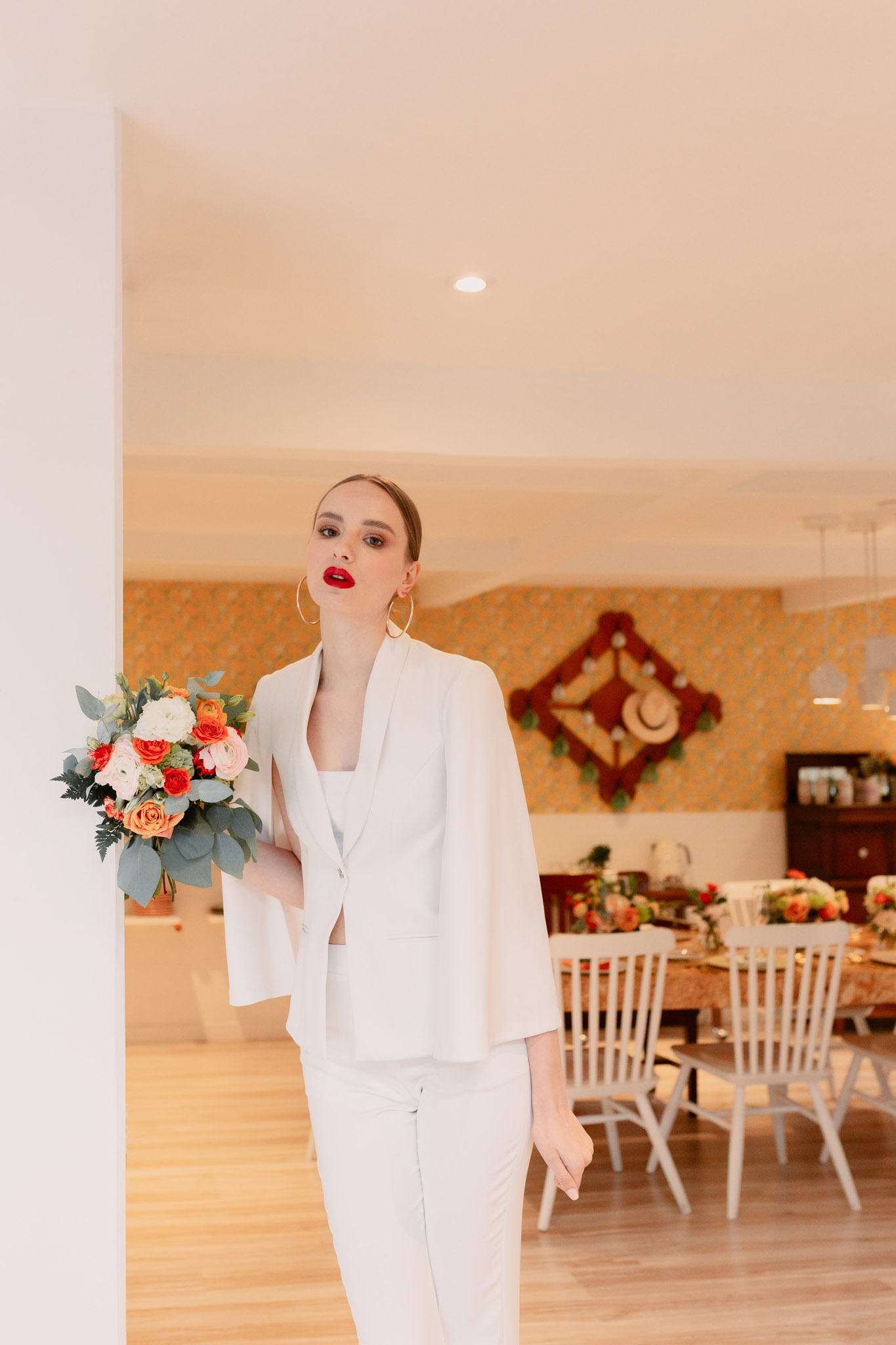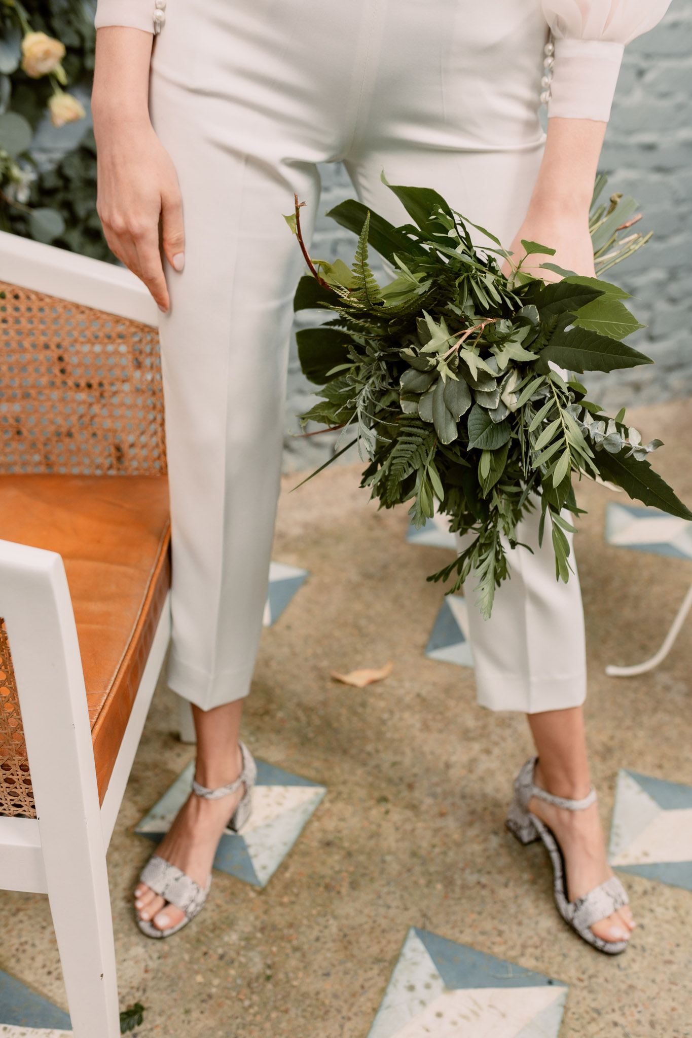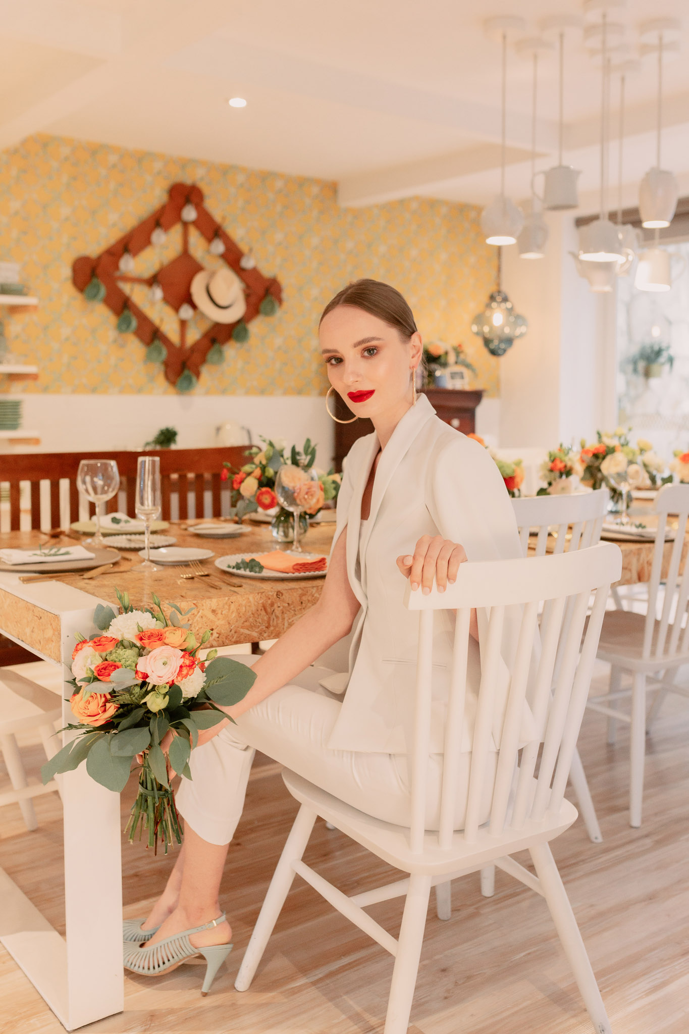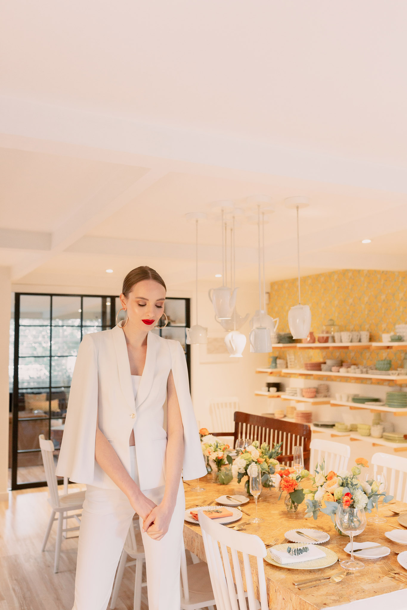 “La realidad es que muchas bodas se harán dentro de la ciudad. Estamos en una época transitoria de la humanidad que quedará en la historia. La moda, los espacios, los formatos, las necesidades han cambiado y evolucionado (moda entendida como todo lo que visualmente adaptamos a nuestro estilo). Hoy la prenda más buscada son las sudaderas para estar en casa, por eso creemos que el poder de la simplicidad ha tomado fuerza. Nos ha cuestionado, no ha hecho repensar en el valor de lo esencial, en eso que de verdad importa, nos gusta, nos identifica, nos refleja. Casa Legado, una joya preciosa en medio de Bogotá, llegó a nosotros con sus salones amplios, llenos de diseño, detalles y piezas icónicas. Con su clásica "tulip table" y su piso de mosaicos, tan de esa época. Resultó ser el lugar perfecto para la editorial que nos soñábamos”.