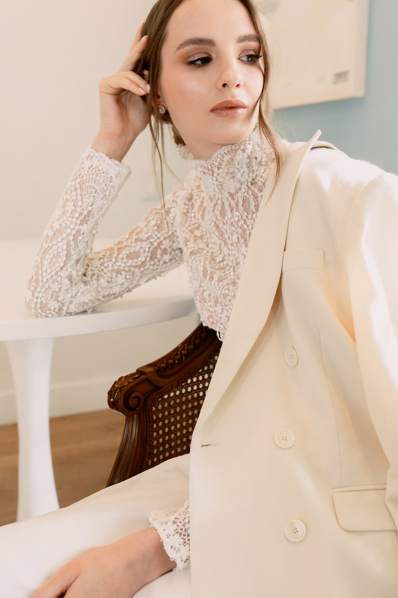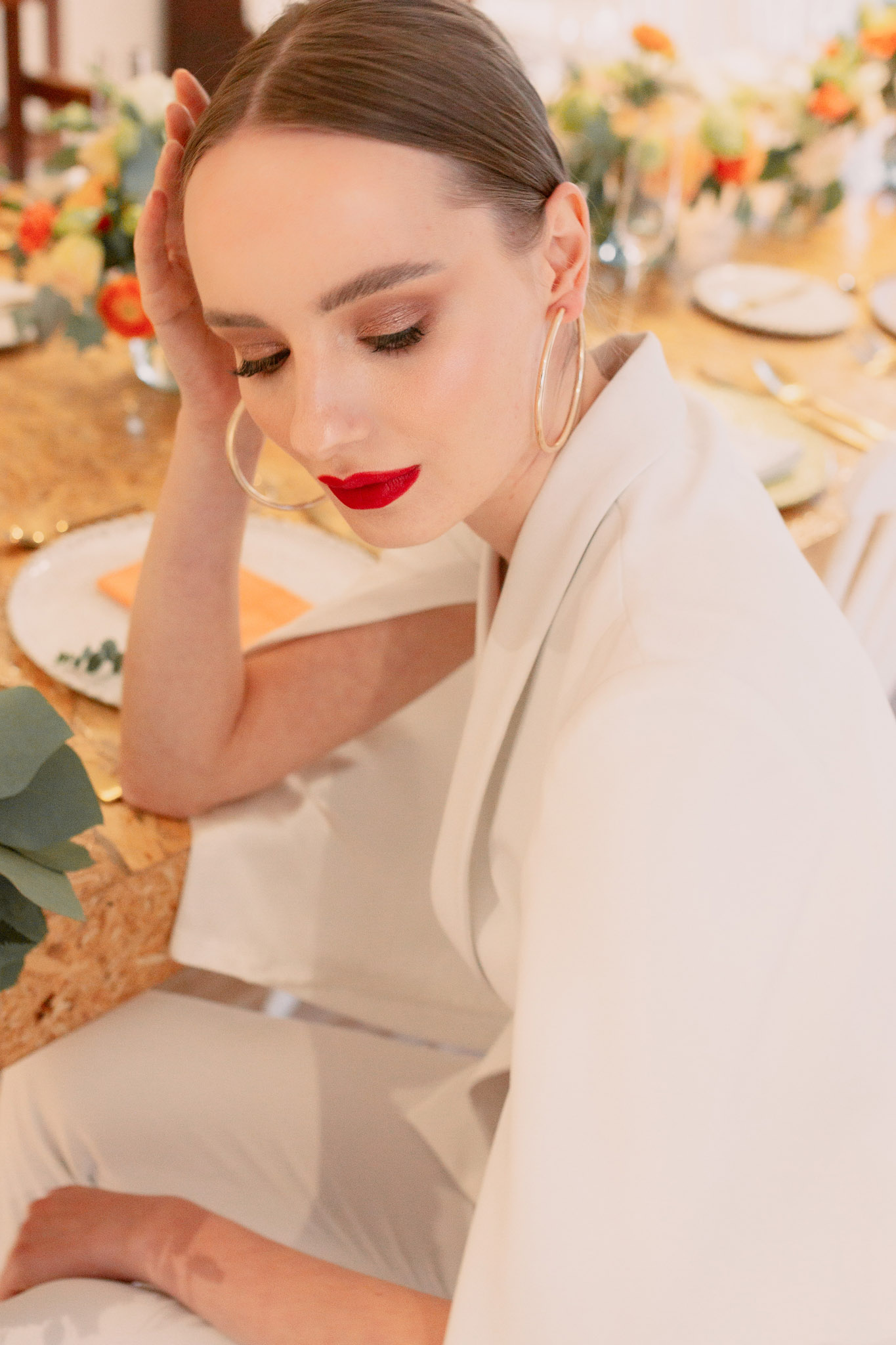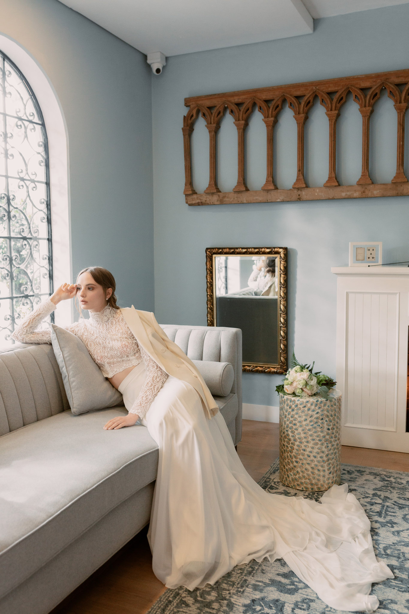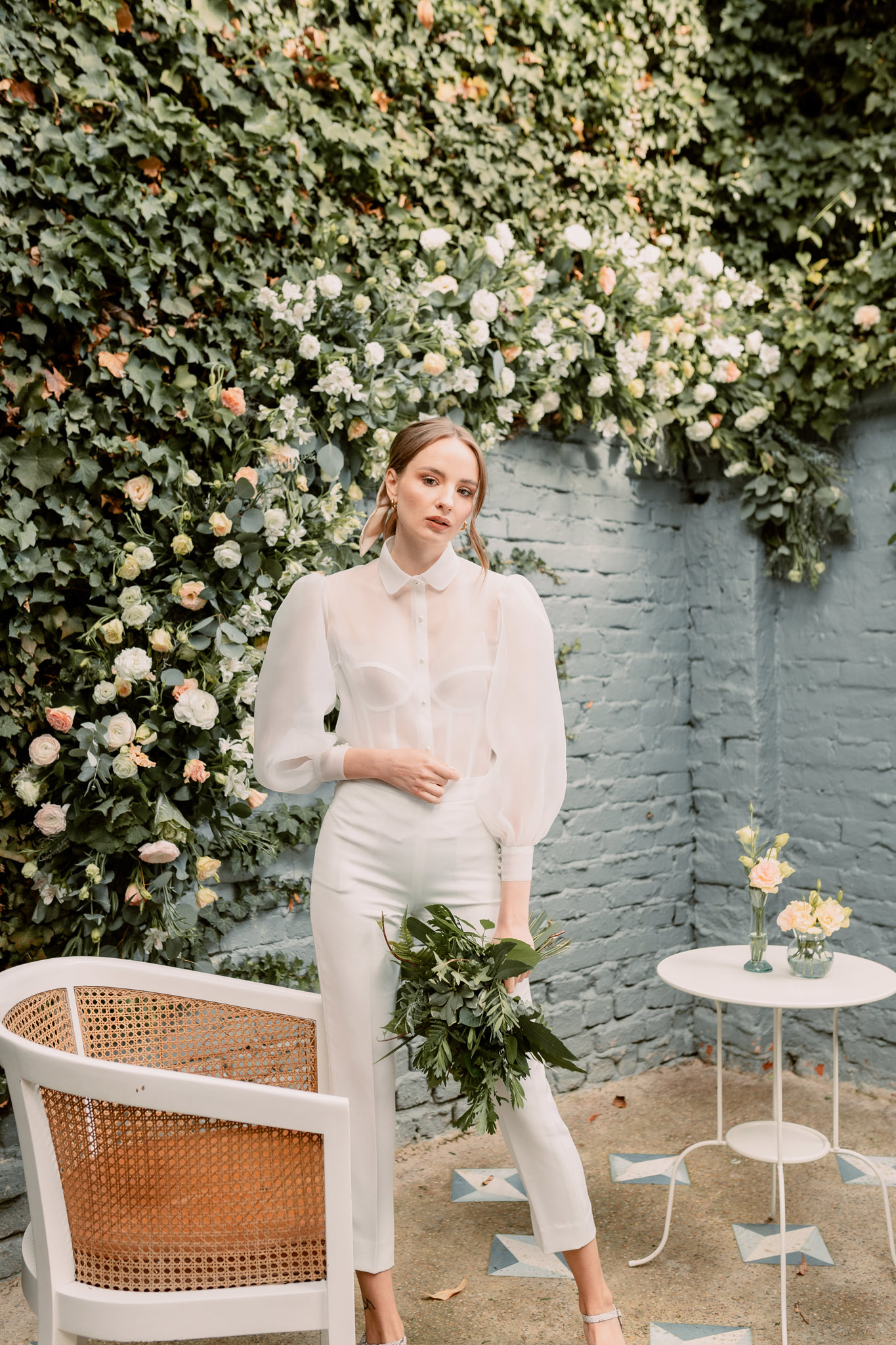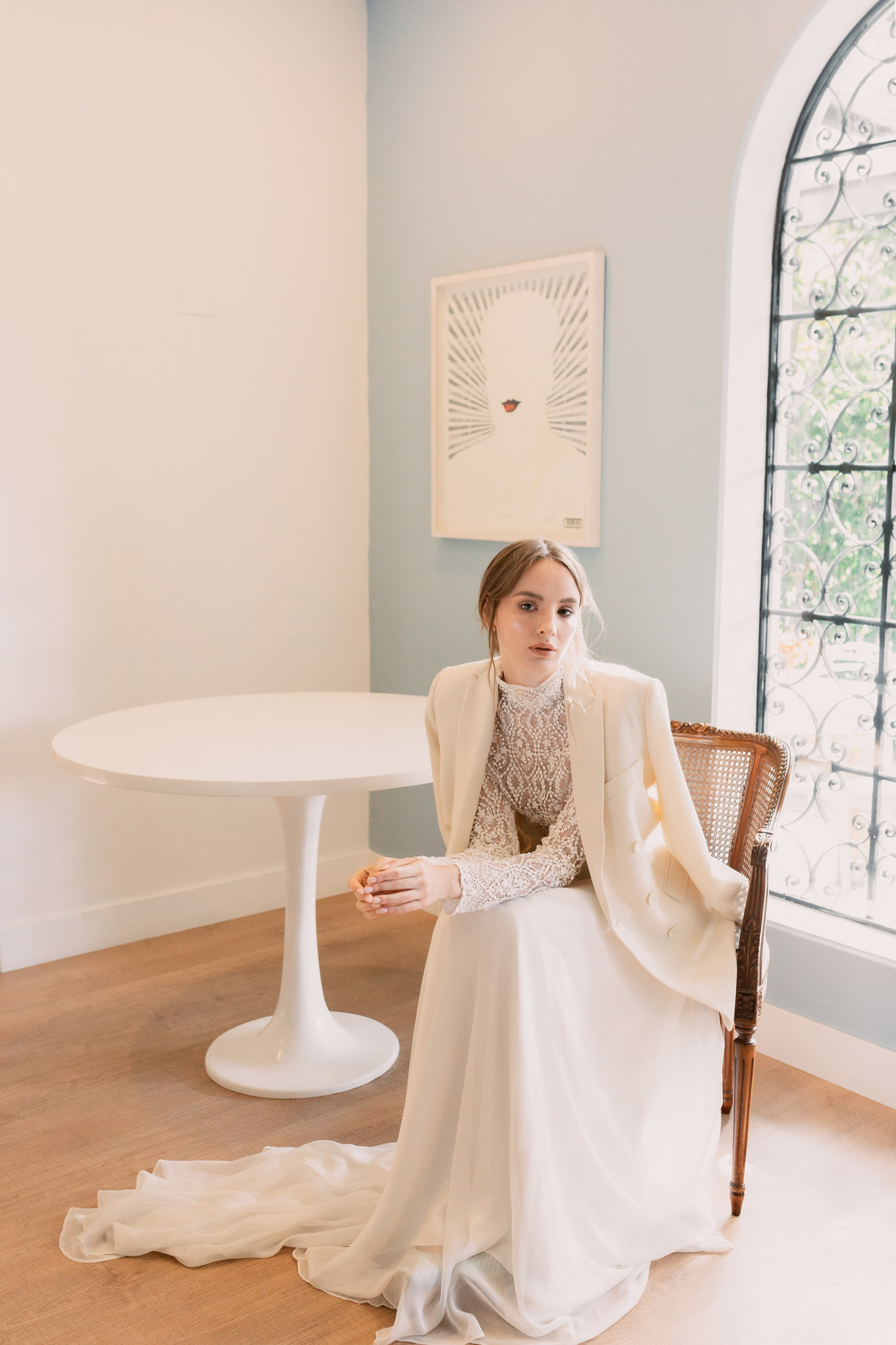 Con el styling de Laura Moreno y piezas de vestuario poco convencionales para una novia, quisimos evocar a una mujer que conoce y sabe de diseño, de moda... que sabe tan bien cuál es su estilo, su gusto, lo que le queda bien, que decide ser ella y solo ella el día de su matrimonio