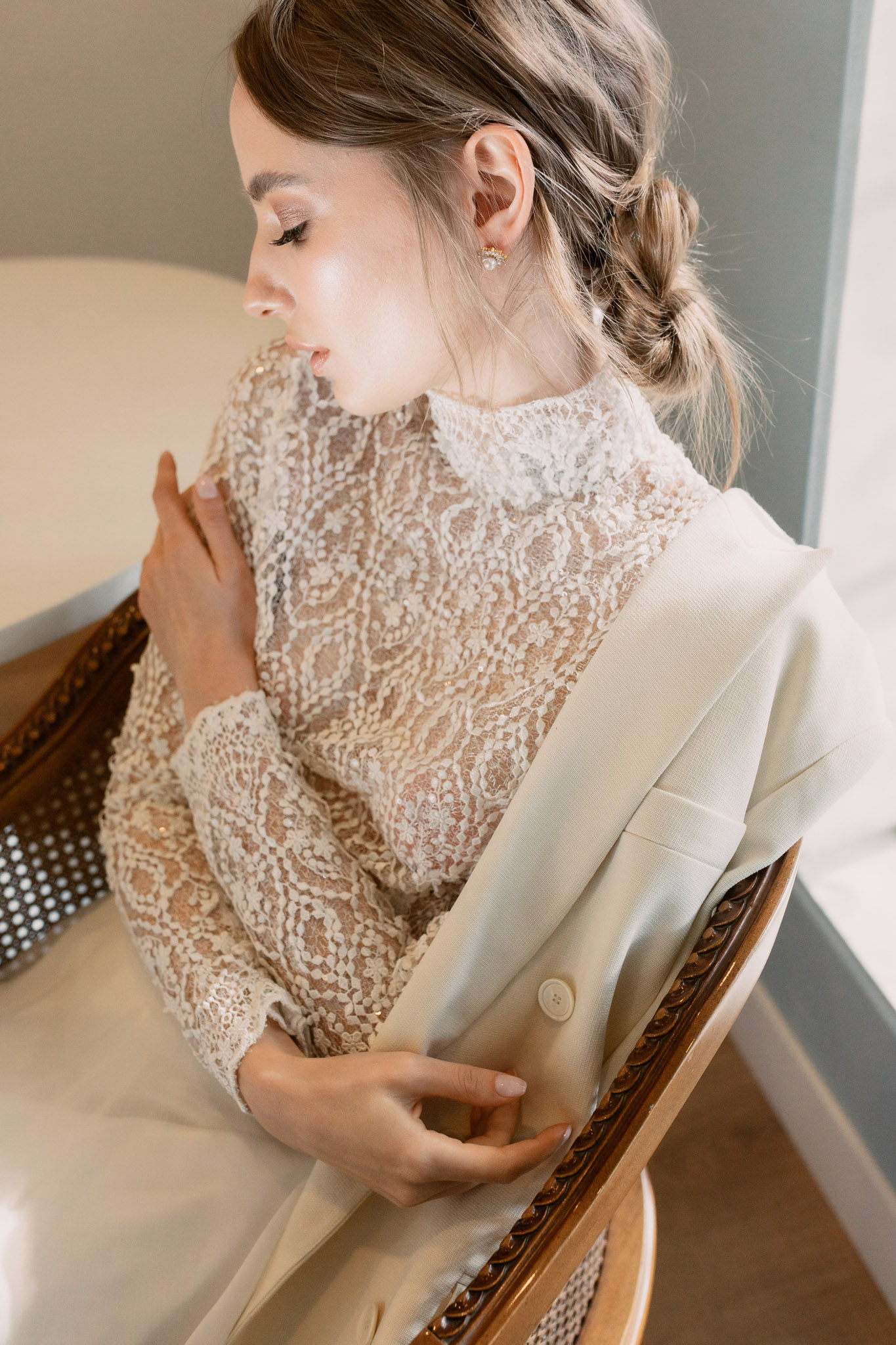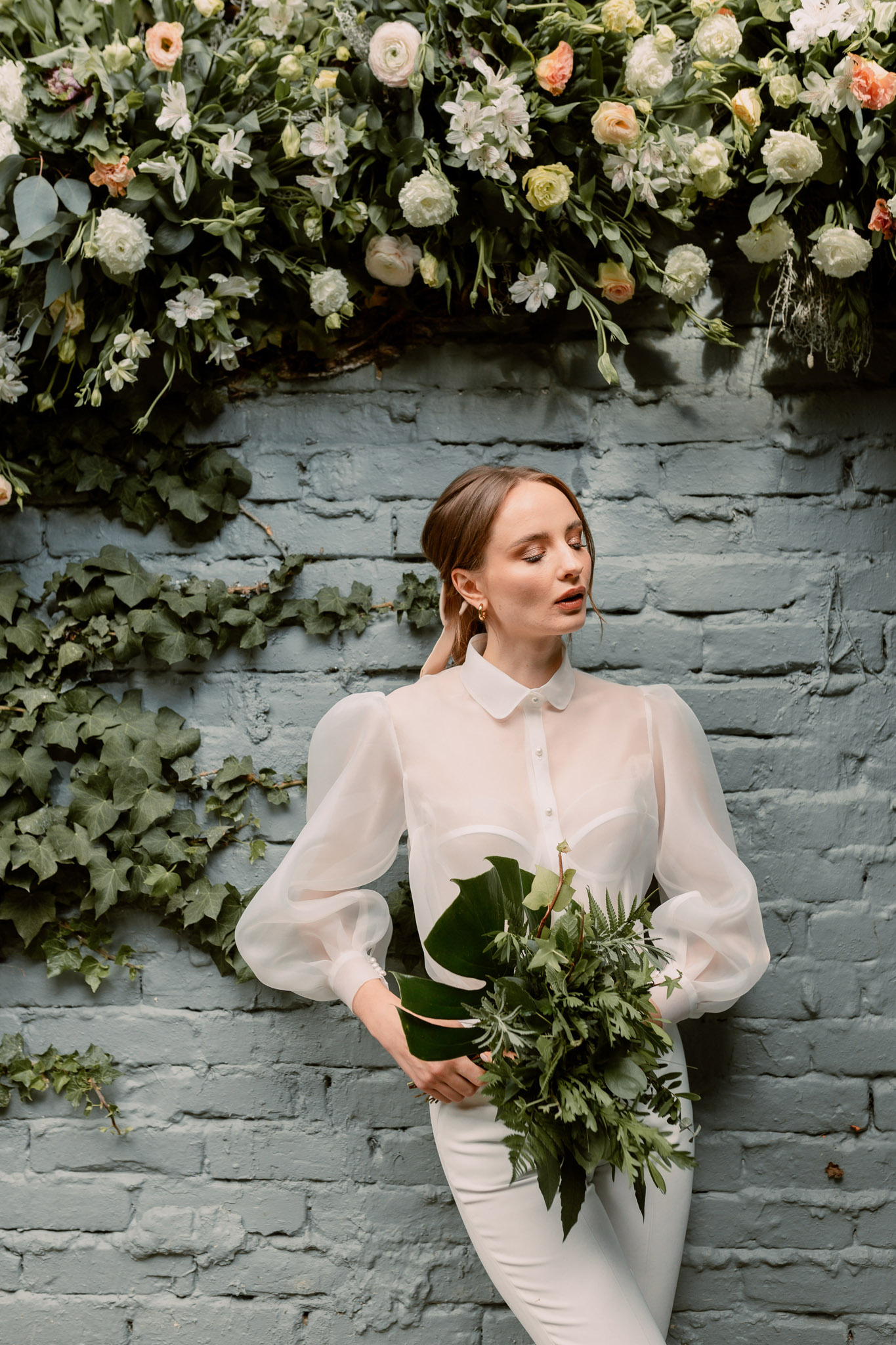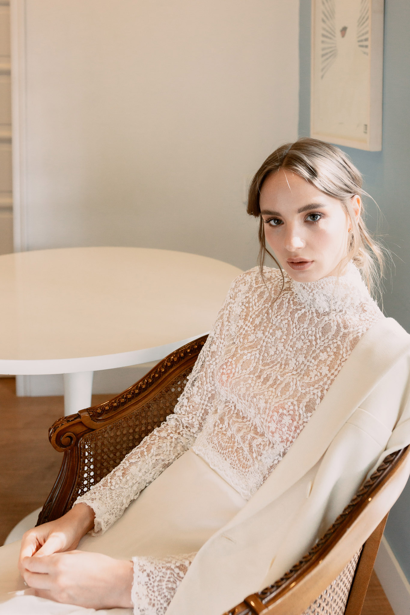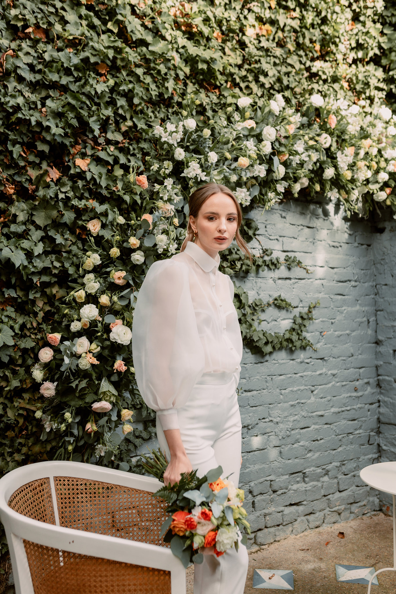 Con el styling de Laura Moreno y piezas de vestuario poco convencionales para una novia, quisimos evocar a una mujer que conoce y sabe de diseño, de moda... que sabe tan bien cuál es su estilo, su gusto, lo que le queda bien, que decide ser ella y solo ella el día de su matrimonio