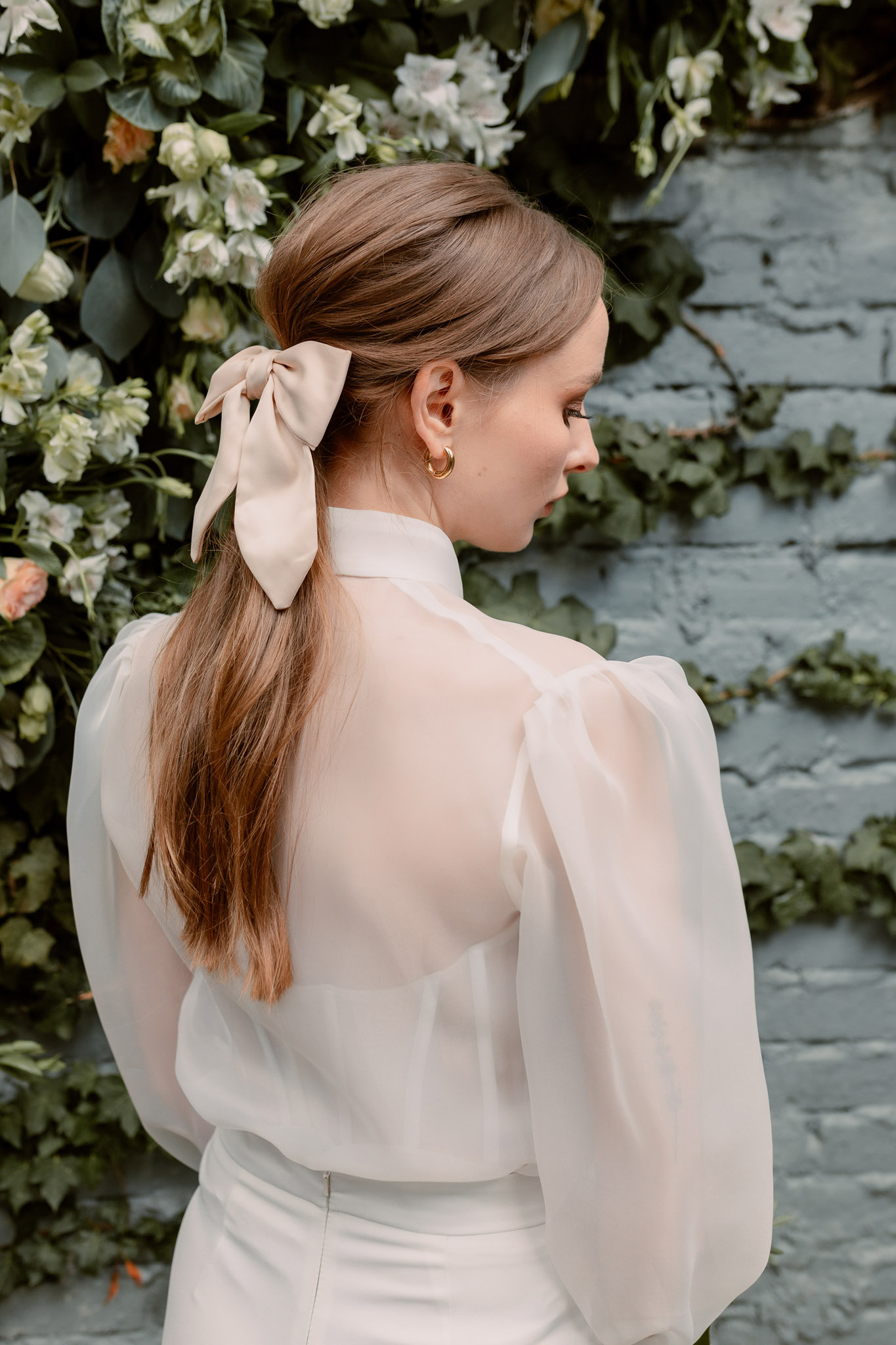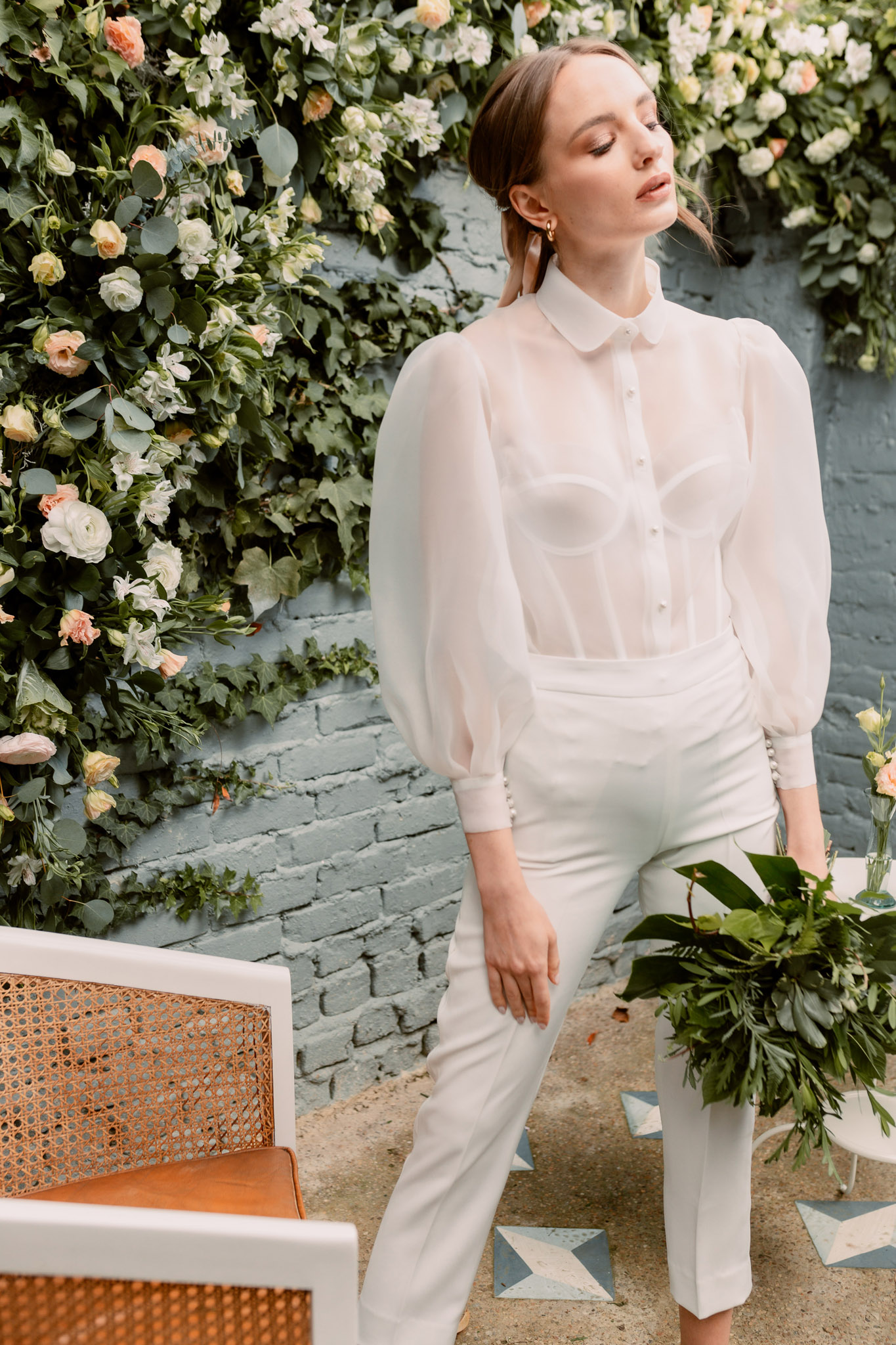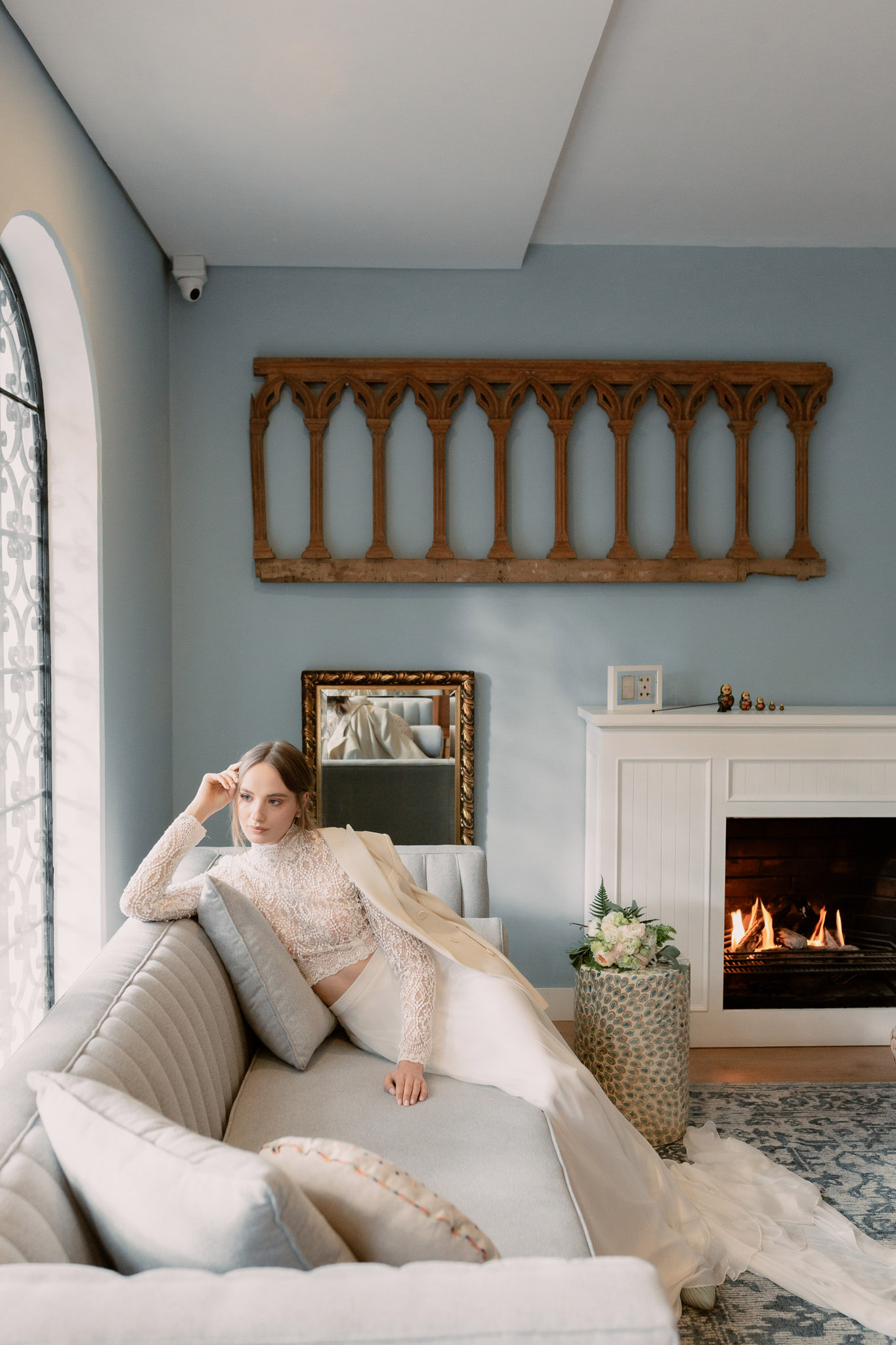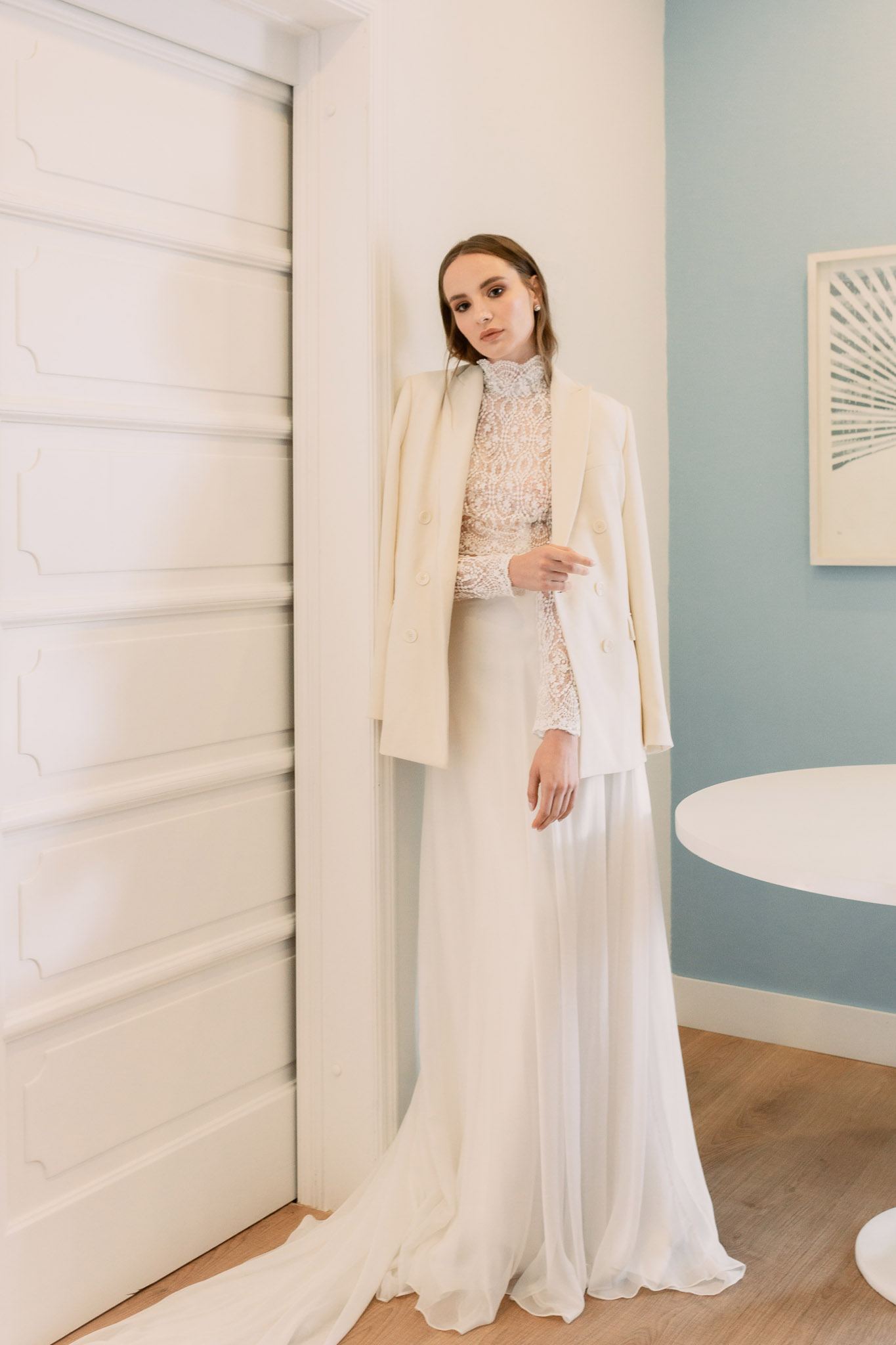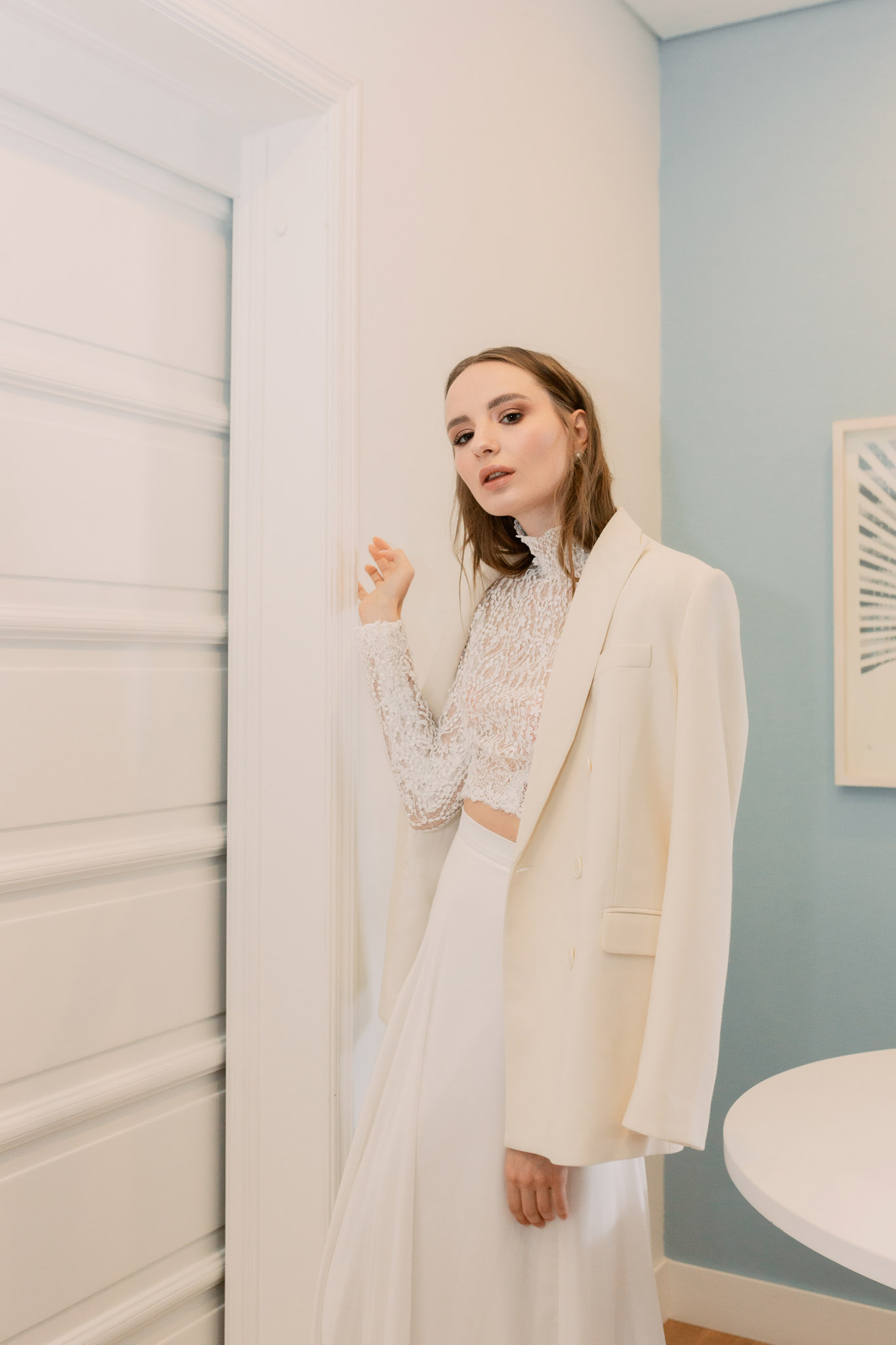 Con el styling de Laura Moreno y piezas de vestuario poco convencionales para una novia, quisimos evocar a una mujer que conoce y sabe de diseño, de moda... que sabe tan bien cuál es su estilo, su gusto, lo que le queda bien, que decide ser ella y solo ella el día de su matrimonio