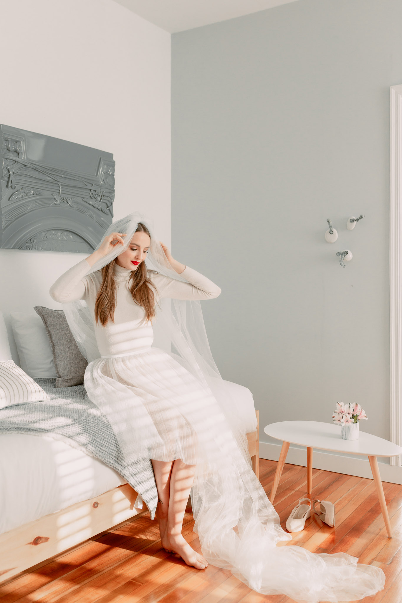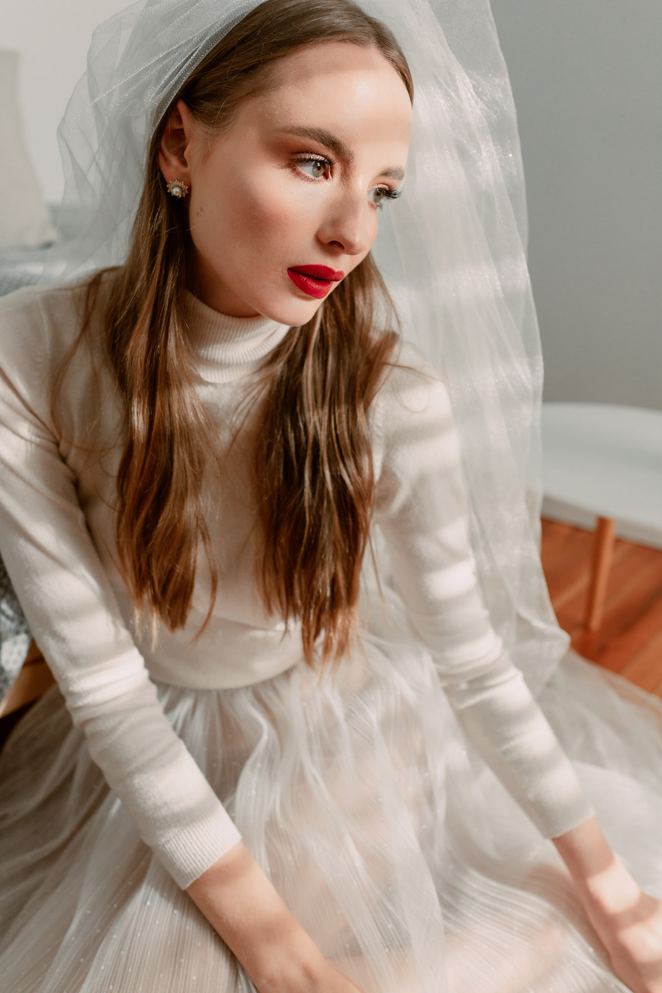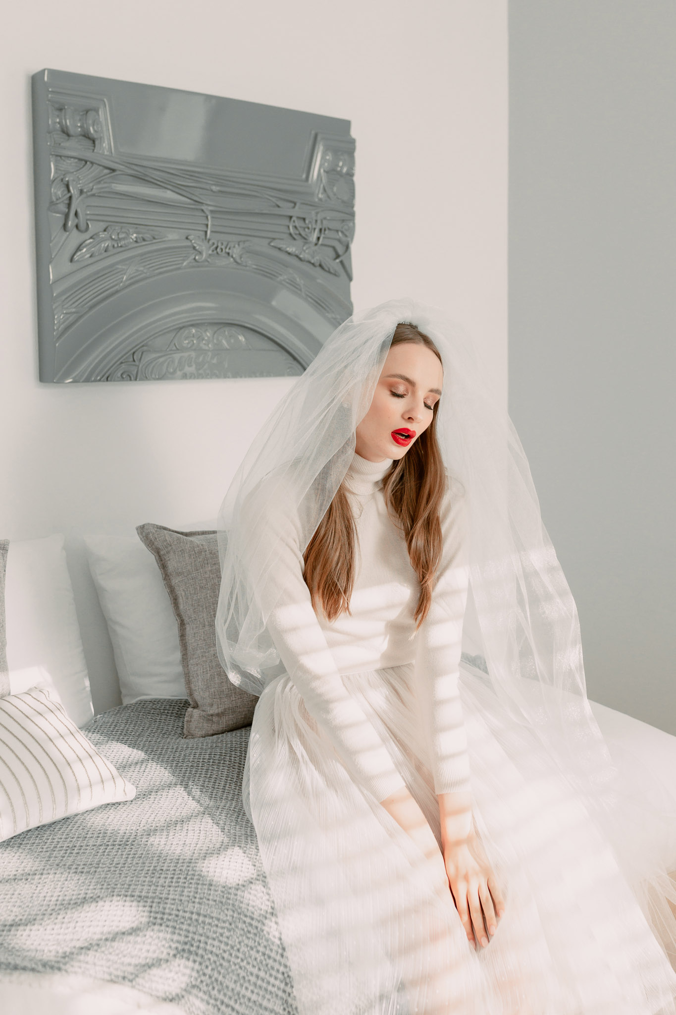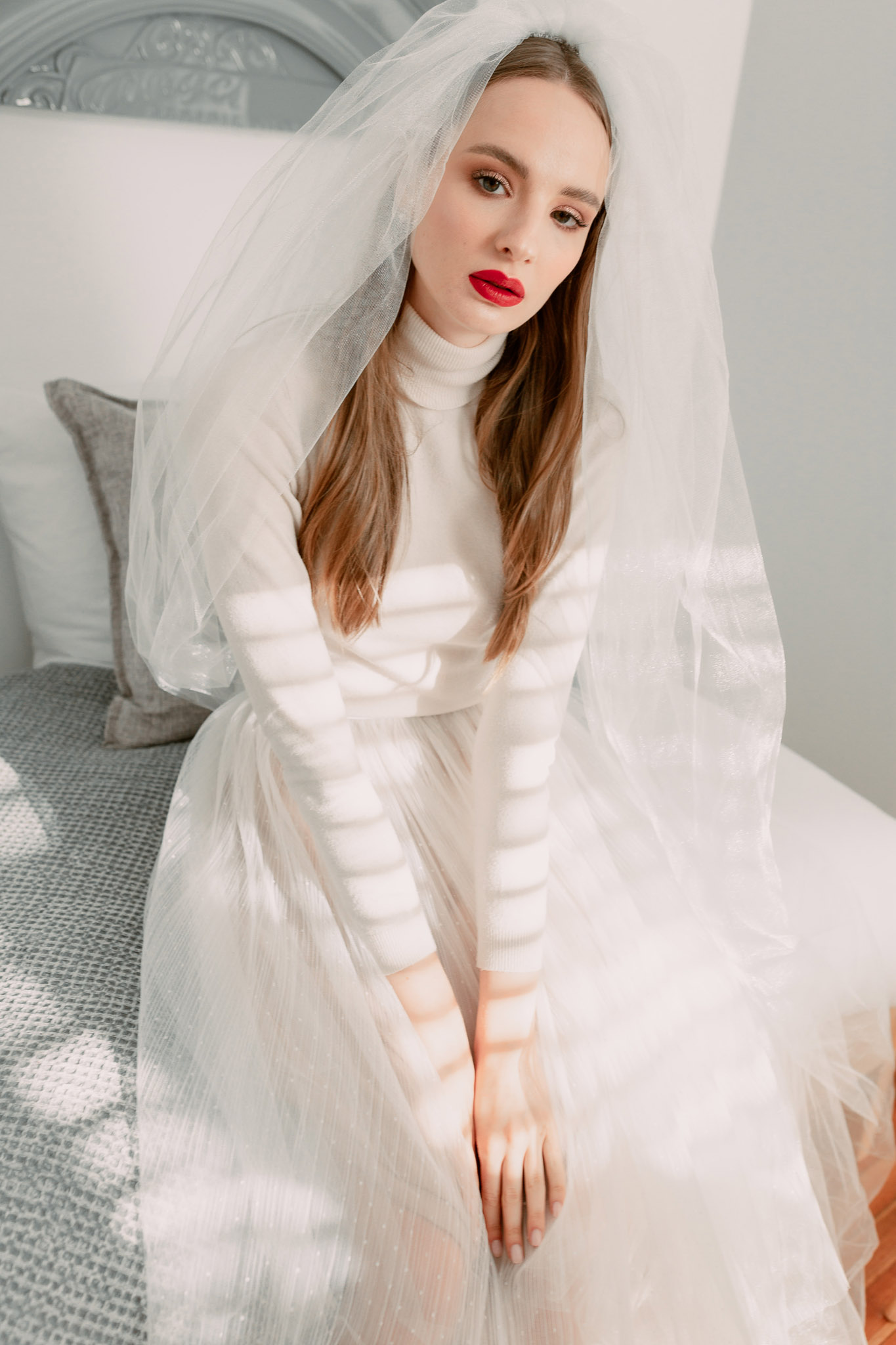 Falda: Alexander Rivera. Zapatos: DFV Leather. Aretes: Ahava. Velo: Gina Banco. Cuello tortuga: Zara