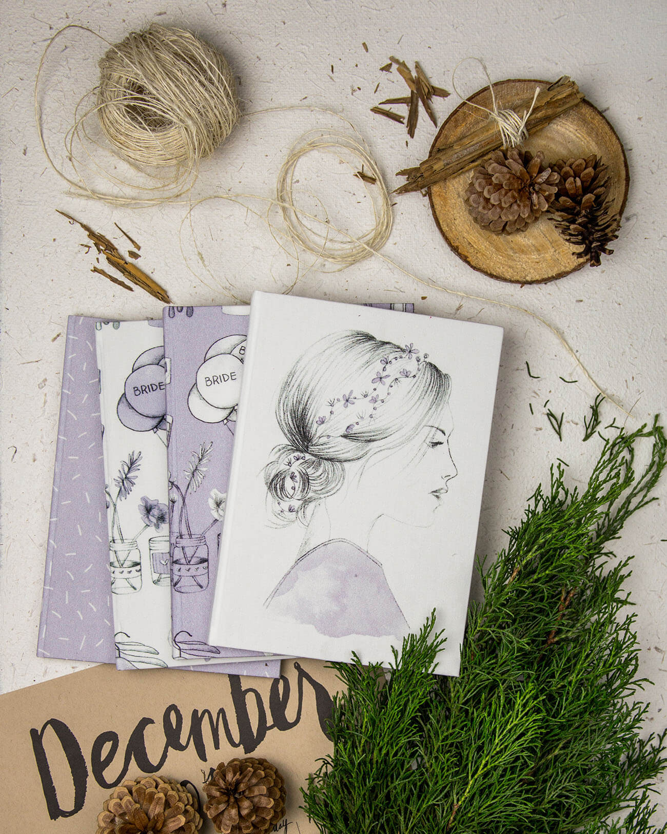 Libretas ilustradas a mano, forradas en tela, hechas con todo el amor. Cuatro diseños, 80 páginas, muchos renglones. Para regalar, para regalarte. Para planear tú matrimonio, el de tu hermana, el de tu mejor amiga.