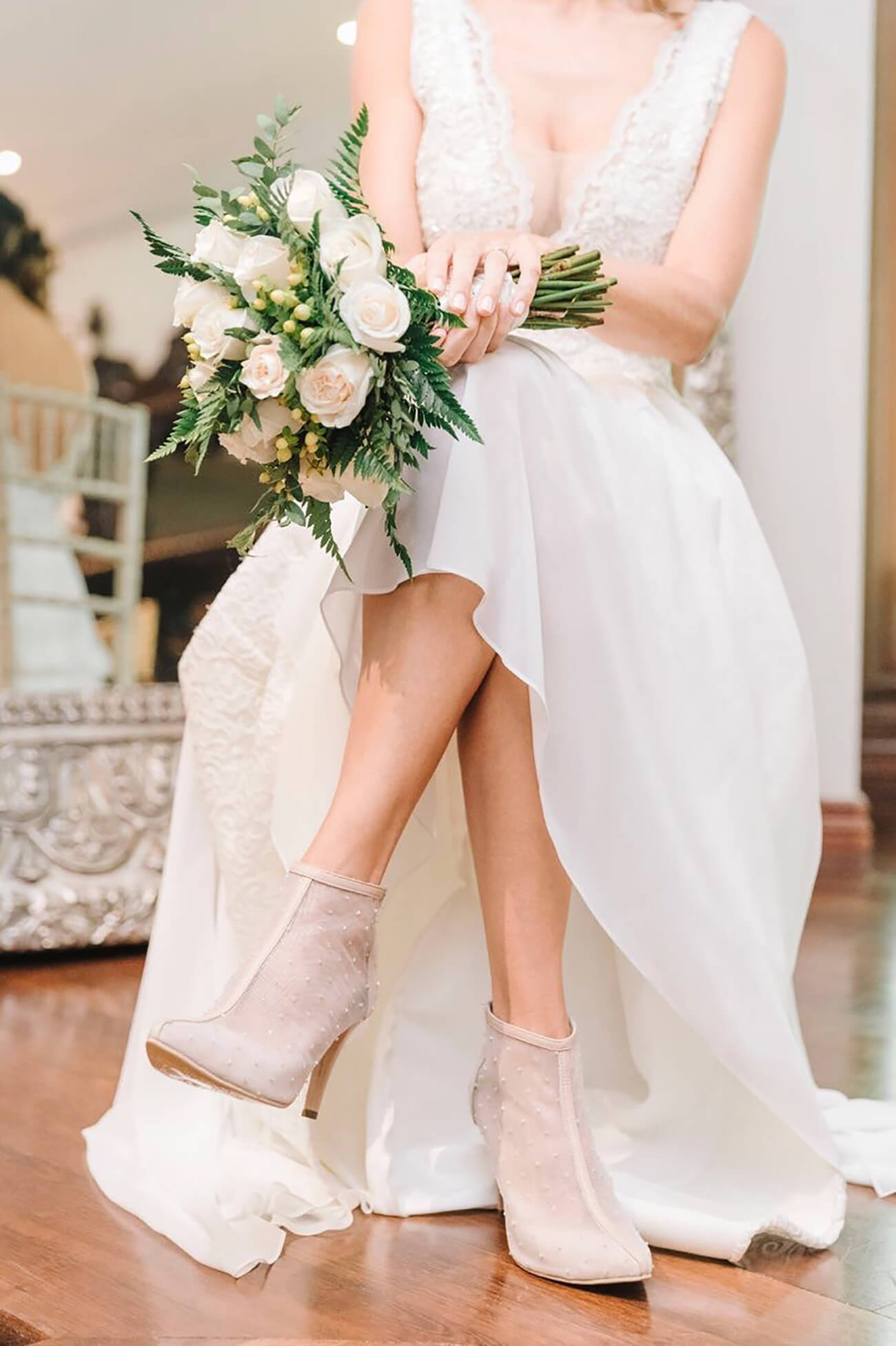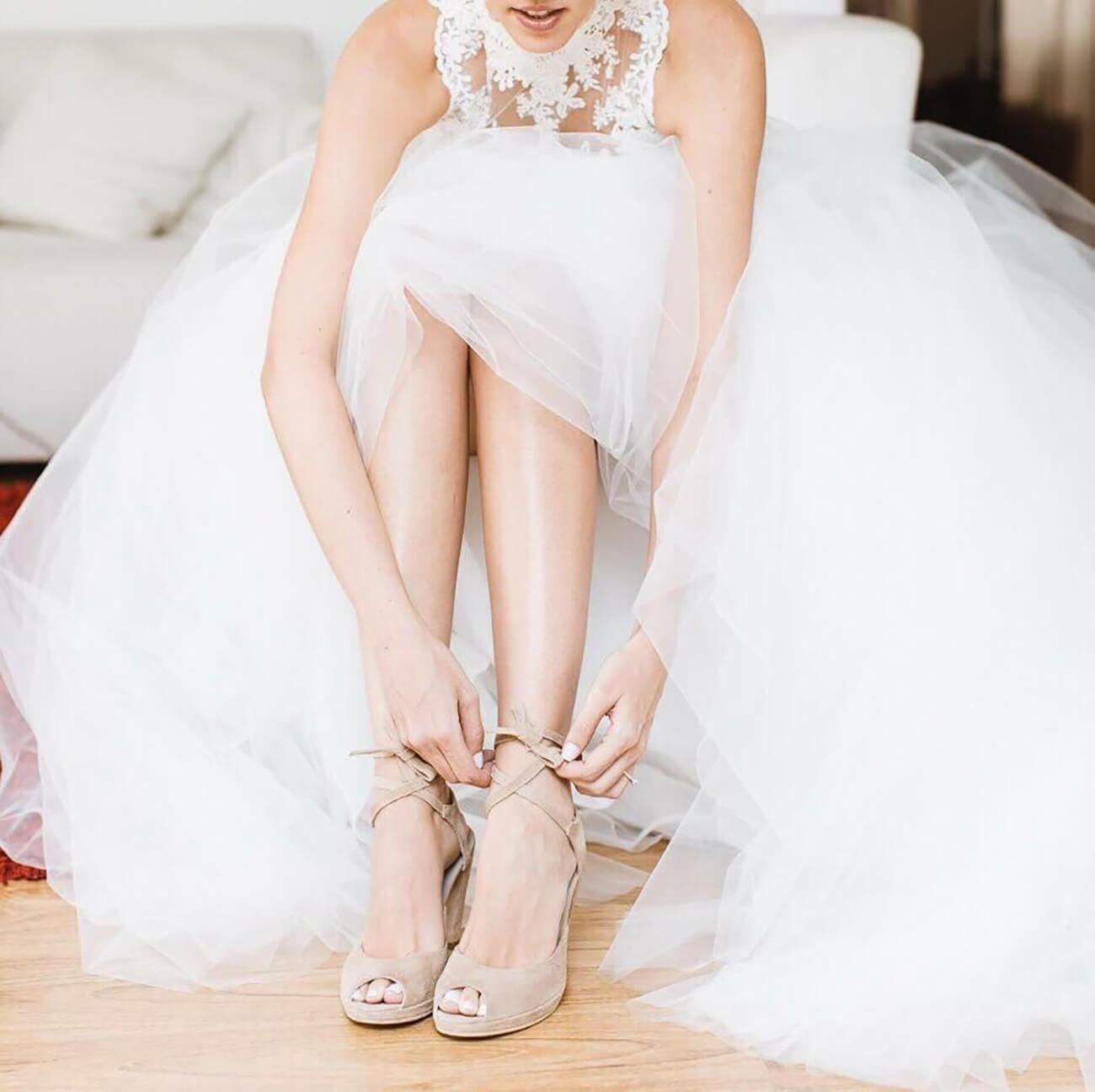 Dos ideas para caminar al altar, ambas con la posibilidad de personalizar sus detalles, colores y añadir plantillas en látex, para hacerlos súper cómodos. Botines Mónica, en tul y cuero bordados con mostacillas ($326.000) y Sandalias Clara, con tirantes en gamuza color nude ($250.000).