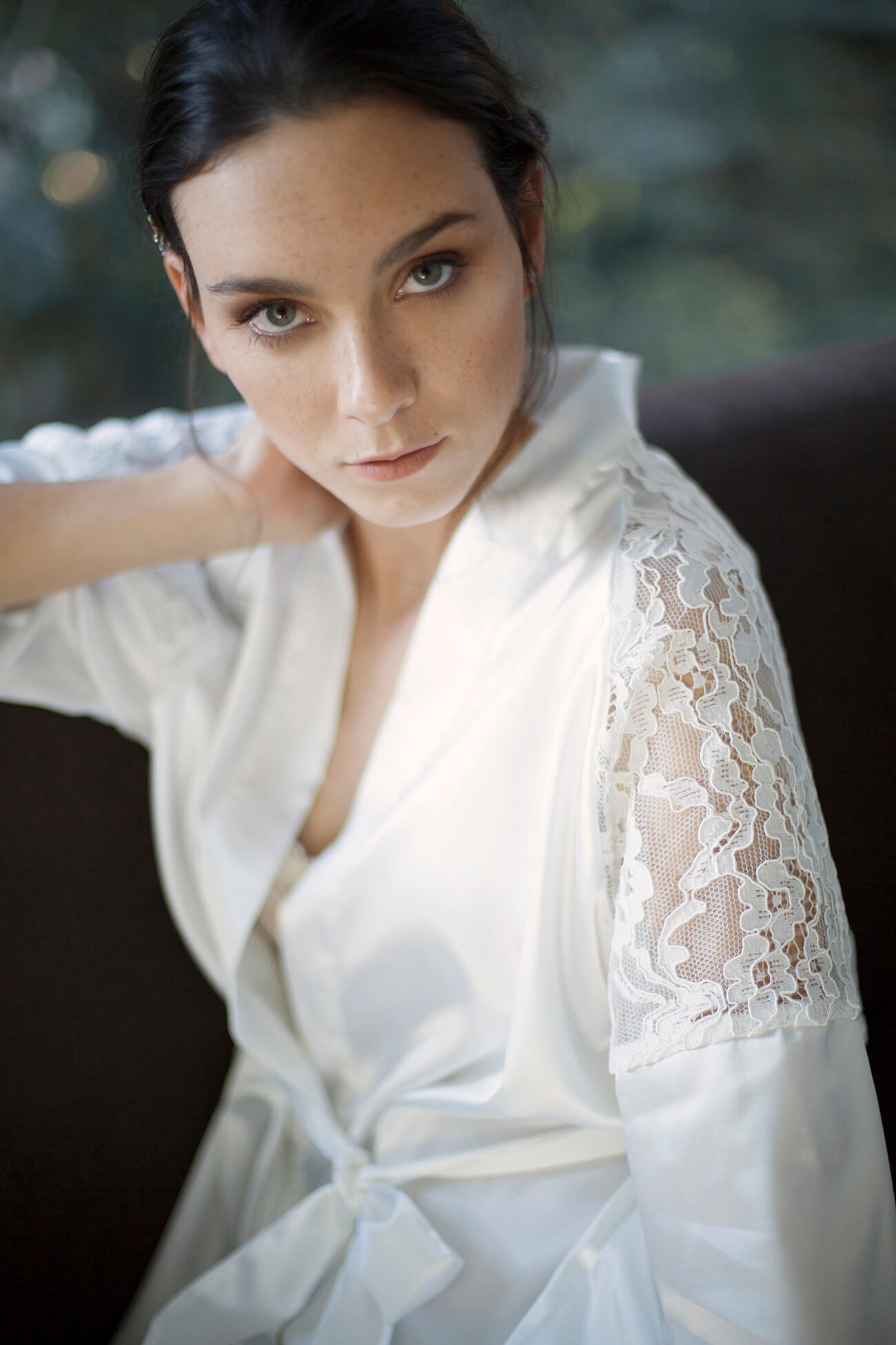 Hela, una pijama muy cómoda, con la dosis justa de sensualidad. En velo y viscosa ($89.000). Ull, un kimono multifuncional en blonda y satín. Para la novia el día de su matrimonio, para cualquier mujer, para cualquier día ($140.000).