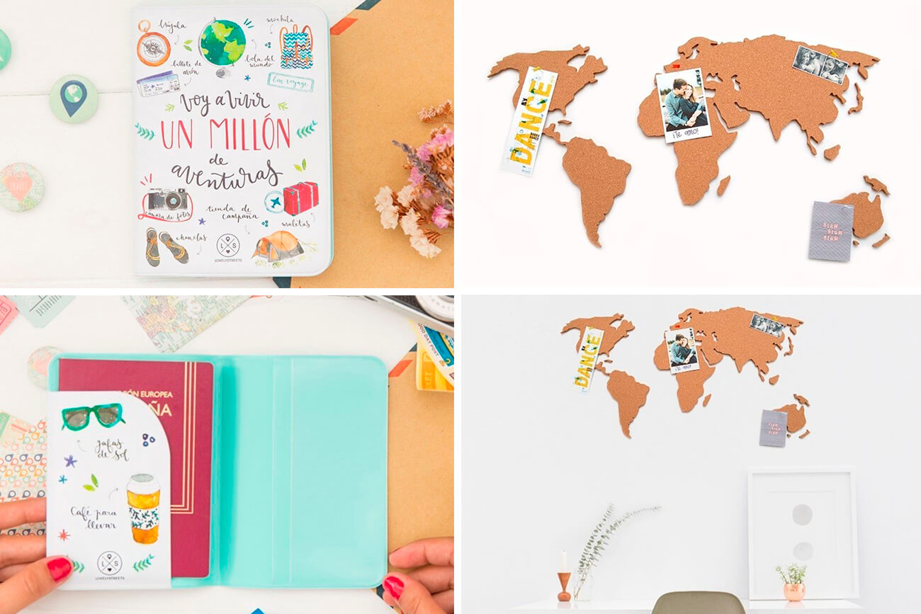 Dos ideas para incentivar el espíritu viajero. Funda para pasaporte, de Mr. Wonderful ($49.900). Tablero Mapamundi, en corcho y vinilo para adherirse a cualquier superficie, de Homesick Design ($90.000).