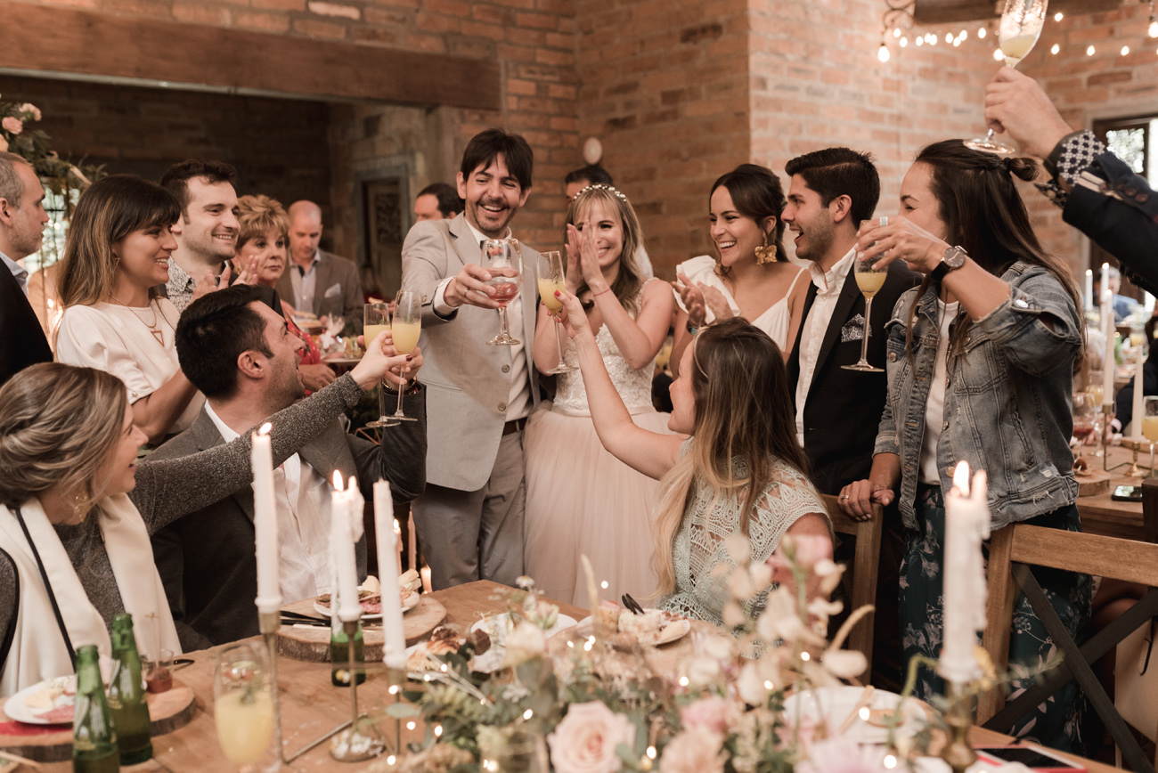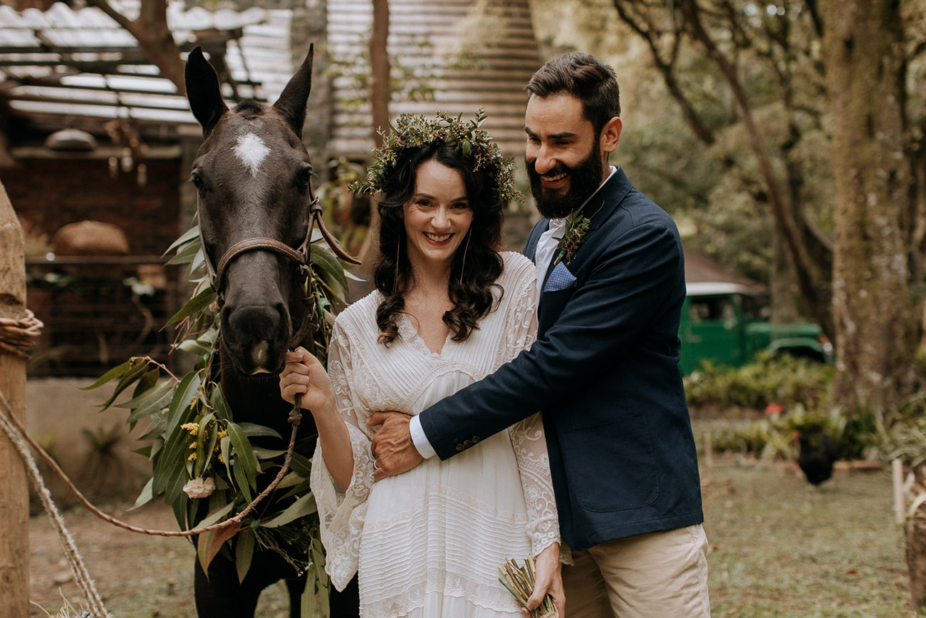 Un brunch, con hora de comienzo y hora de final. No querían fiesta. No son mucho de bailes. Pero sí son mucho de música, entonces hicieron una lista en Spotify con todas las canciones que cuentan ese trayecto que han recorrido juntos. Acompañándolos estaban 120 personas que los quieren y ellos quieren y también, sus amigos incondicionales: Berta y Cacerola, dos perritos salchichas; un caballo, varias gallinas (las cutucutu, como les dice ella) y Barbas Espátula, la perrita que adoptaron. El resultado de tanto amor fue una novia con el vestido muy muy sucio de jugar con sus compinches y una felicidad desmedida.