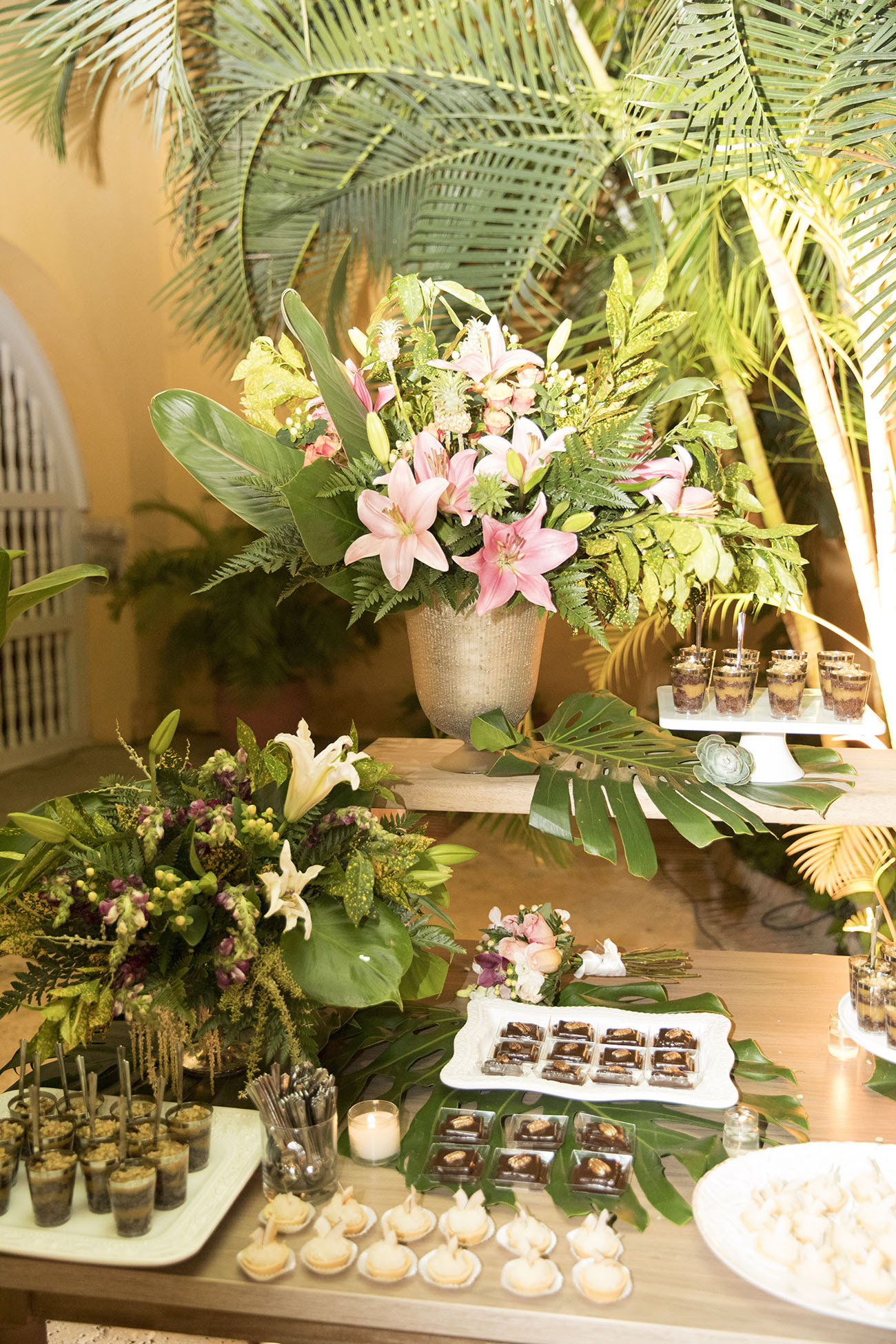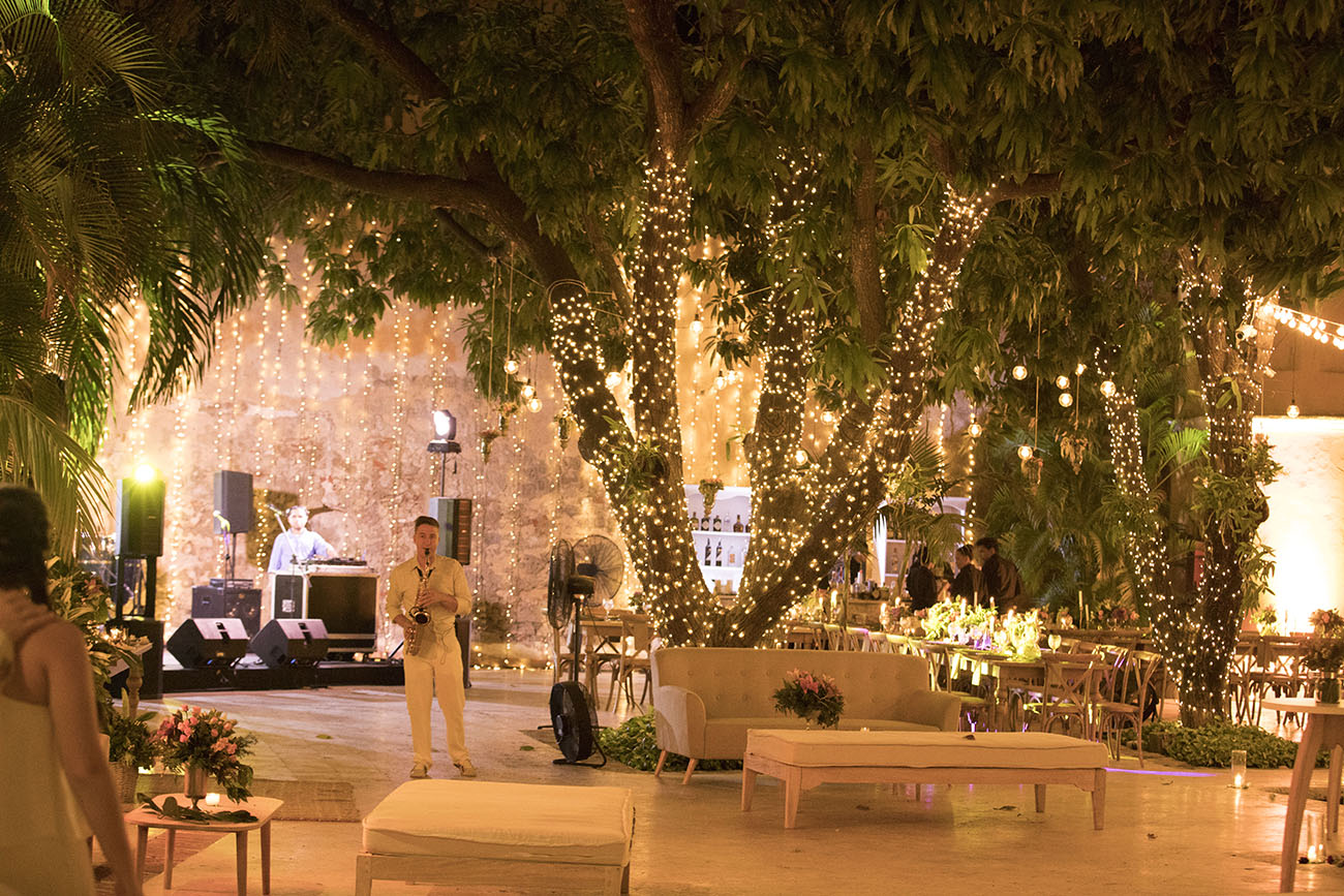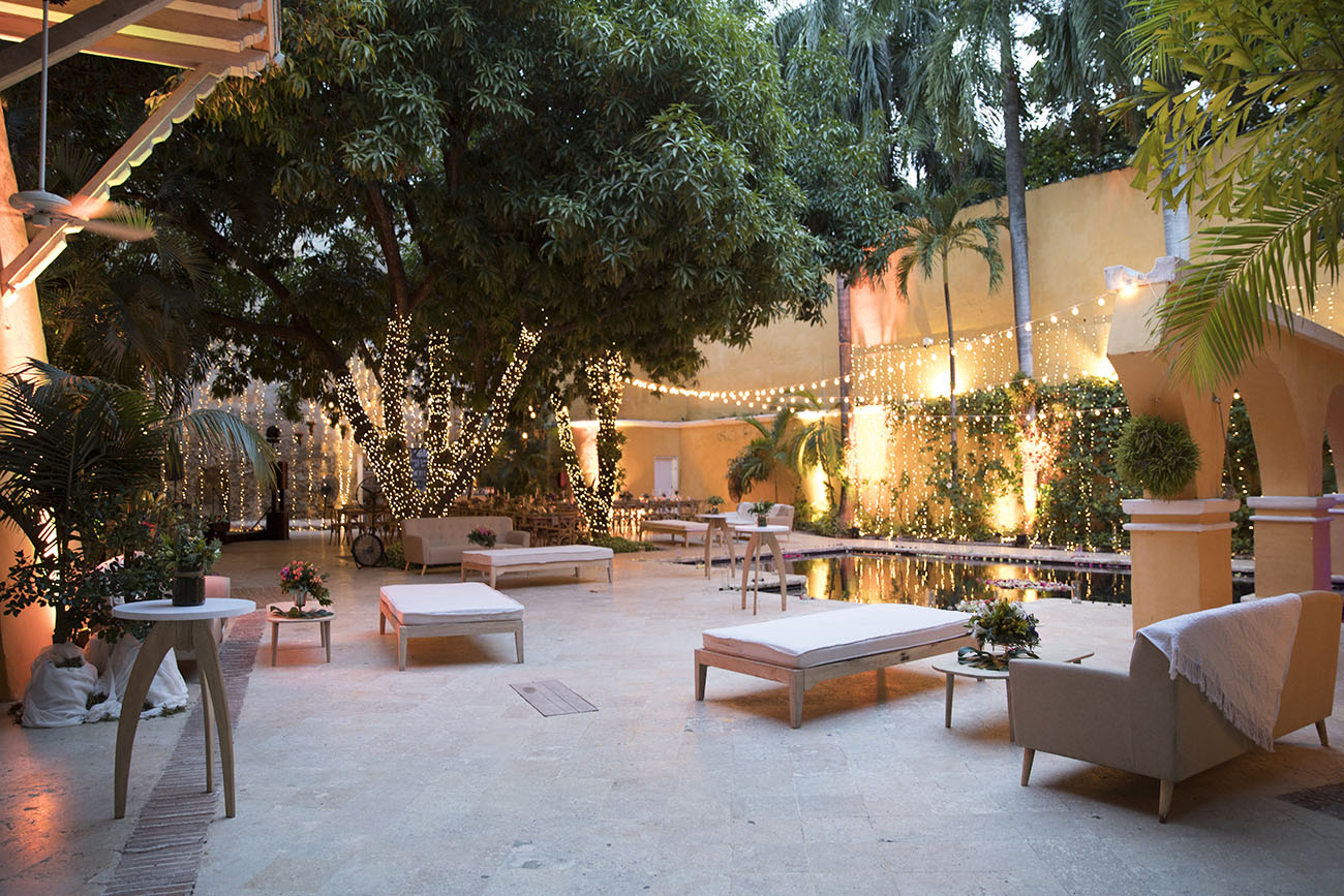Día tres. Casa de Don Andrés de Madariaga y Morales, Conde de Pestagua. A esta residencia colonial, ubicada en pleno Centro Histórico, María Antonia, de Flores de Abril, supo potenciarle su encanto Caribe llenándola de muchas luces, palmas, follaje, flores, cocos y algunos toques dorados. Conectada con la idea de que fuera una reunión de amigos, dispuso en el patio central una gran mesa, tipo imperial, en forma de cruz (zoom a las fotos con todos los bonitos detalles).