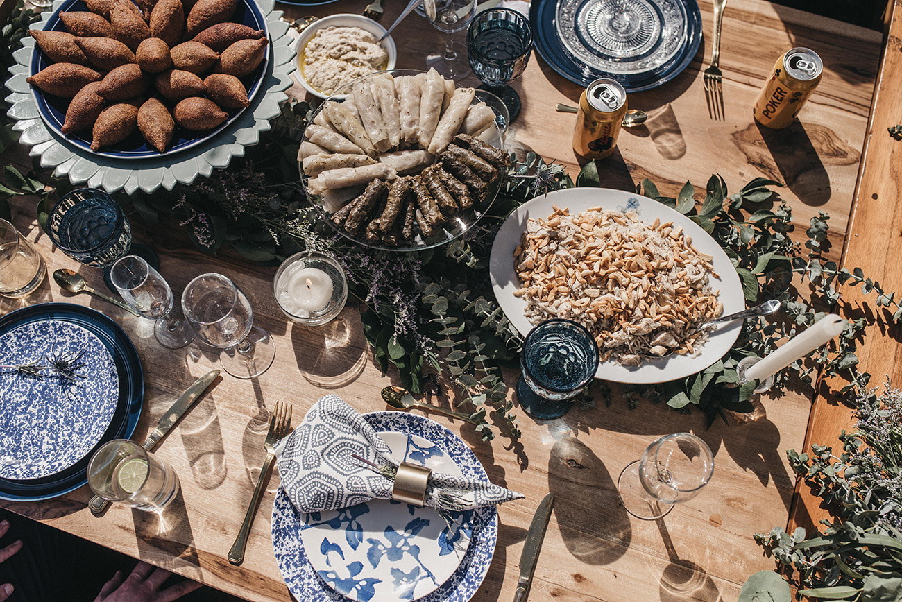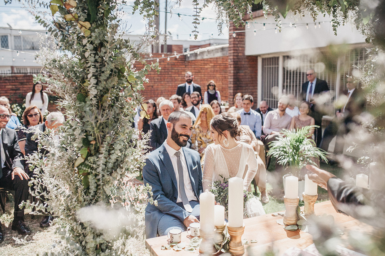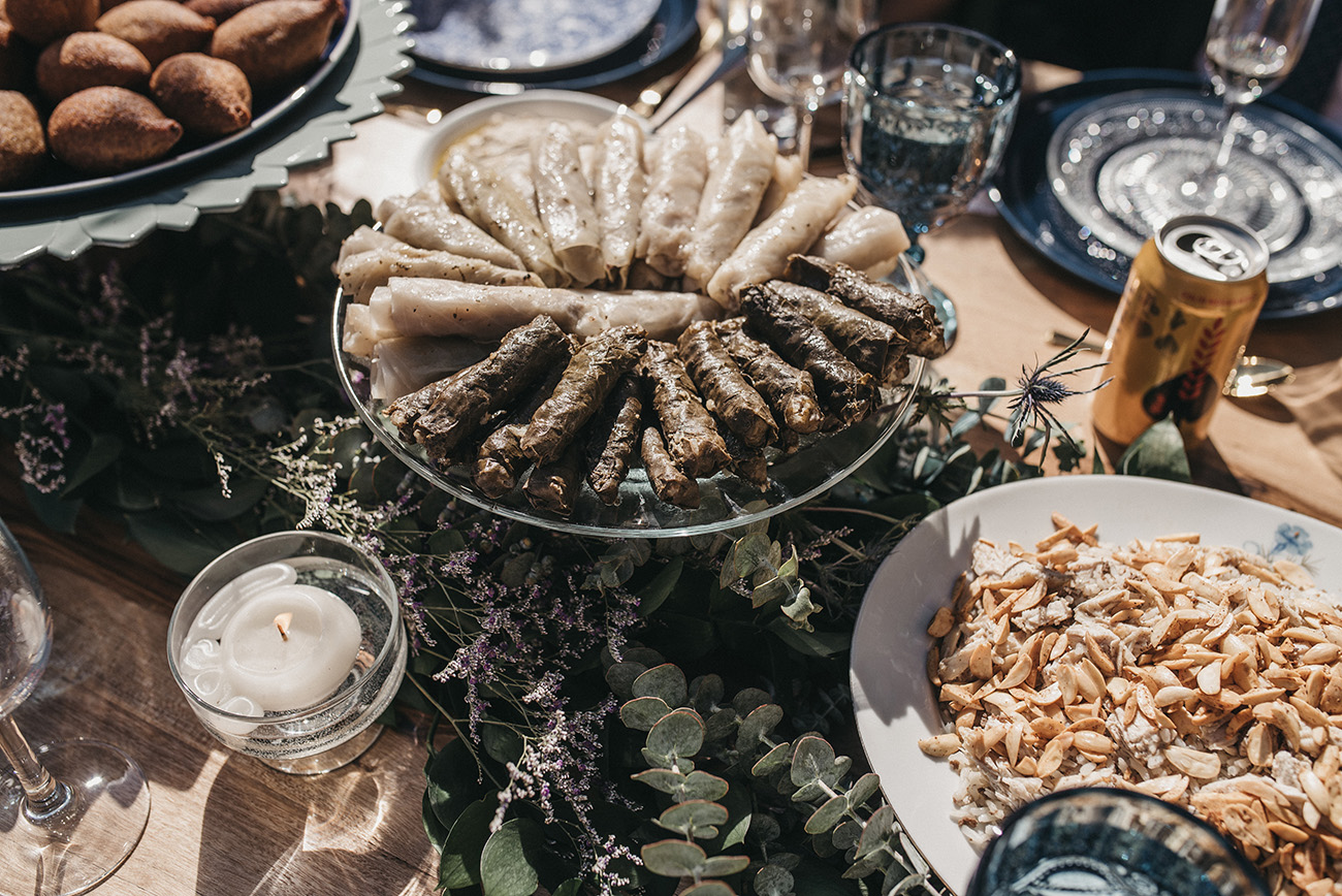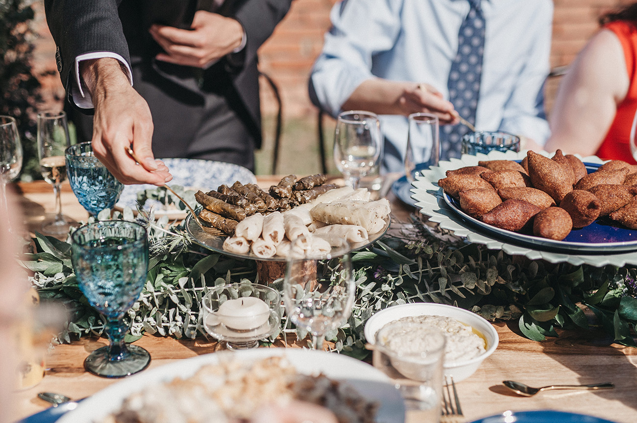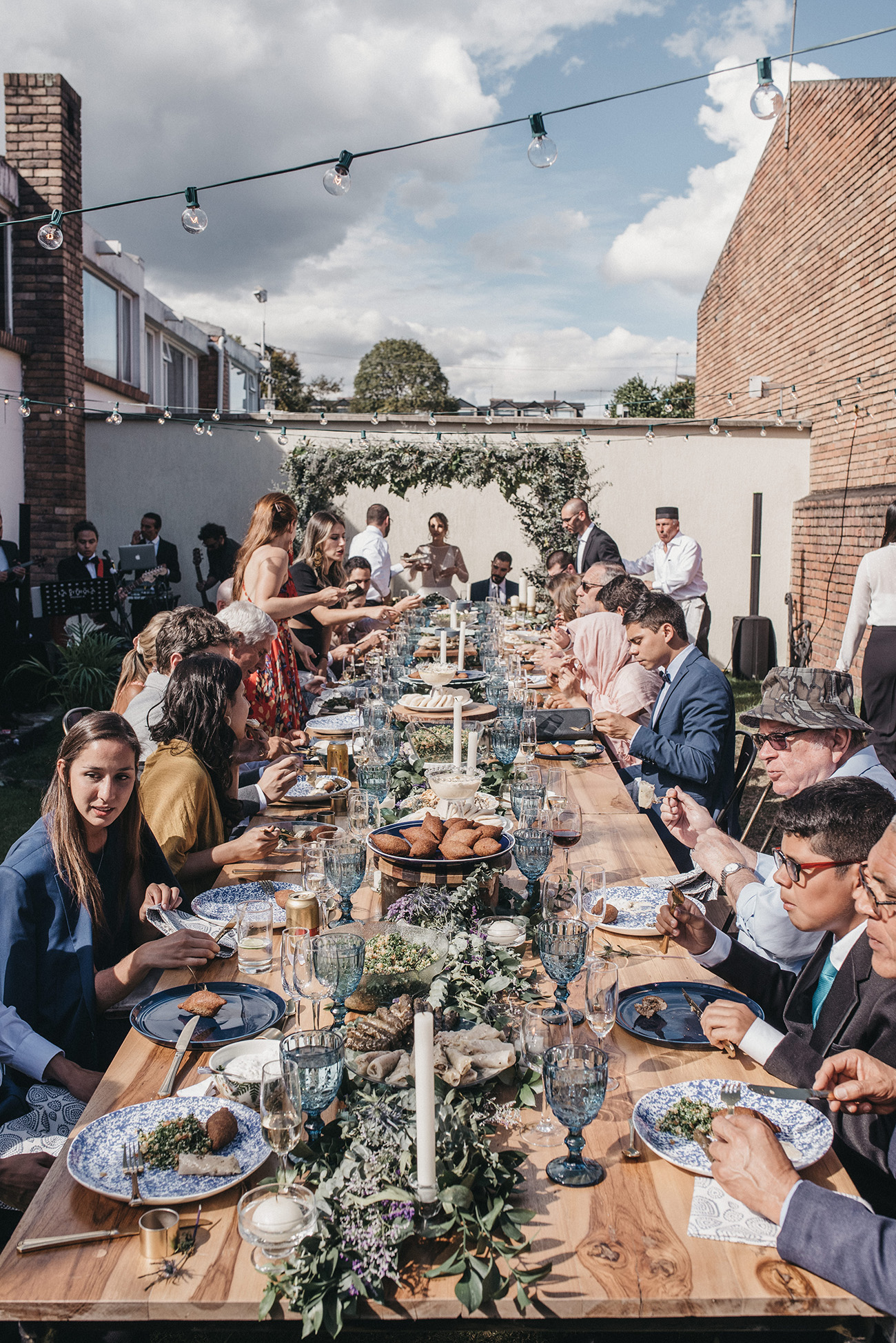 Fue un almuerzo en una mesa larga, al estilo de las familias italianas, donde todos comparten, todos conversan, todos comparten alrededor de la buena comida. En el mismo jardín que ocurrió la ceremonia. Con las mismas sillas. Con los mismos invitados. Una vajilla de tonos azulosos, troncos de madera, velas, luces y mucho follaje verde. Comida árabe, para recordar las raíces de la familia de él. Postre árabe, hecho por el papá de Raschid. También cheesecake, para darle gusto a ella, que estudió hace un tiempo pastelería en el Instituto Mariano Moreno y es muy exigente cuando se trata de sabores. Fue una velada de recarga para el alma. Fue una conversación de todos con todos. Fue un recordatorio de que la familia es la manifestación del amor.
