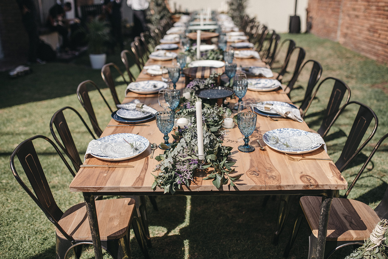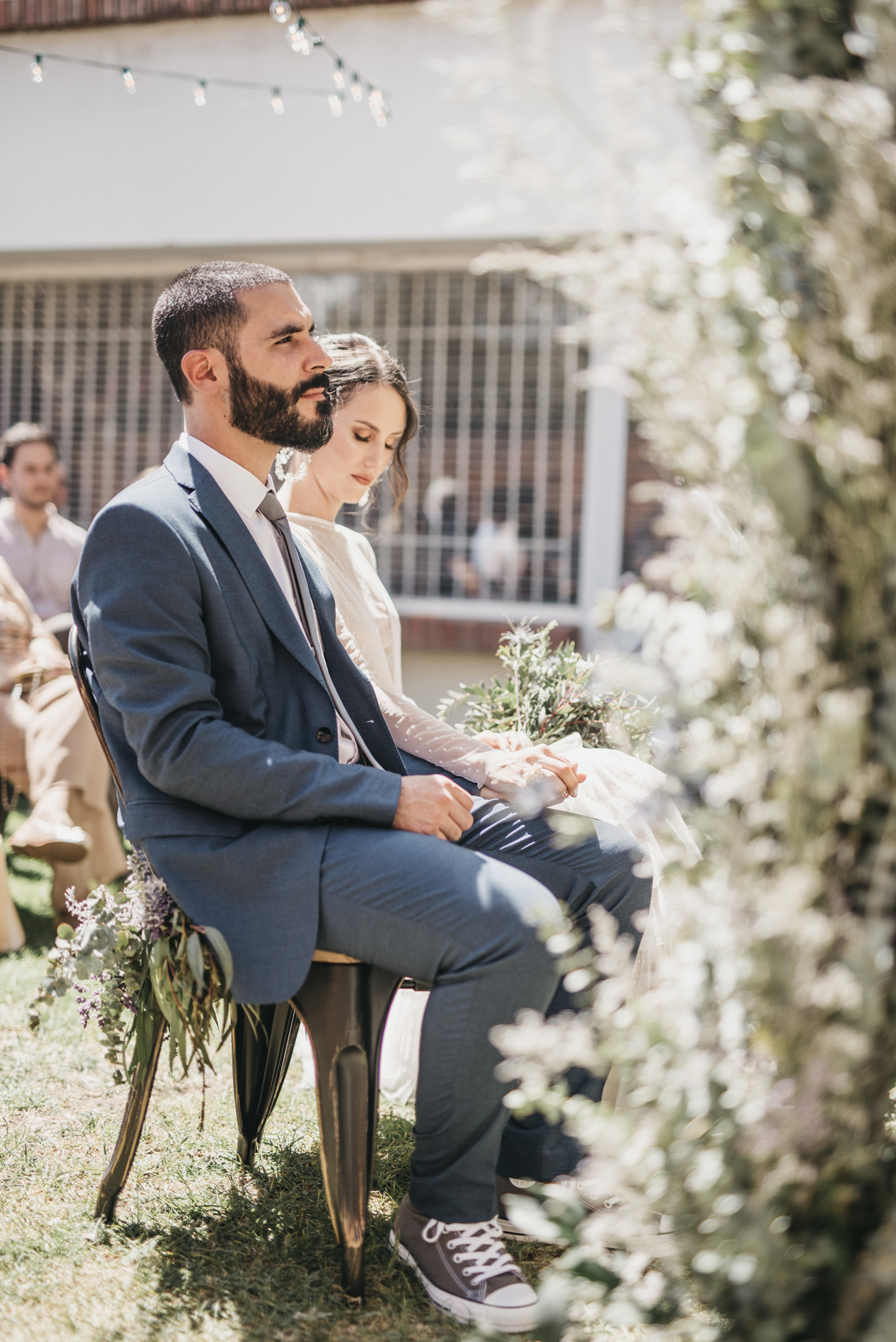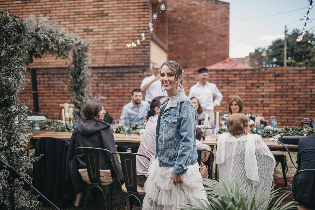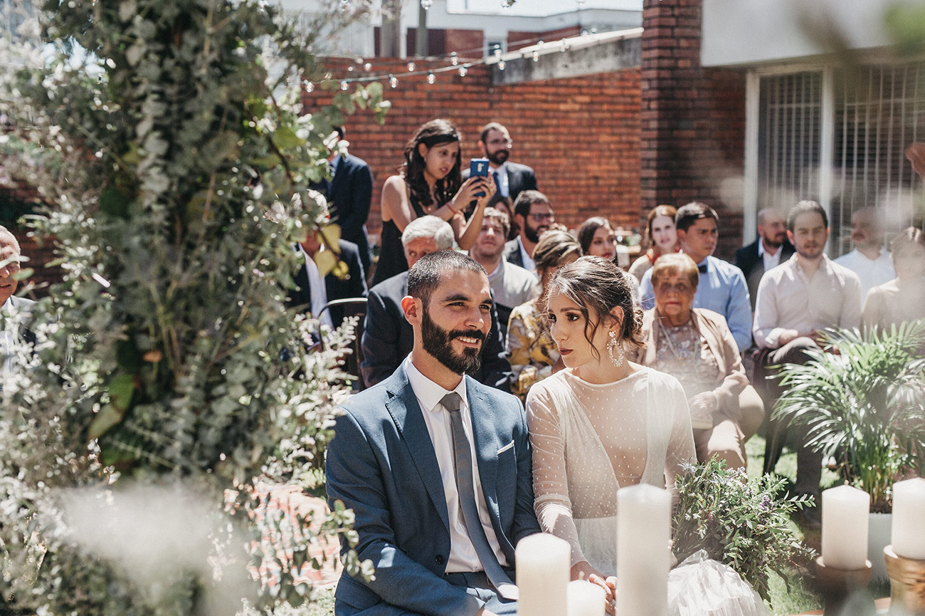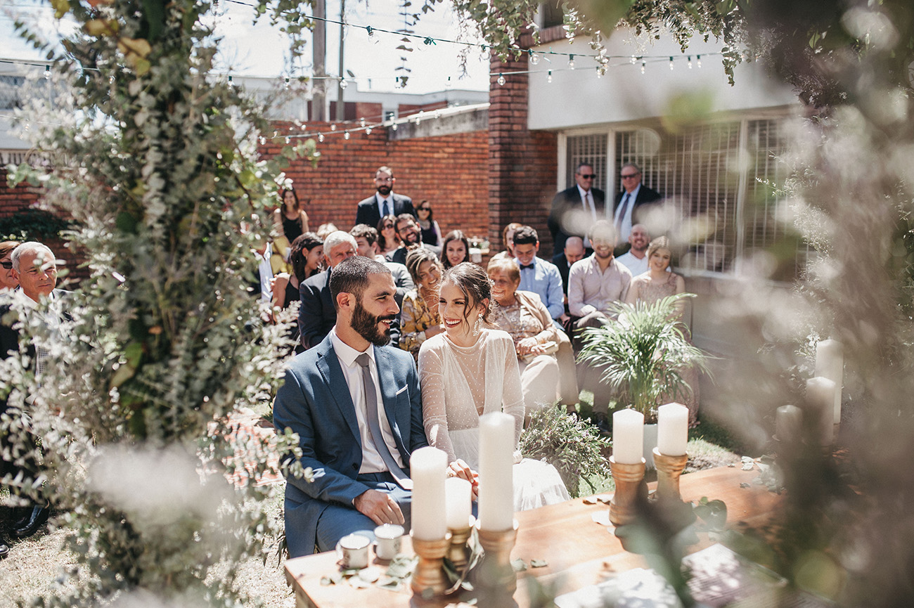 Fue un almuerzo en una mesa larga, al estilo de las familias italianas, donde todos comparten, todos conversan, todos comparten alrededor de la buena comida. En el mismo jardín que ocurrió la ceremonia. Con las mismas sillas. Con los mismos invitados. Una vajilla de tonos azulosos, troncos de madera, velas, luces y mucho follaje verde. Comida árabe, para recordar las raíces de la familia de él. Postre árabe, hecho por el papá de Raschid. También cheesecake, para darle gusto a ella, que estudió hace un tiempo pastelería en el Instituto Mariano Moreno y es muy exigente cuando se trata de sabores. Fue una velada de recarga para el alma. Fue una conversación de todos con todos. Fue un recordatorio de que la familia es la manifestación del amor.