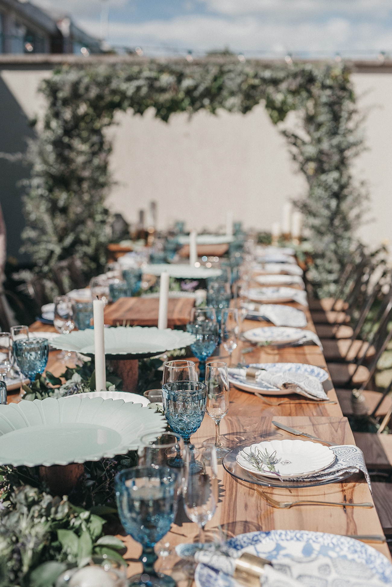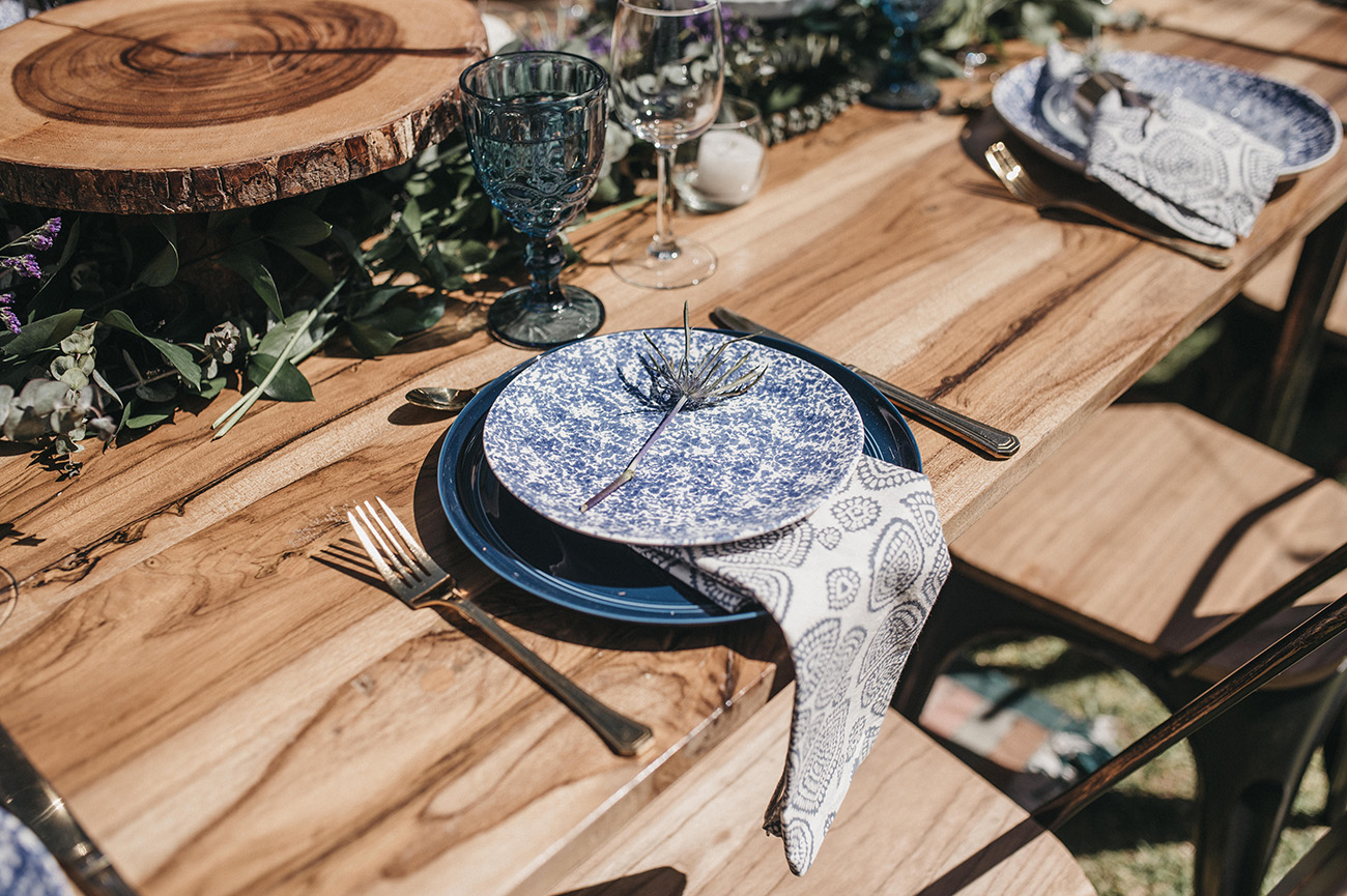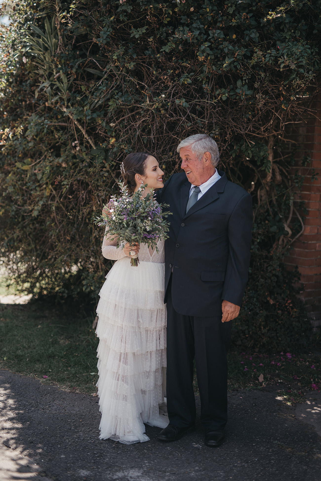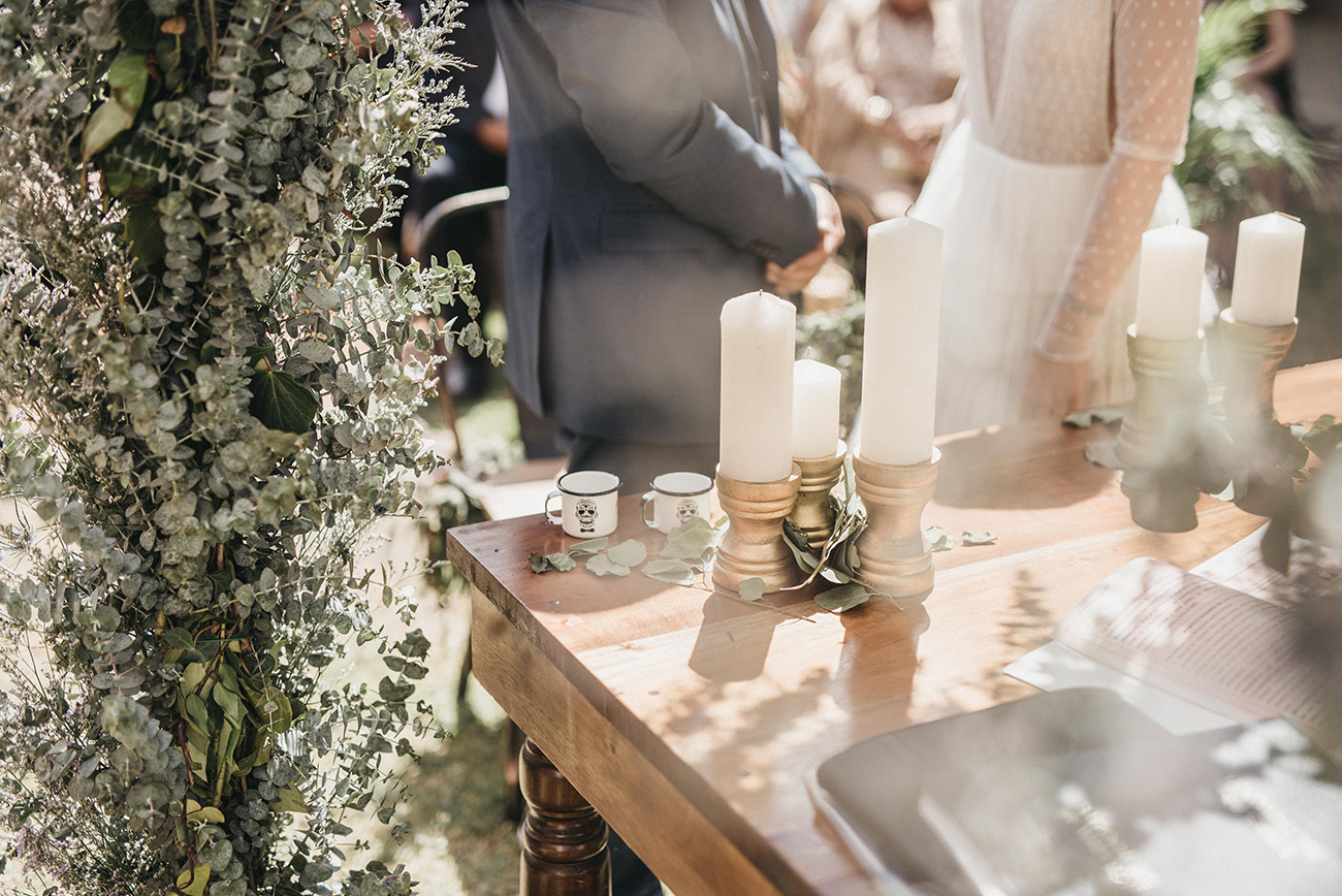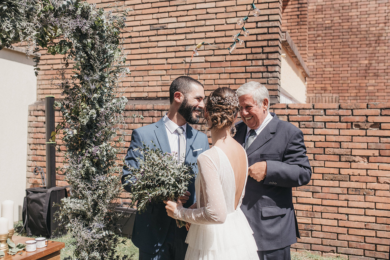 Fue un almuerzo en una mesa larga, al estilo de las familias italianas, donde todos comparten, todos conversan, todos comparten alrededor de la buena comida. En el mismo jardín que ocurrió la ceremonia. Con las mismas sillas. Con los mismos invitados. Una vajilla de tonos azulosos, troncos de madera, velas, luces y mucho follaje verde. Comida árabe, para recordar las raíces de la familia de él. Postre árabe, hecho por el papá de Raschid. También cheesecake, para darle gusto a ella, que estudió hace un tiempo pastelería en el Instituto Mariano Moreno y es muy exigente cuando se trata de sabores. Fue una velada de recarga para el alma. Fue una conversación de todos con todos. Fue un recordatorio de que la familia es la manifestación del amor.