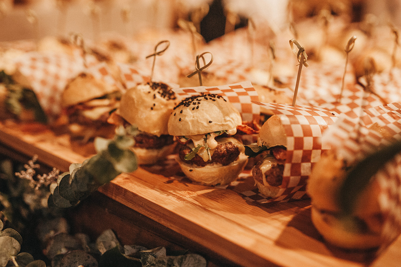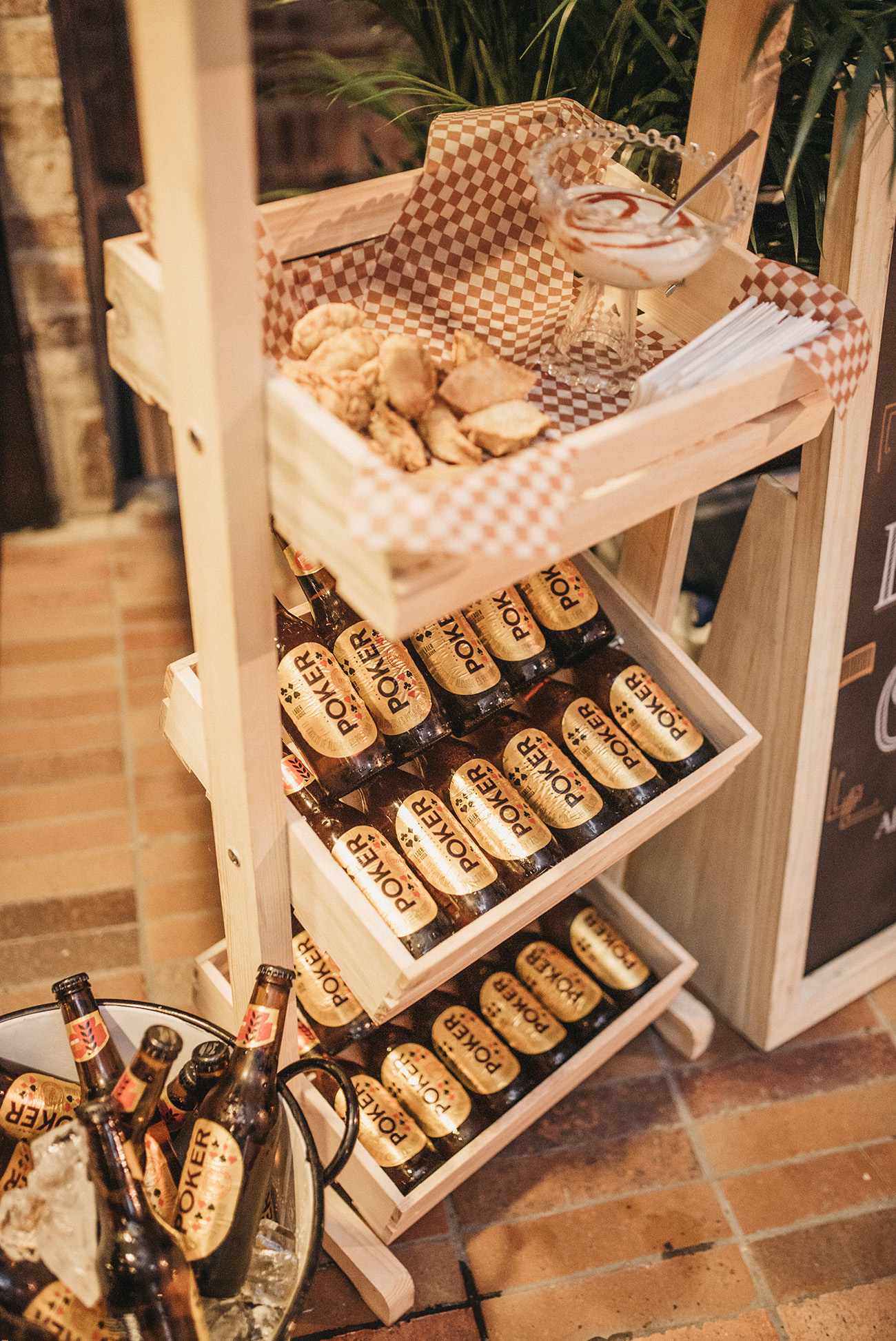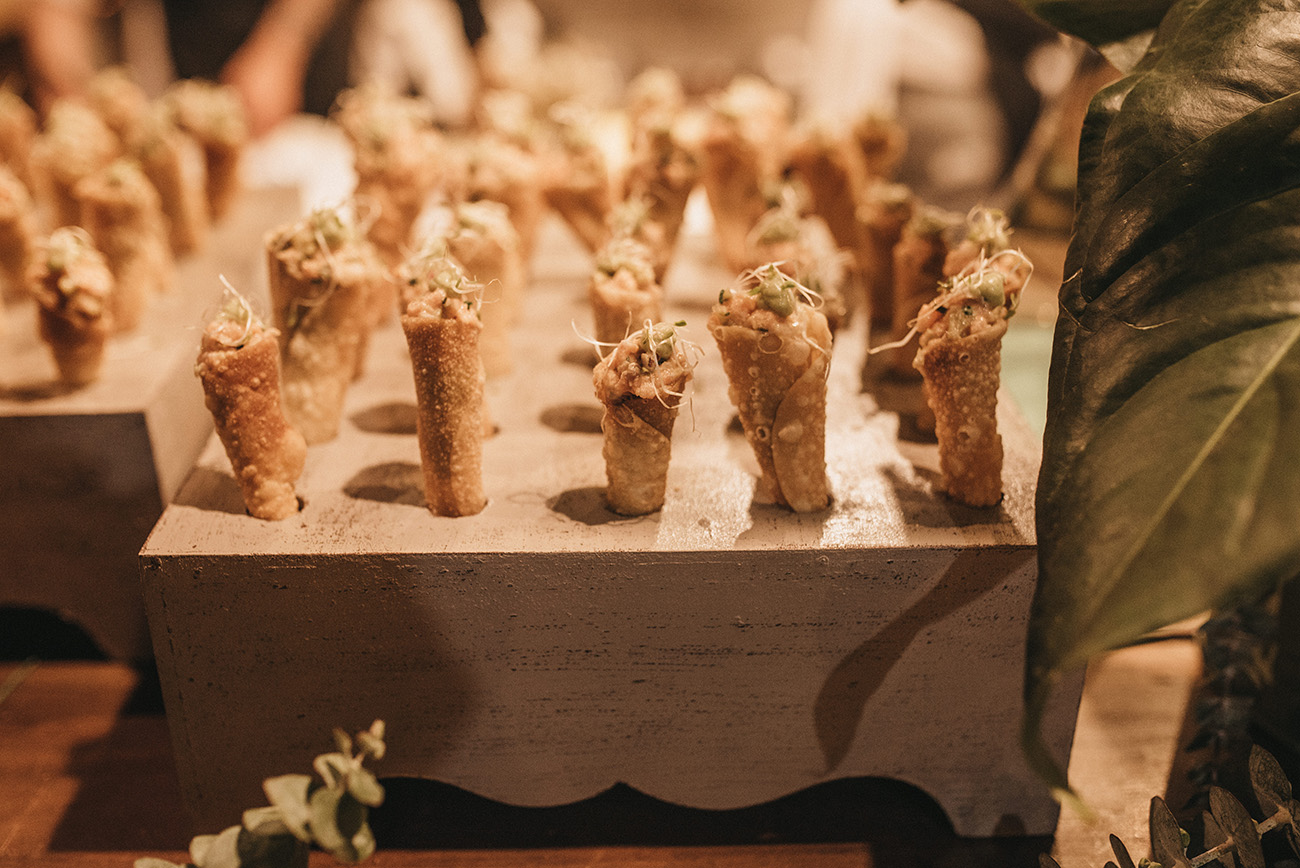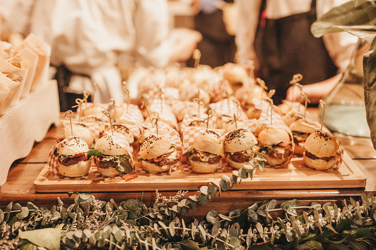 Lámparas modernas, mucho follaje verde, muchas matas, mucha luz. Una bodega industrial, con decoración industrial. Un letrero en neón con un Love me curveado. Otro letrero para las donuts colgadas en tabla. Para los que llegaban: empanadas de lechona (ella es de Ibagué) y cerveza. En el intermedio: croquetas de hongos y quesos, conitos de tartar de salmón y bolitas de filet-mignon. Como plato fuerte: mini hamburguesas de Angus con chips de tubérculos colombianos. Todo con la mano, todo fácil de comer, todo entregado por meseros. Nada de vajillas, de platos a la mesa, de puestos marcados. Libertad, para comer, para bailar, para abrazar, para celebrar, para sentir la música.