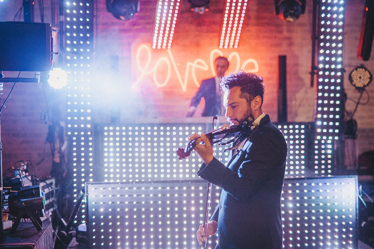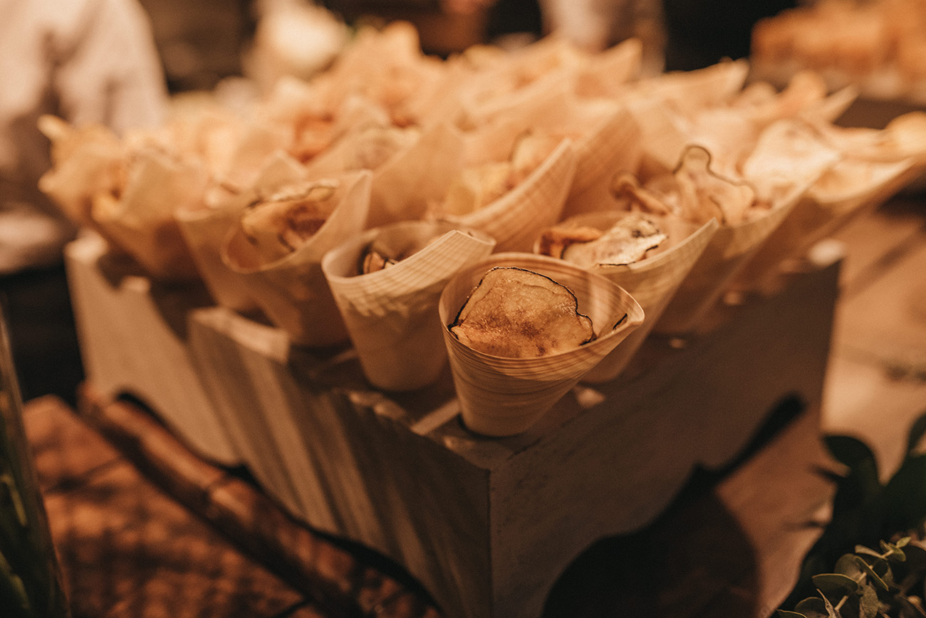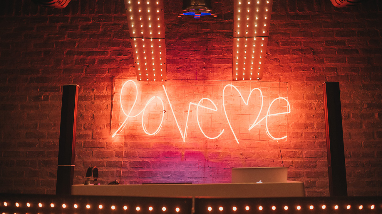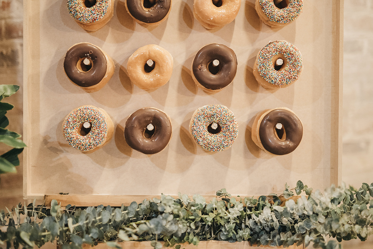 Lámparas modernas, mucho follaje verde, muchas matas, mucha luz. Una bodega industrial, con decoración industrial. Un letrero en neón con un Love me curveado. Otro letrero para las donuts colgadas en tabla. Para los que llegaban: empanadas de lechona (ella es de Ibagué) y cerveza. En el intermedio: croquetas de hongos y quesos, conitos de tartar de salmón y bolitas de filet-mignon. Como plato fuerte: mini hamburguesas de Angus con chips de tubérculos colombianos. Todo con la mano, todo fácil de comer, todo entregado por meseros. Nada de vajillas, de platos a la mesa, de puestos marcados. Libertad, para comer, para bailar, para abrazar, para celebrar, para sentir la música.