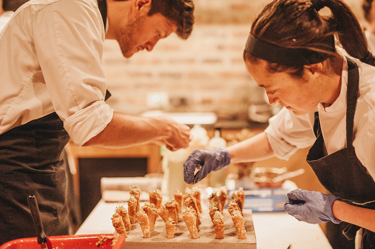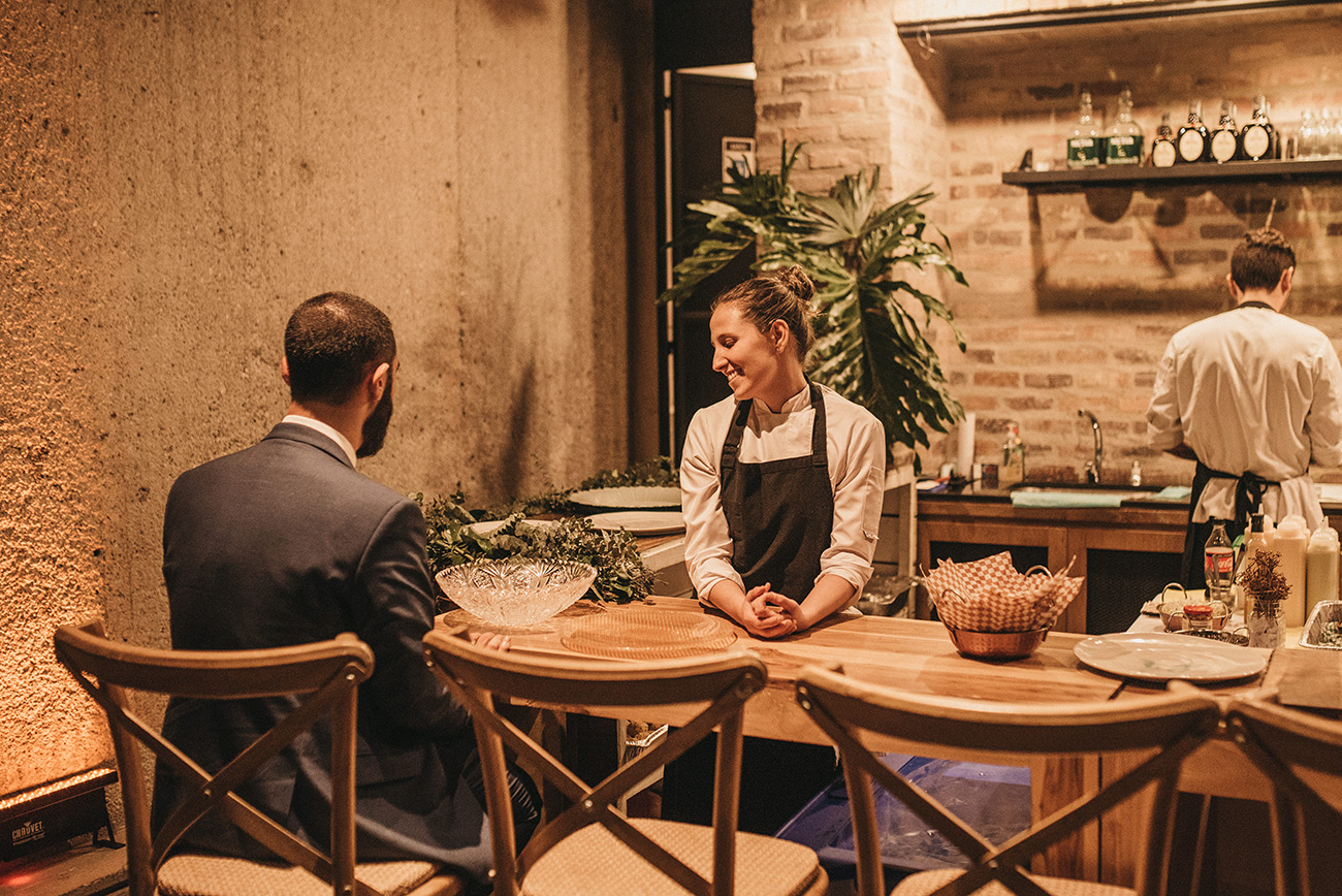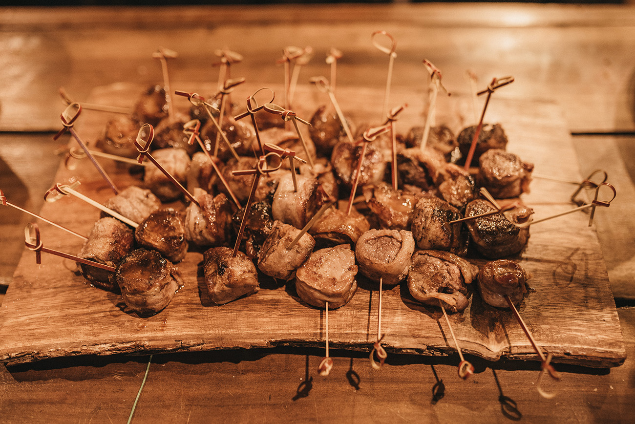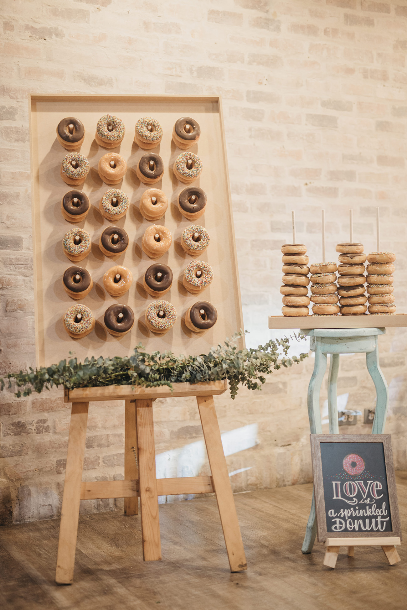 Lámparas modernas, mucho follaje verde, muchas matas, mucha luz. Una bodega industrial, con decoración industrial. Un letrero en neón con un Love me curveado. Otro letrero para las donuts colgadas en tabla. Para los que llegaban: empanadas de lechona (ella es de Ibagué) y cerveza. En el intermedio: croquetas de hongos y quesos, conitos de tartar de salmón y bolitas de filet-mignon. Como plato fuerte: mini hamburguesas de Angus con chips de tubérculos colombianos. Todo con la mano, todo fácil de comer, todo entregado por meseros. Nada de vajillas, de platos a la mesa, de puestos marcados. Libertad, para comer, para bailar, para abrazar, para celebrar, para sentir la música.