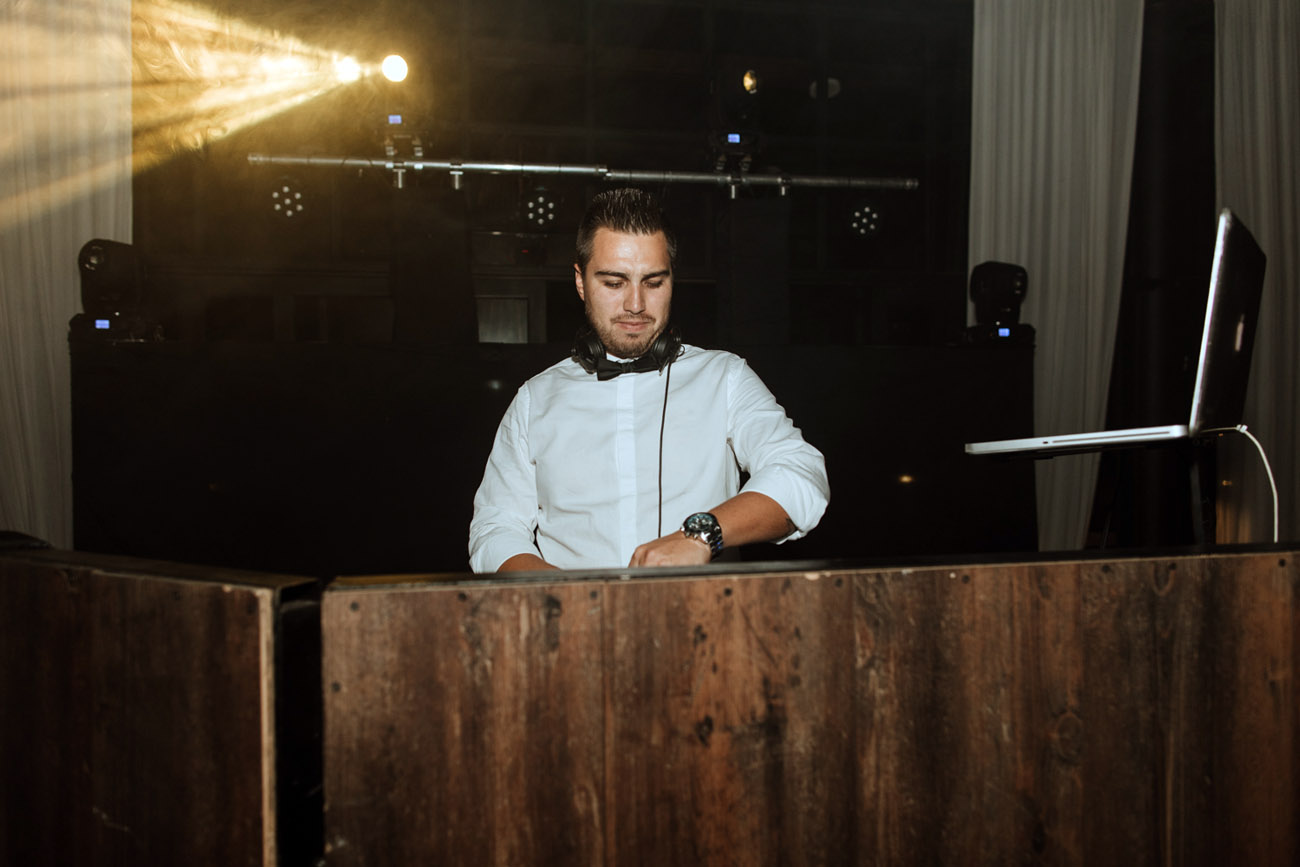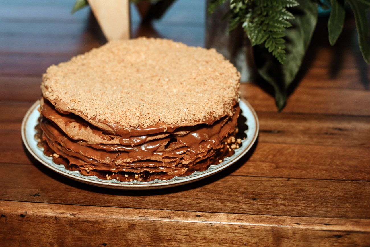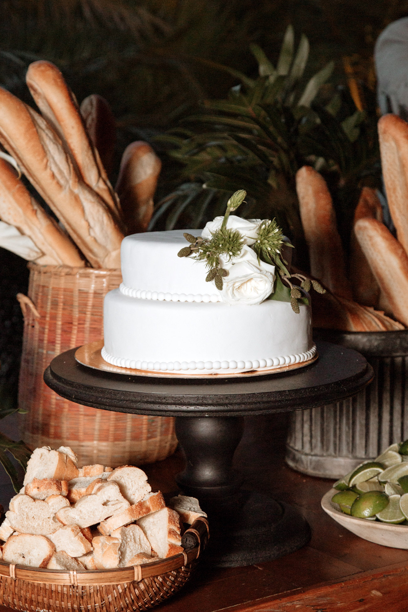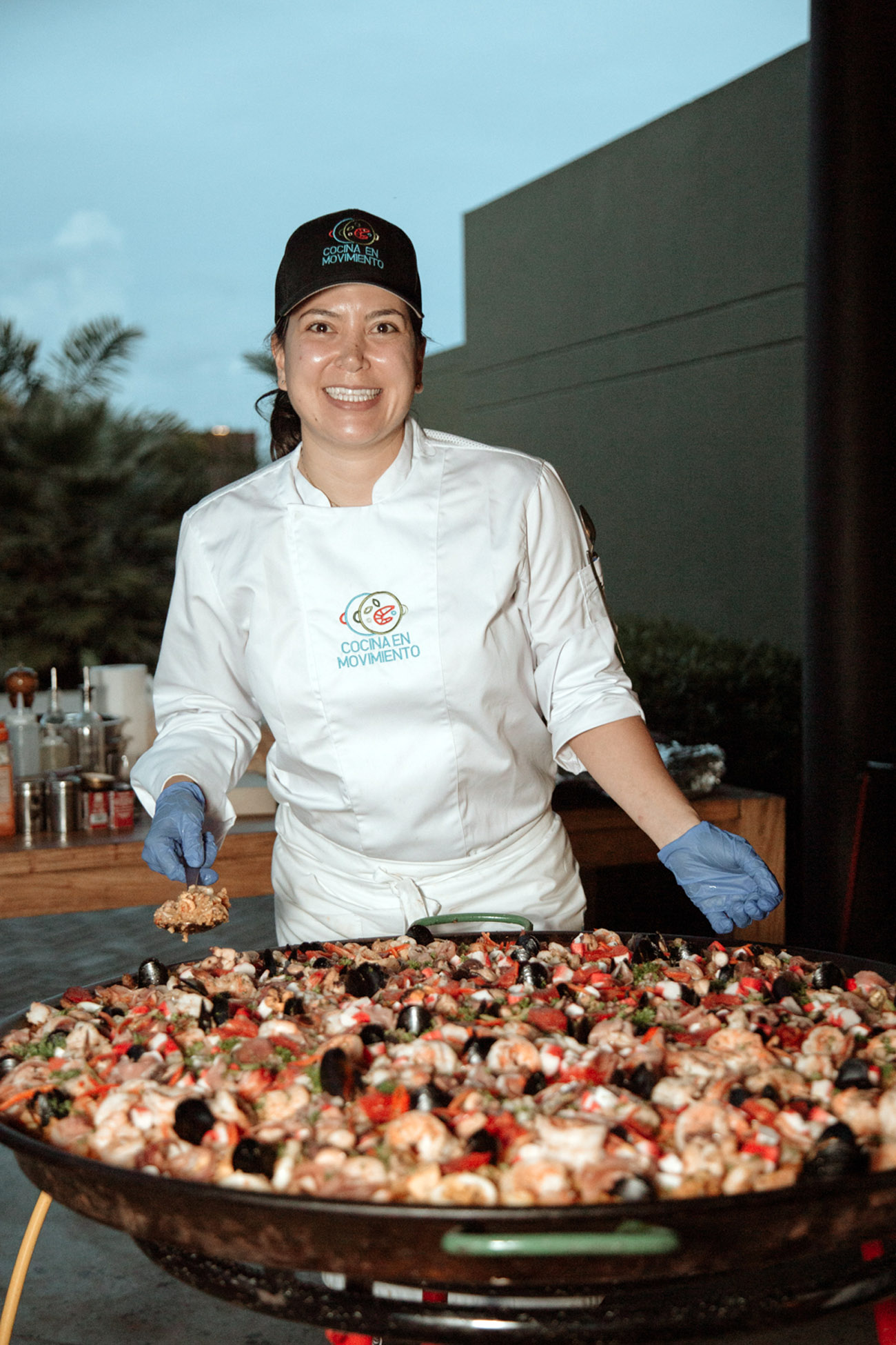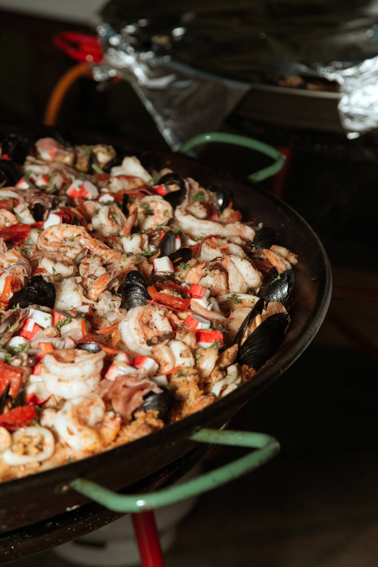 Siguiendo con el homenaje y el gusto por lo mediterráneo, la fiesta empezó temprano: ¡con paella! Una especie de show en vivo a cargo de Cocina en Movimiento, donde en vez de tener un plato servido, cada invitado se acercaba a elegir la cantidad y el sabor (mixta o vegetariana). La sección dulce, otra vez a cargo de Alejandro: mini brownies melcochudos, torta de zanahoria con arequipe, torta de chocolate con arequipe, mikao de arequipe y bizcocho de novia para los más tradicionales. Sí: le encanta el arequipe. Es capaz de comerse un tarro entero solo. Mientras tanto, Juan Astronauta tocó el saxofón como él suele hacerlo: magistral. La noche —si de gastronomía se trata— terminó con miniperritos. ¡No fallan!