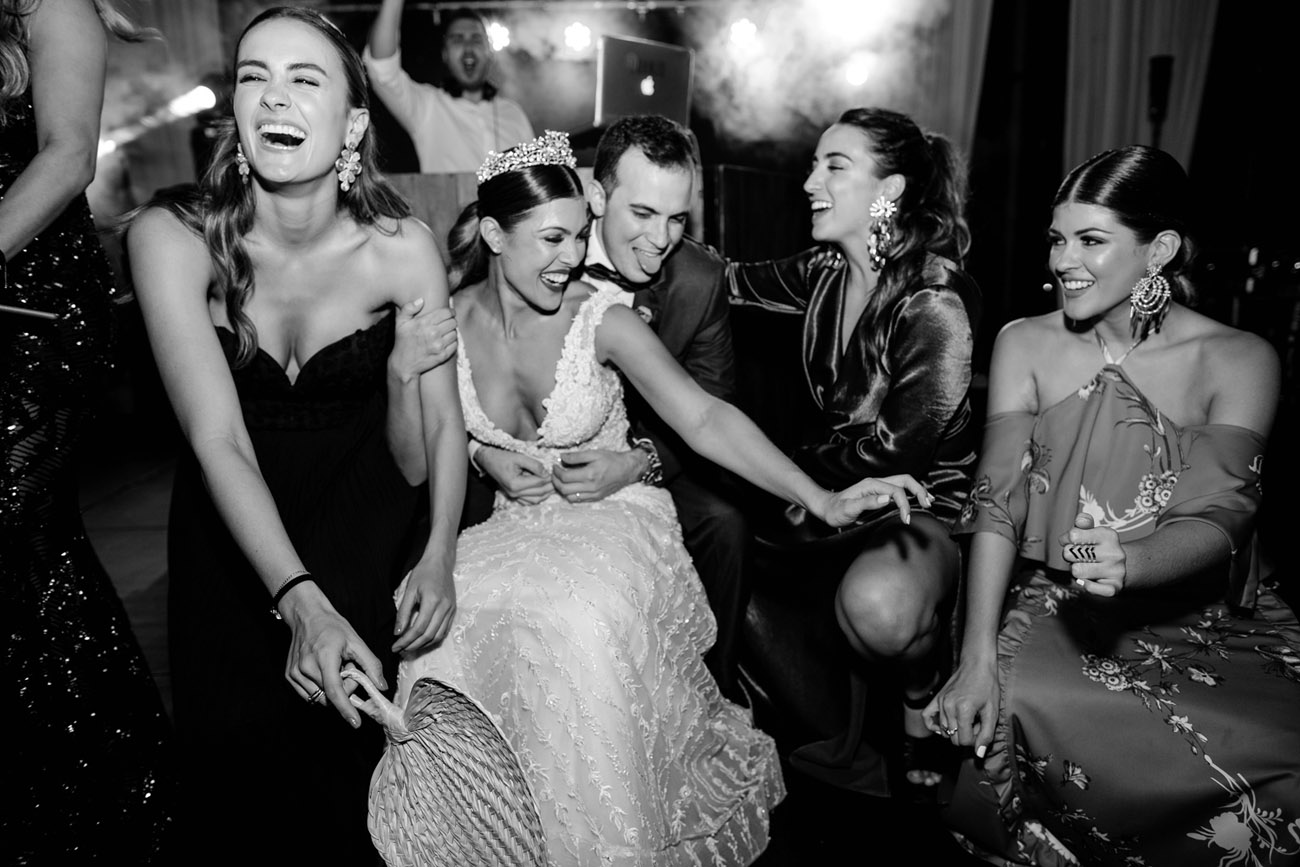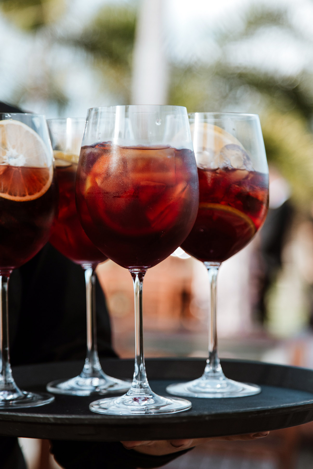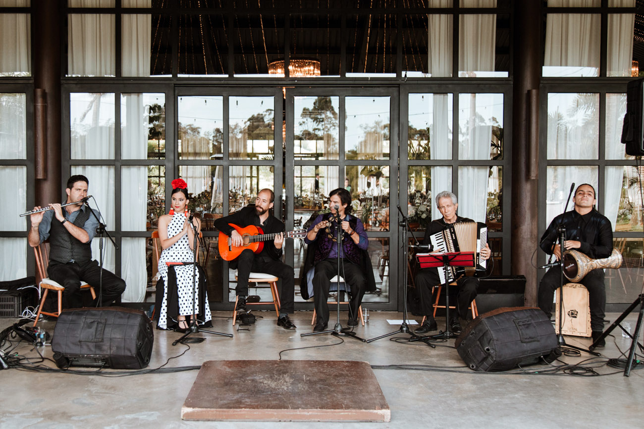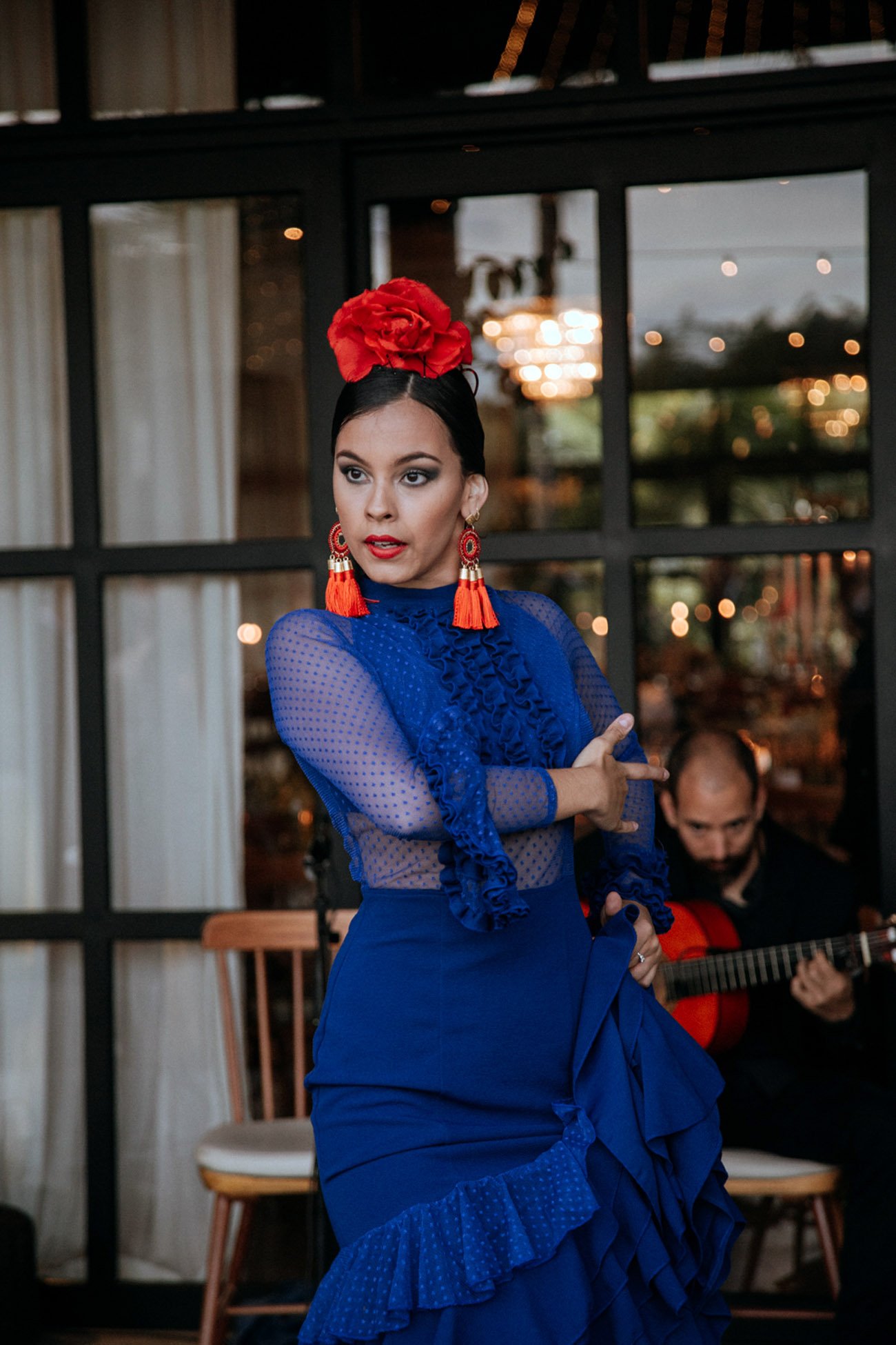 Ese amor que, ya dijimos, guarda un inmenso gusto por España. De ahí que esa tarde de verano estuviera ambientada por Sentir Flamenco, un grupo de músicos que cantan y tocan música española. De ahí que también estuviera una mujer —muy sevillana— bailando como suele bailarse esas melodías: con el sentir de las palmas y los pies. De ahí que no faltaran los abanicos (el de ella con brillantes alrededor), los canapés ibéricos y el tinto de verano, tan icónico de aquellas tierras. Los mini Mimo’s no eran muy afines a la inspiración, eran, mejor, la excepción de la regla, pero fue una idea de Alejandro que disfruta tanto el dulce. Al final, el amor es eso: una suma de pequeñas excepciones que nos hacen felices.
