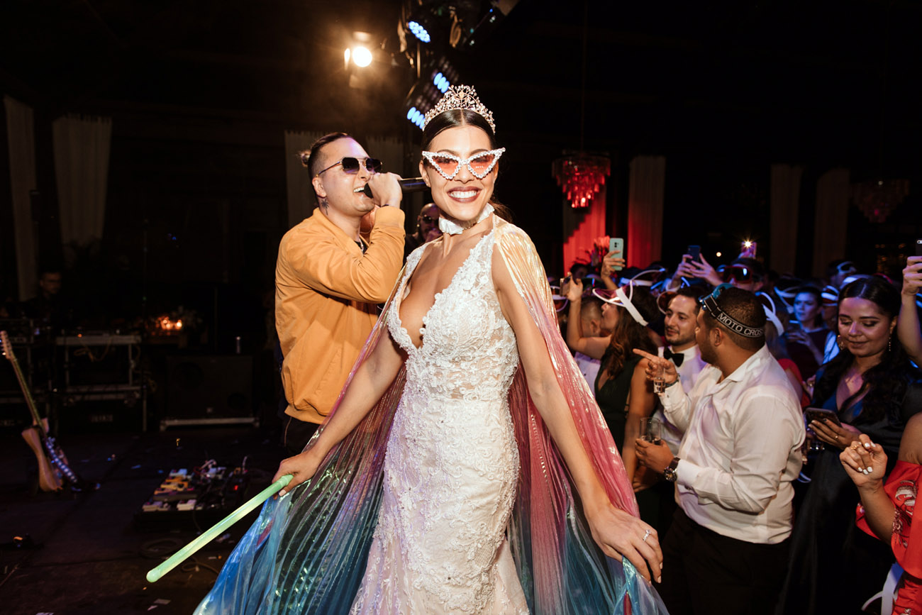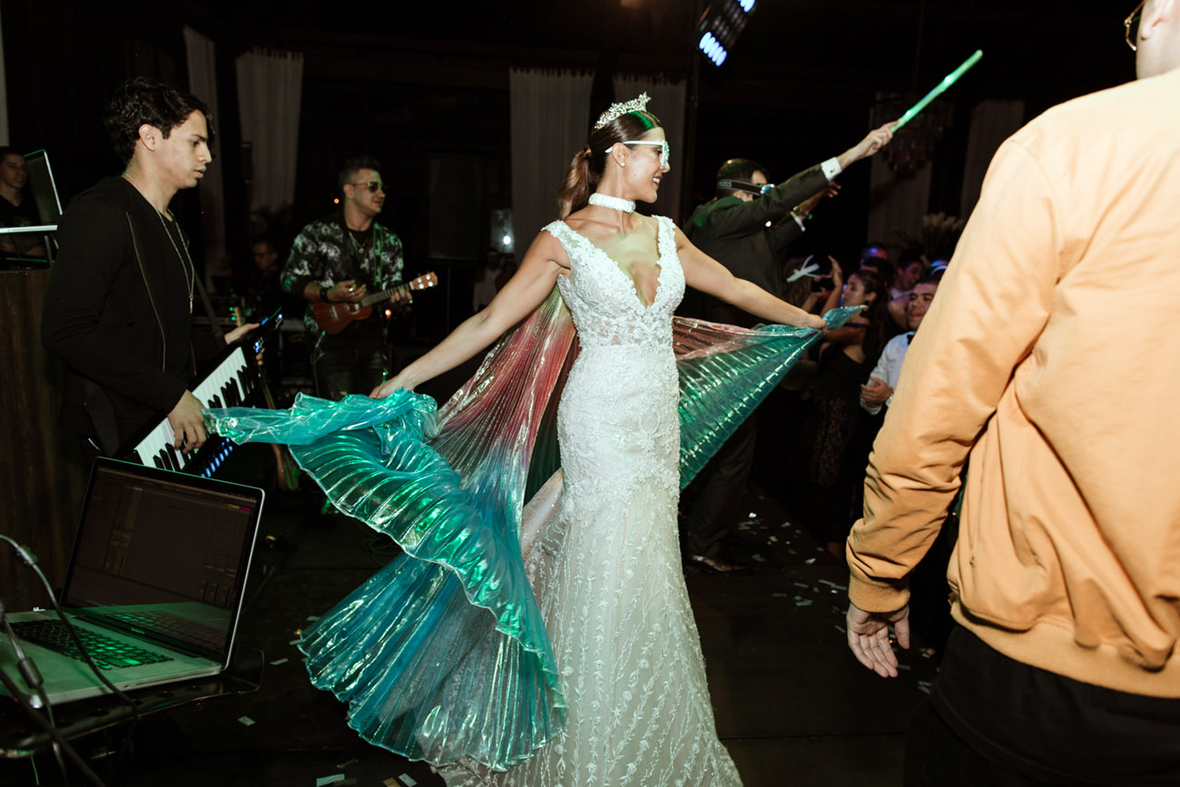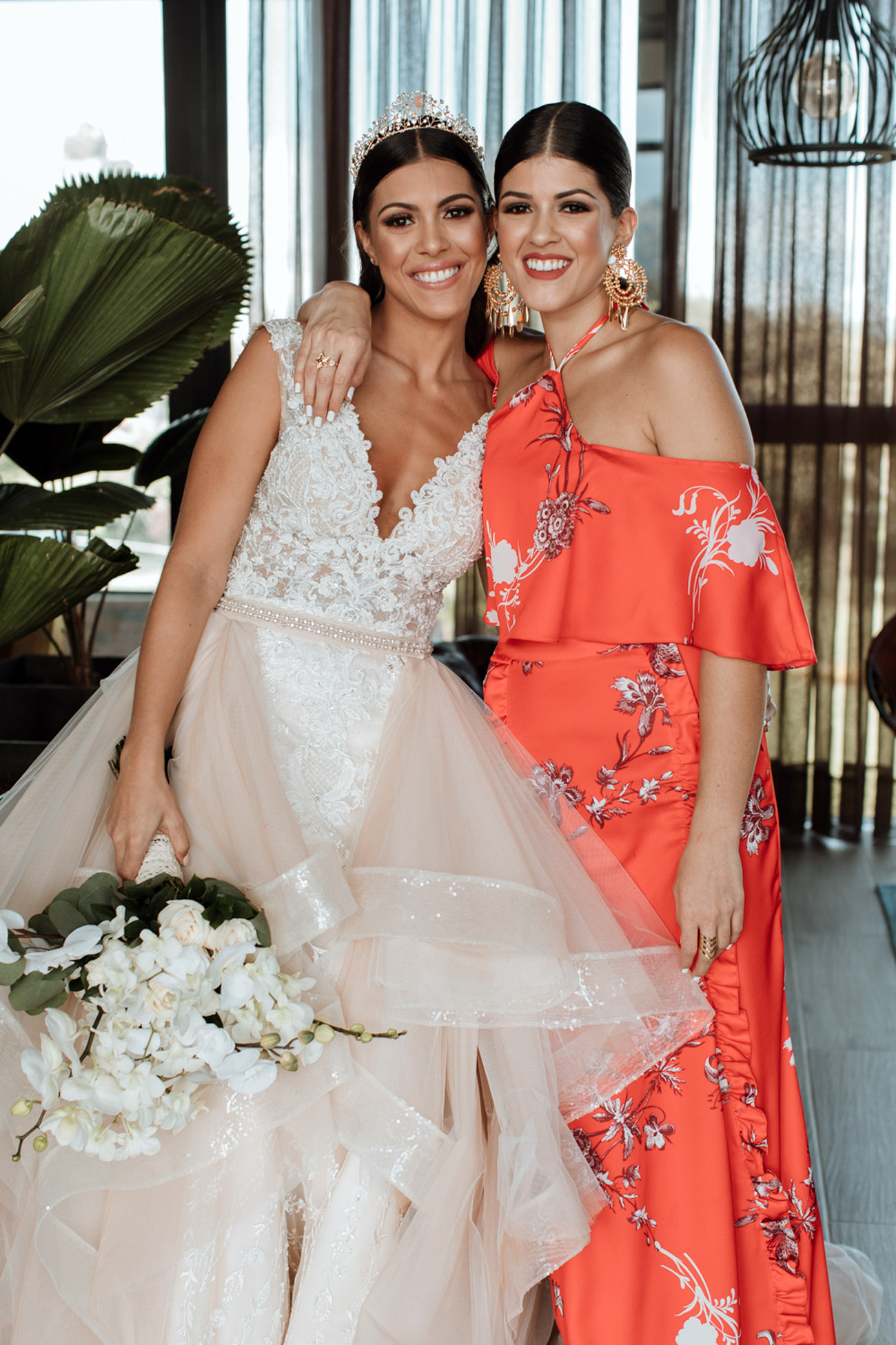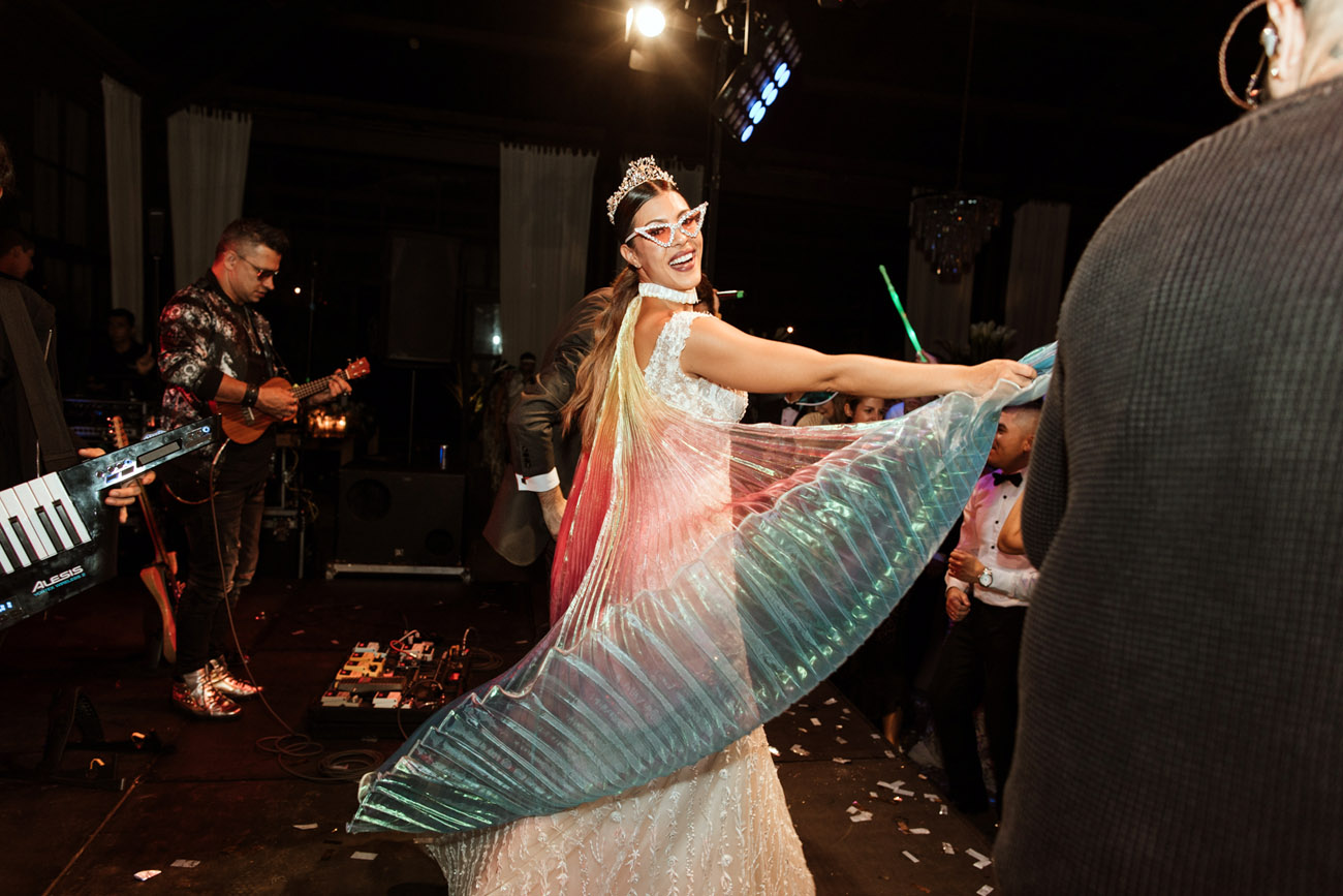 Para la ceremonia y las primeras fotos, Andrea tuvo su vestido completo: el de corte de sirena con las capas que le daban una apariencia de realeza. Optó por un peinado hacia atrás con ondas bien formadas y un maquillaje con toques brillantes, pero de colores tierras naturales. Para la fiesta, se quitó las capas y sus cómplices Mandrea y Saimon (que también fueron invitados) le hicieron una cola y unos labios más oscuros. ¡Hora de la parranda!