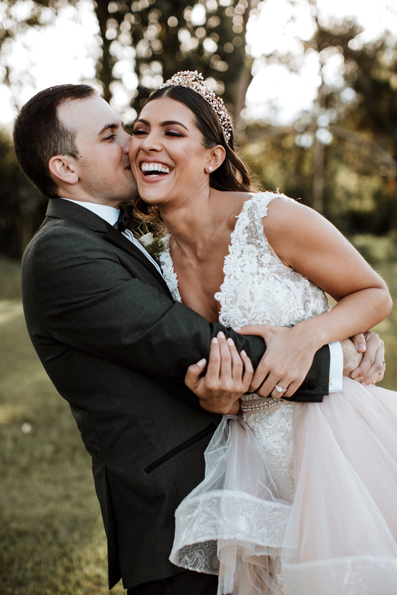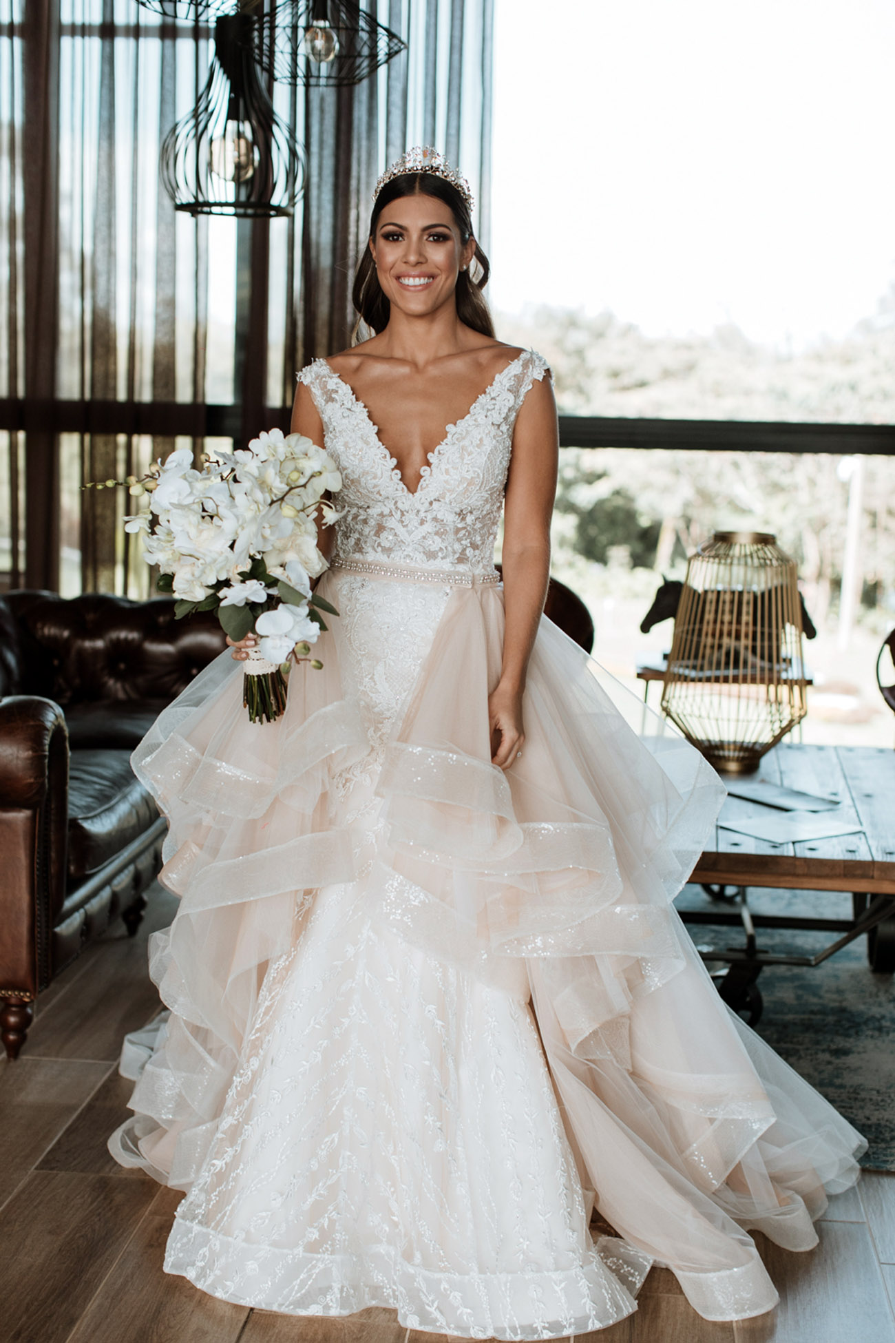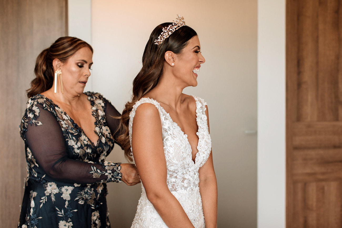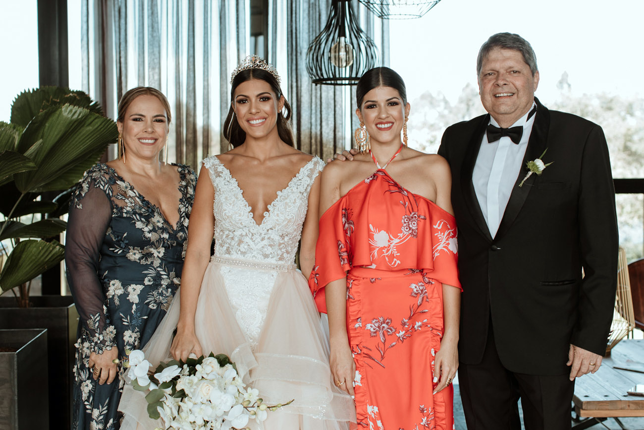 Para la ceremonia y las primeras fotos, Andrea tuvo su vestido completo: el de corte de sirena con las capas que le daban una apariencia de realeza. Optó por un peinado hacia atrás con ondas bien formadas y un maquillaje con toques brillantes, pero de colores tierras naturales. Para la fiesta, se quitó las capas y sus cómplices Mandrea y Saimon (que también fueron invitados) le hicieron una cola y unos labios más oscuros. ¡Hora de la parranda!