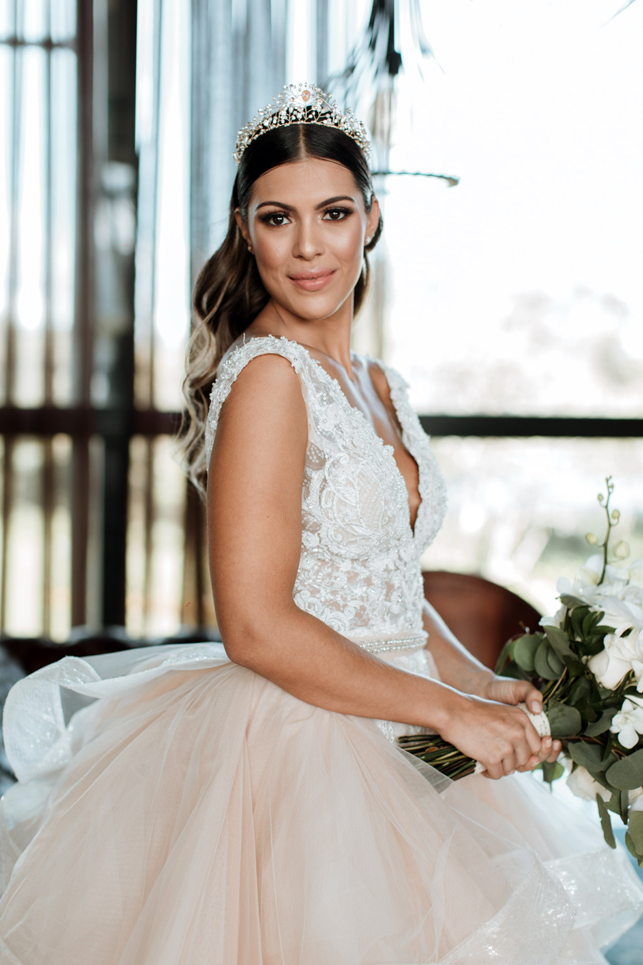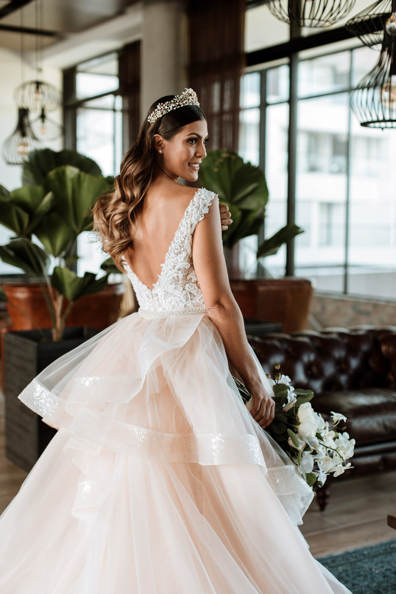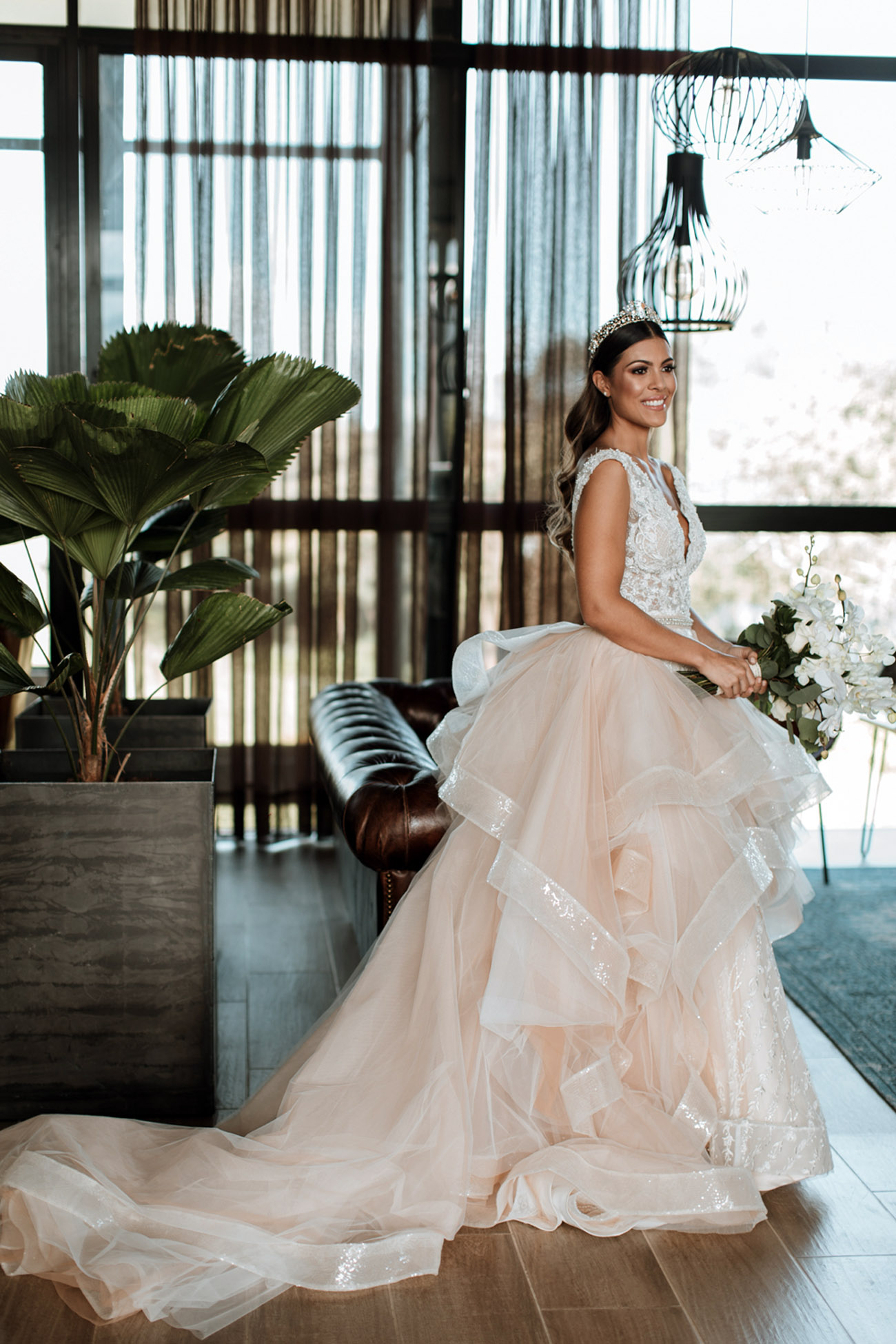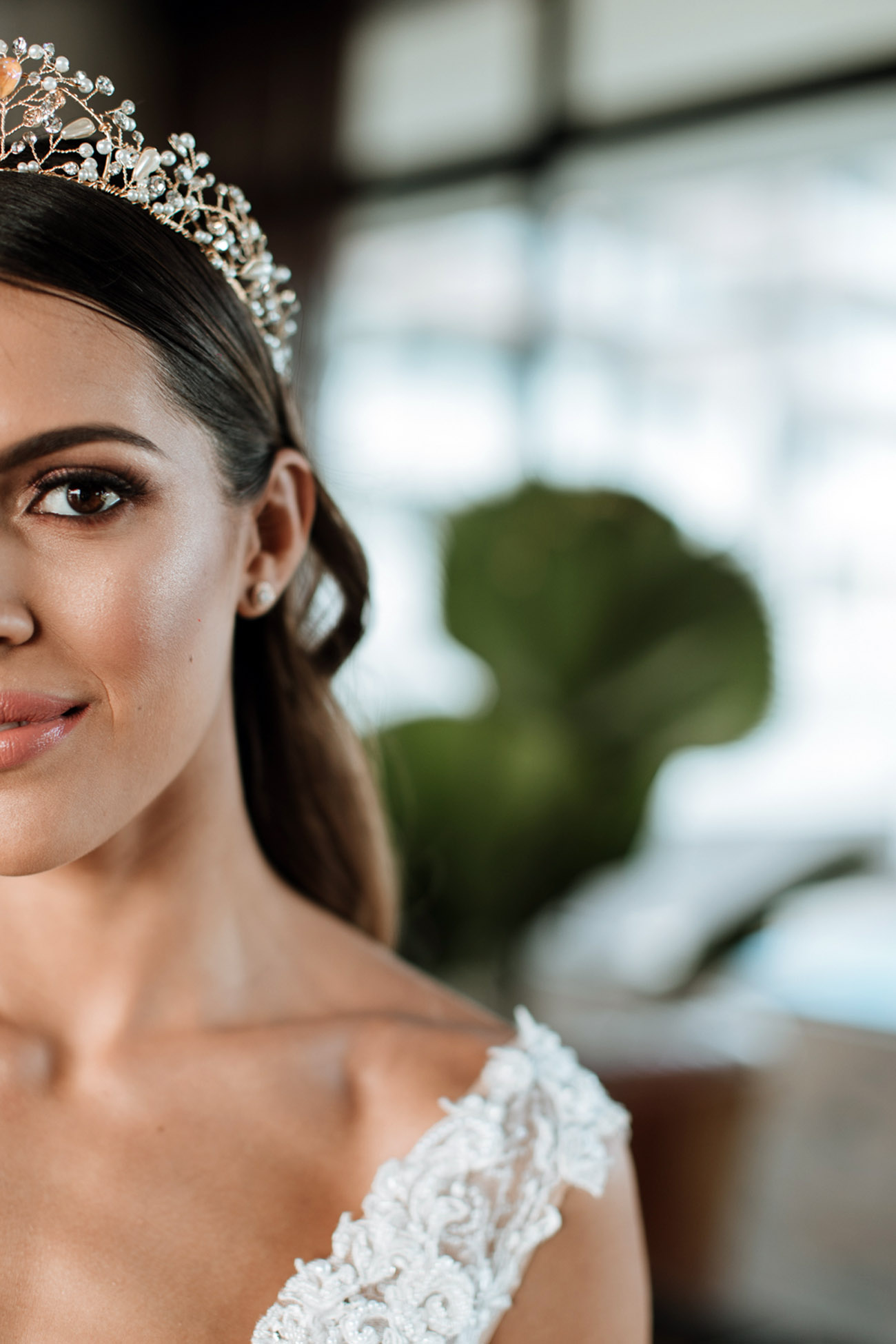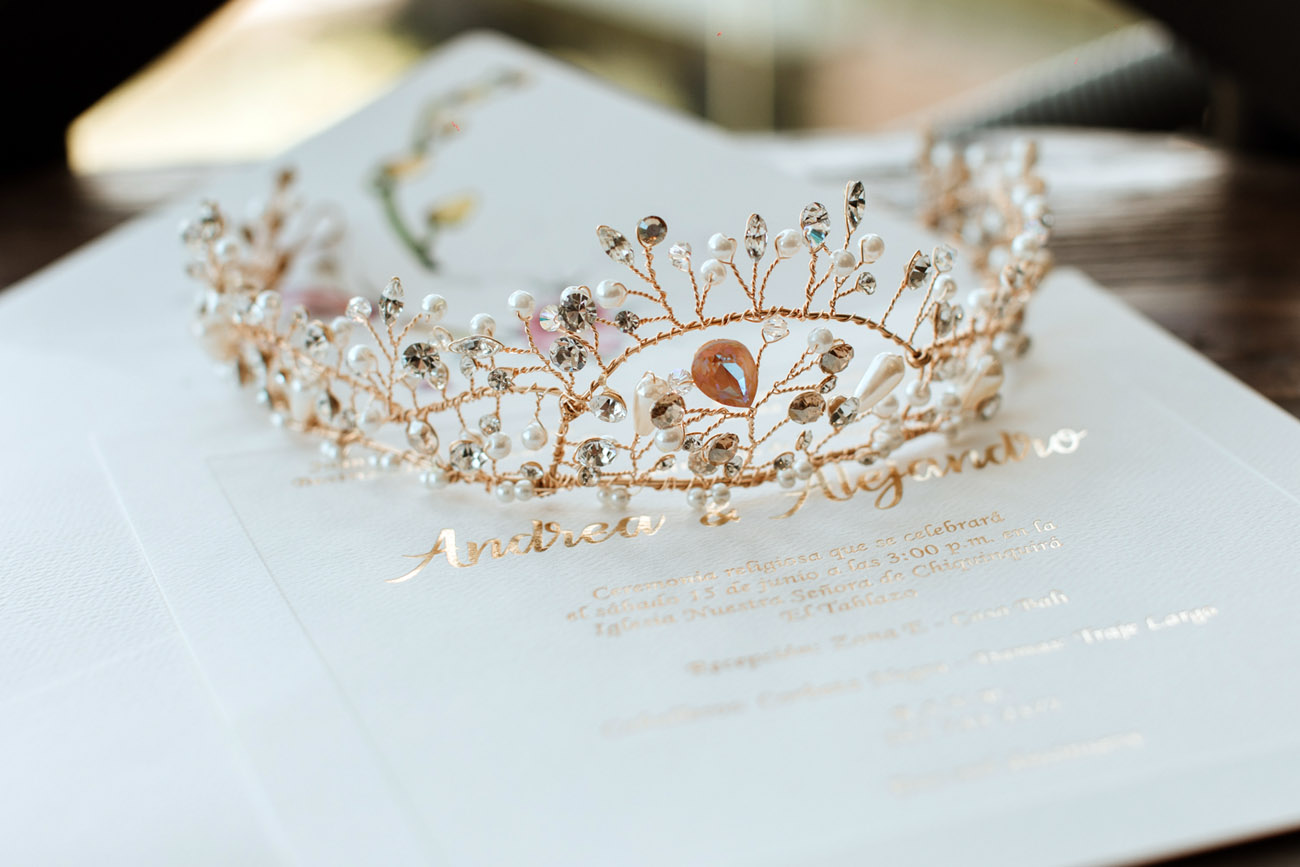A Andrea le gusta la moda. Disfruta armar looks, arreglarse para salir. Tiene un estilo definido, que ha ido creando con el tiempo. Quería verse muy princesa. Lo tenía claro. Por eso, antes que tener vestido, tuvo corona. Una tejida a mano, con estructura en bronce y enchapada en oro, con cristales de swarovski dorados, plateados y ópalo, hecha por Zawadzky. Aprovechó un viaje a Bogotá para medirse vestidos. Se midió muchísimos. No lo encontró.