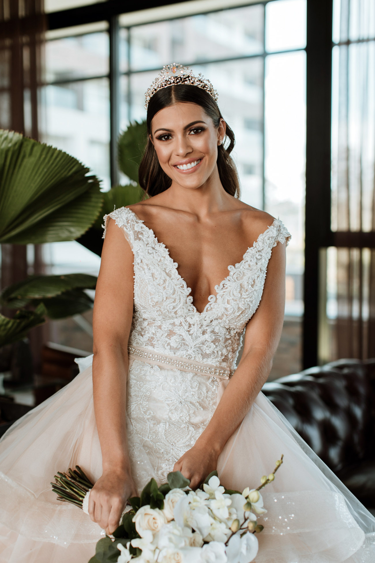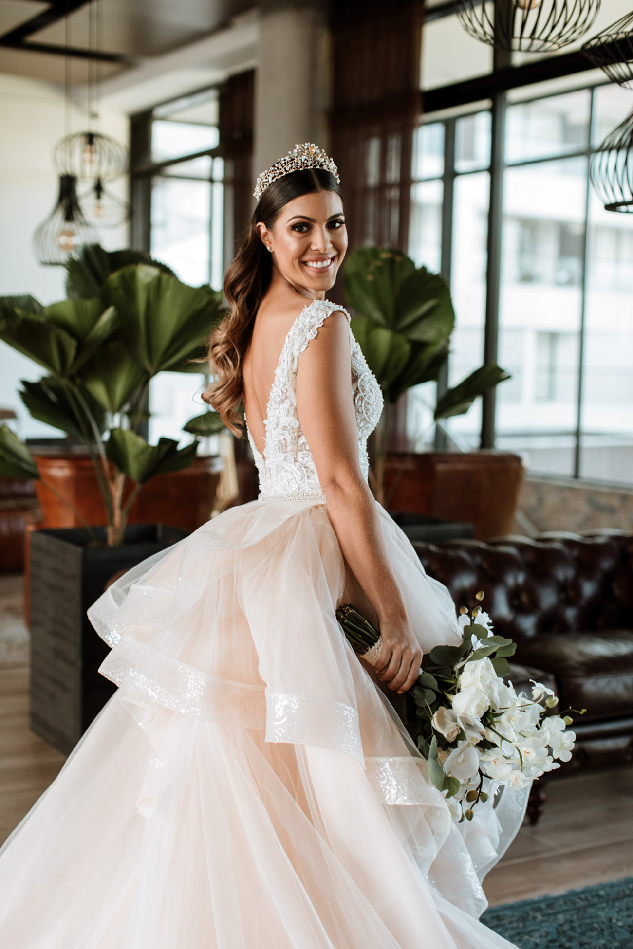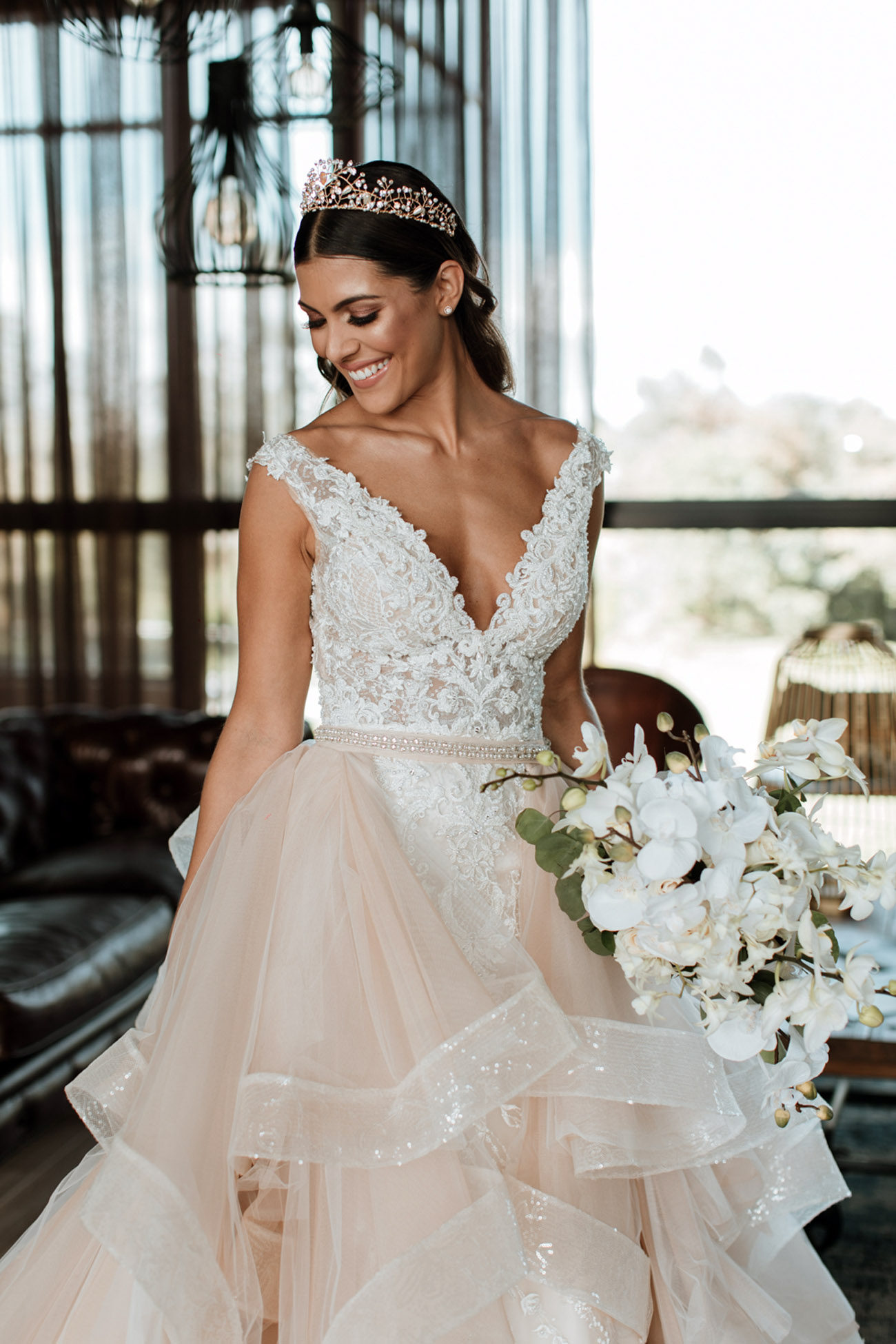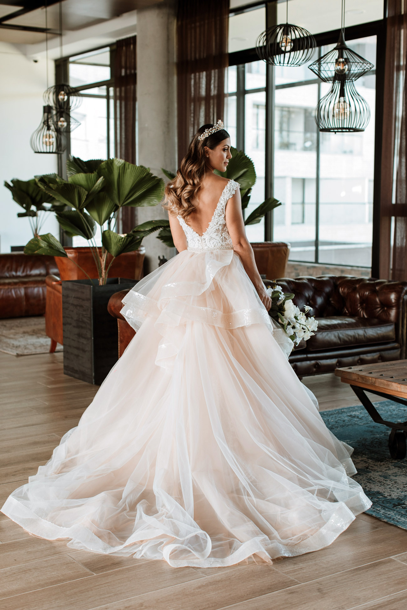 A Andrea le gusta la moda. Disfruta armar looks, arreglarse para salir. Tiene un estilo definido, que ha ido creando con el tiempo. Quería verse muy princesa. Lo tenía claro. Por eso, antes que tener vestido, tuvo corona. Una tejida a mano, con estructura en bronce y enchapada en oro, con cristales de swarovski dorados, plateados y ópalo, hecha por Zawadzky. Aprovechó un viaje a Bogotá para medirse vestidos. Se midió muchísimos. No lo encontró.