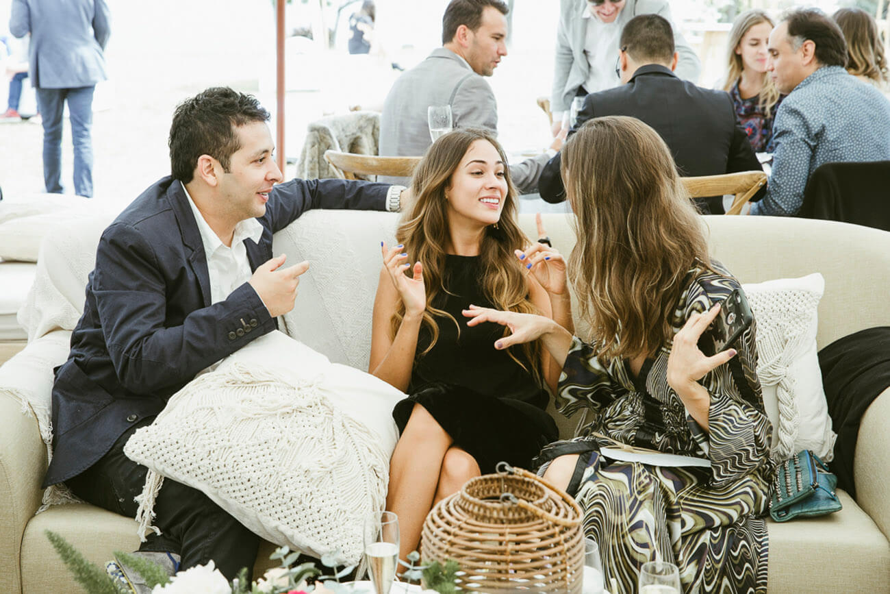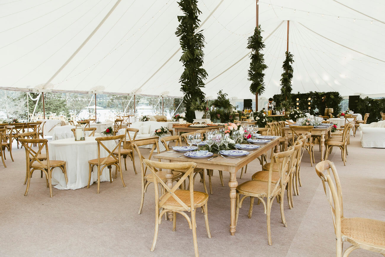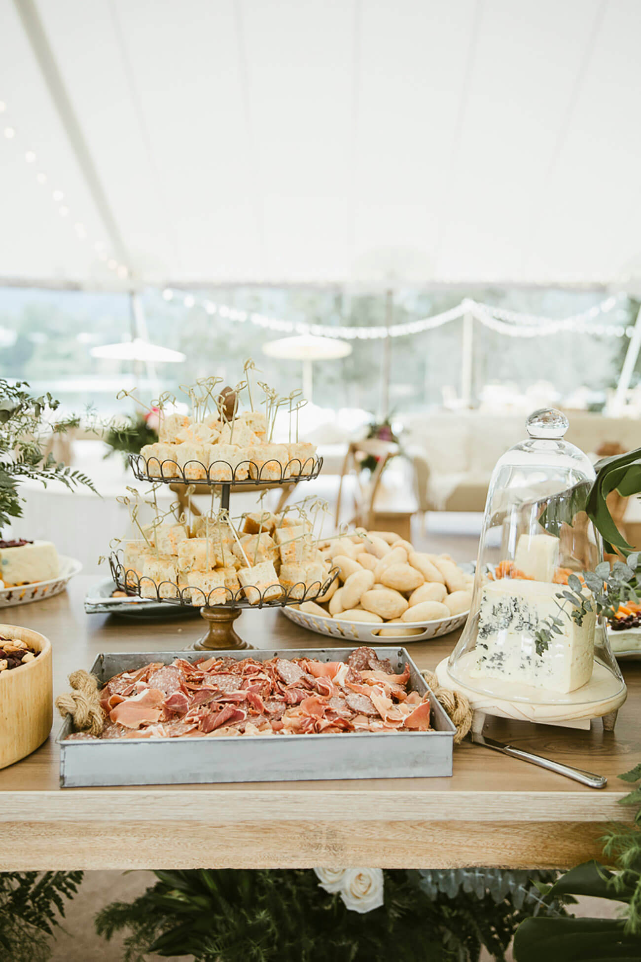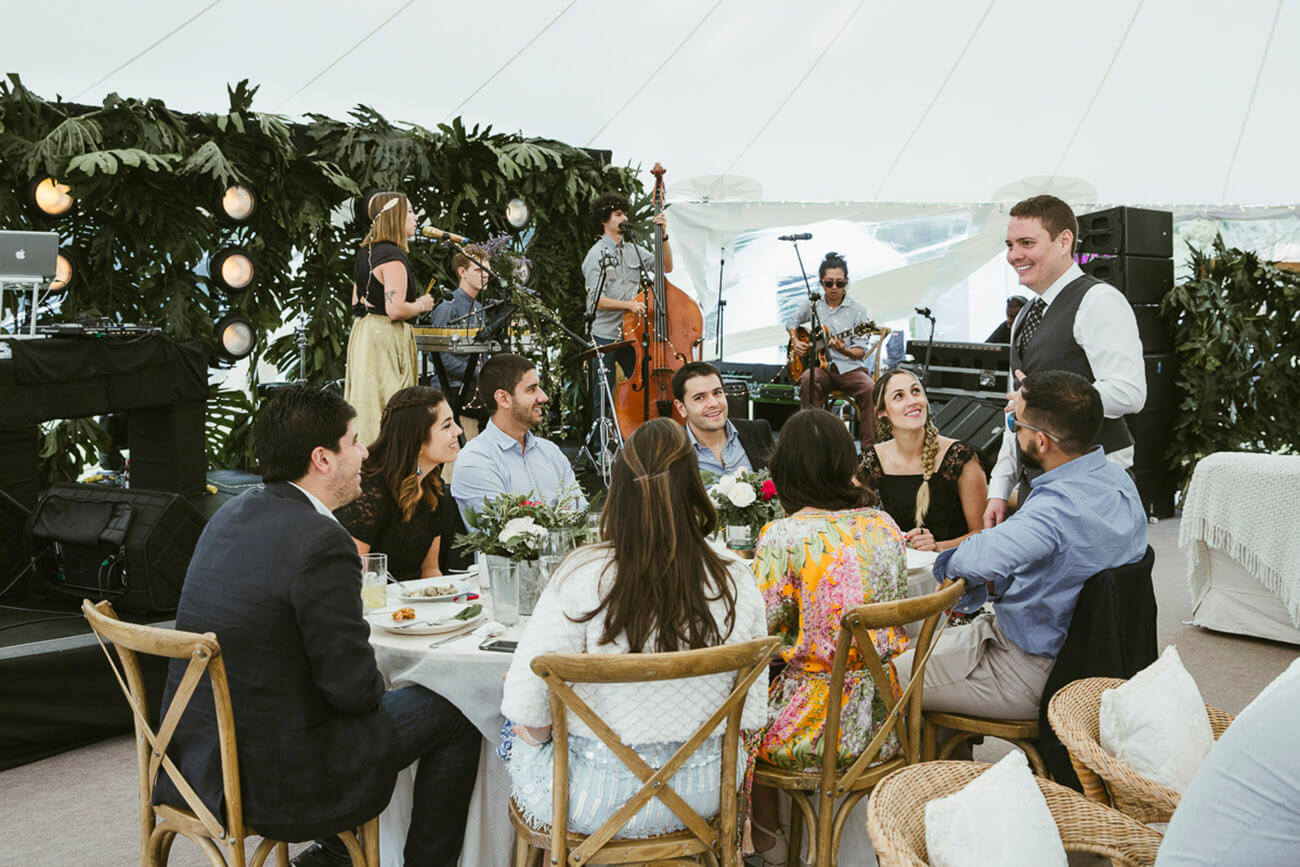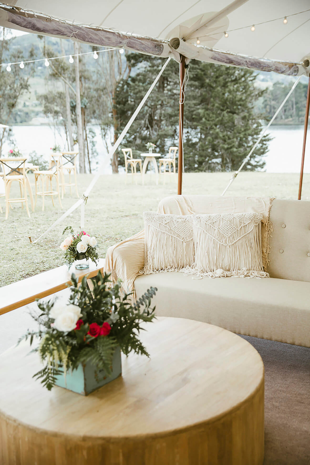 La idea inicial era ofrecer un desayuno tipo brunch, pero, ¿cómo no sacarle provecho y disfrutar más tiempo de esa carpa tan linda en medio de ese paisaje? Así que decidieron crear toda una experiencia de pequeños platos para todo el día, con una atmósfera pensada para compartir, como les gusta en su vida cotidiana. “No queríamos mesas que estuvieran marcadas y que obligaran a los invitados a sentarse en la misma todo el tiempo, ya que iban a ser muchos pequeños platos y no un único plato principal. Como tenemos muchos amigos en común, queríamos que no existiera tanto protocolo y que hubiera salas y sillones creando pequeños grupos de amigos a su antojo. También había mesas al aire libre y otras puestas para los familiares o personas que querían algo más formal”.