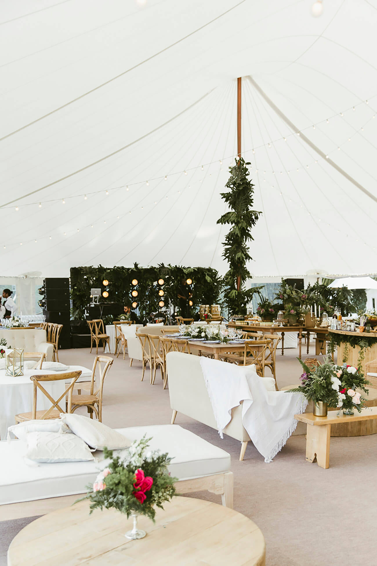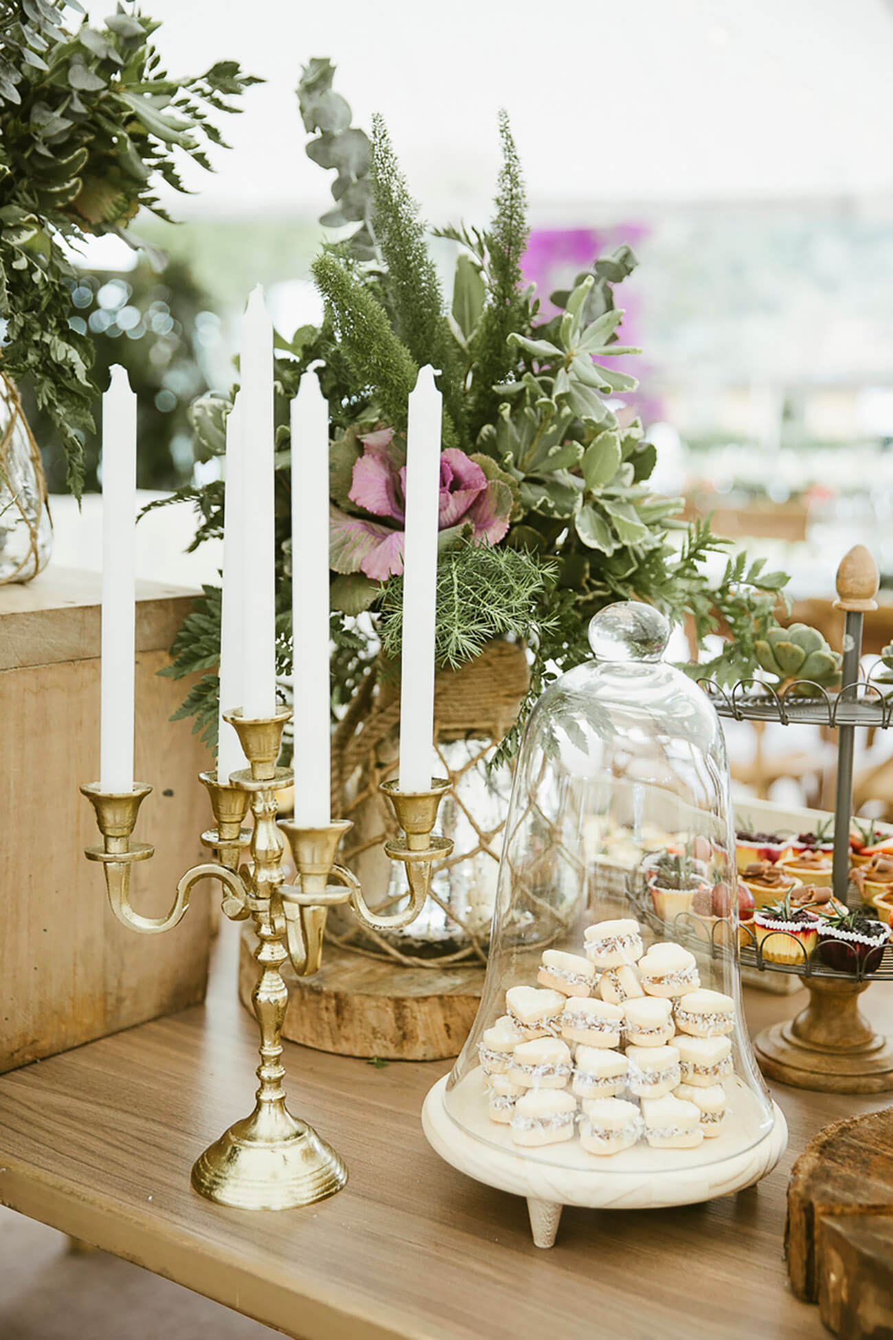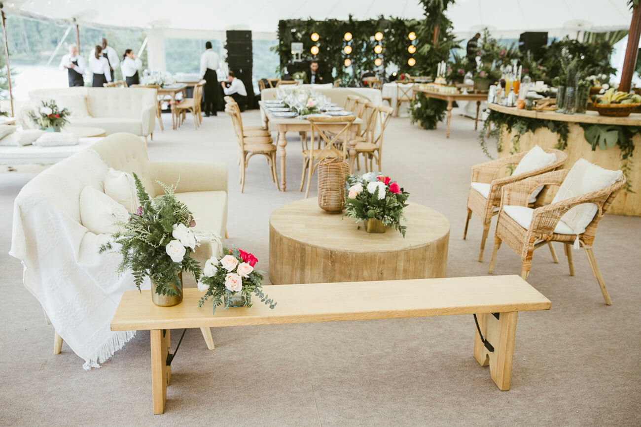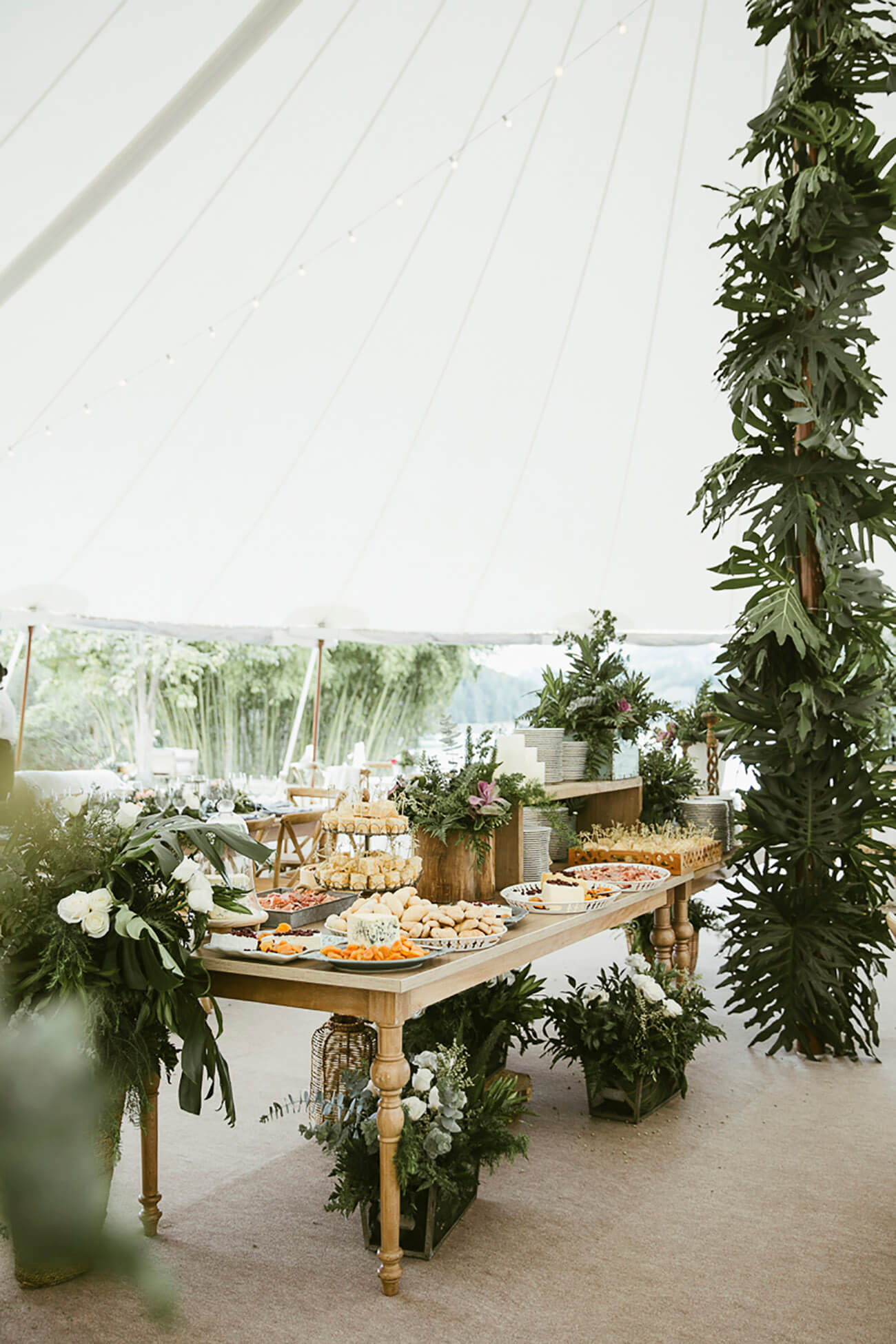 La idea inicial era ofrecer un desayuno tipo brunch, pero, ¿cómo no sacarle provecho y disfrutar más tiempo de esa carpa tan linda en medio de ese paisaje? Así que decidieron crear toda una experiencia de pequeños platos para todo el día, con una atmósfera pensada para compartir, como les gusta en su vida cotidiana. “No queríamos mesas que estuvieran marcadas y que obligaran a los invitados a sentarse en la misma todo el tiempo, ya que iban a ser muchos pequeños platos y no un único plato principal. Como tenemos muchos amigos en común, queríamos que no existiera tanto protocolo y que hubiera salas y sillones creando pequeños grupos de amigos a su antojo. También había mesas al aire libre y otras puestas para los familiares o personas que querían algo más formal”.