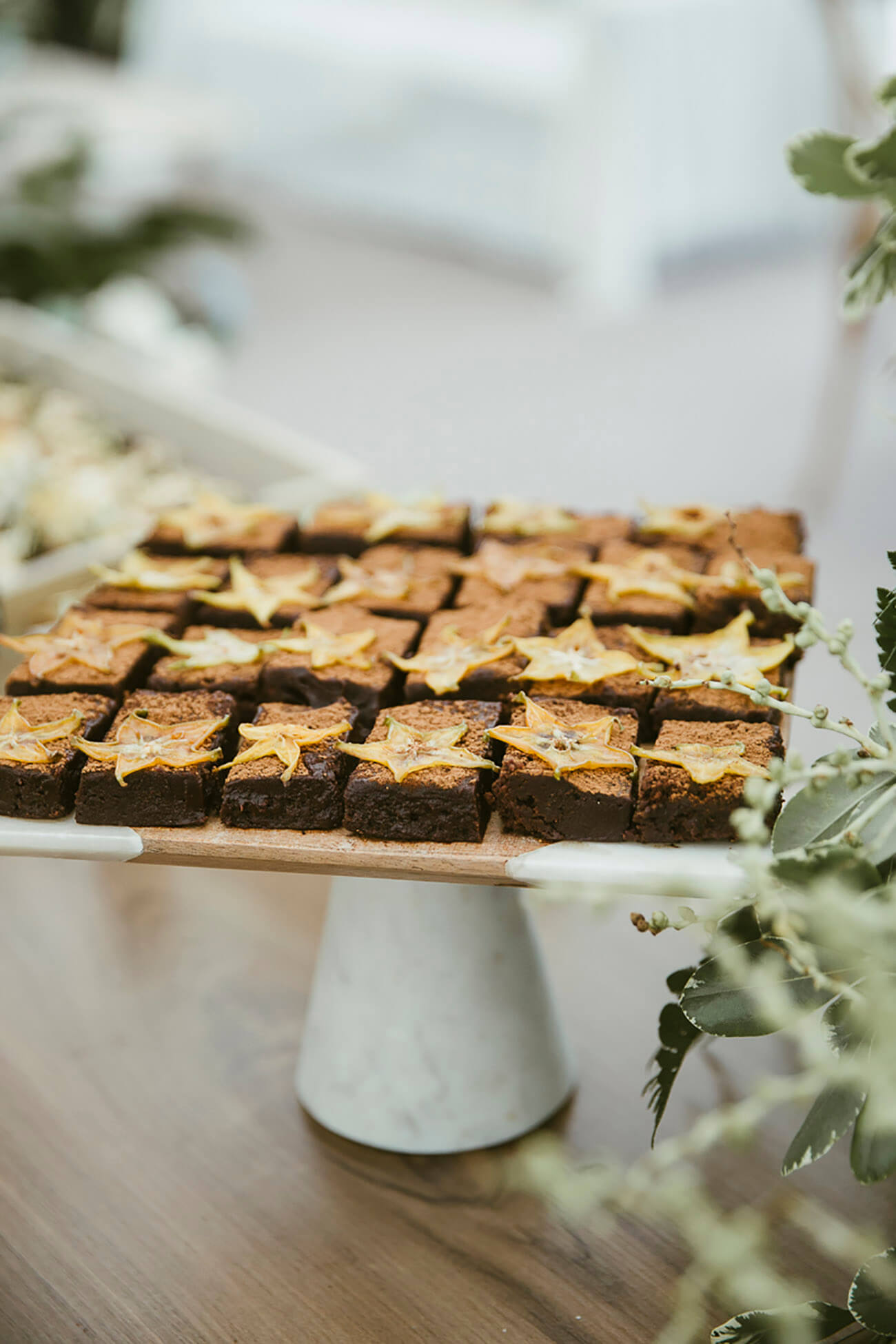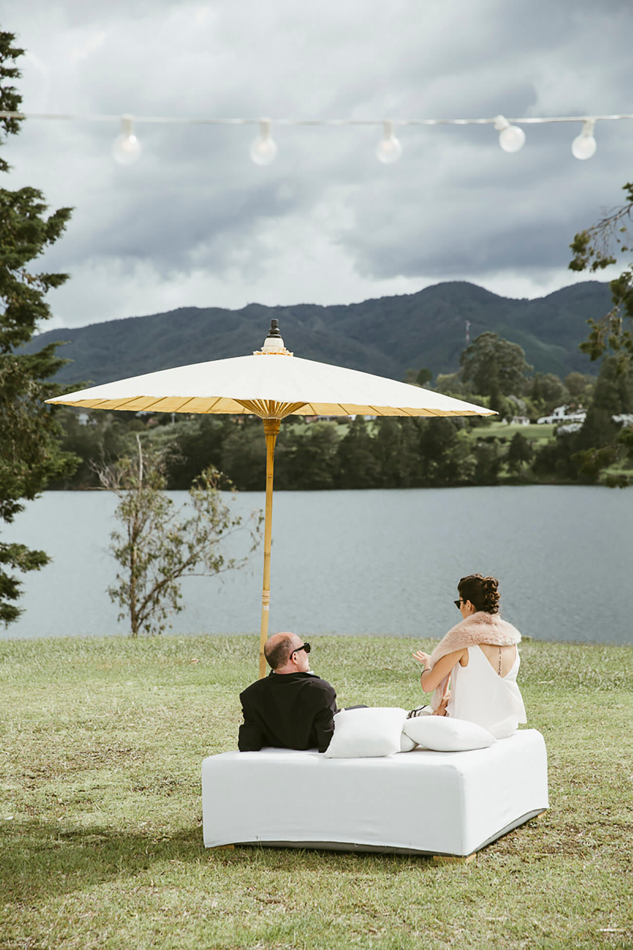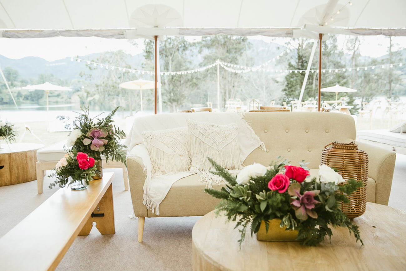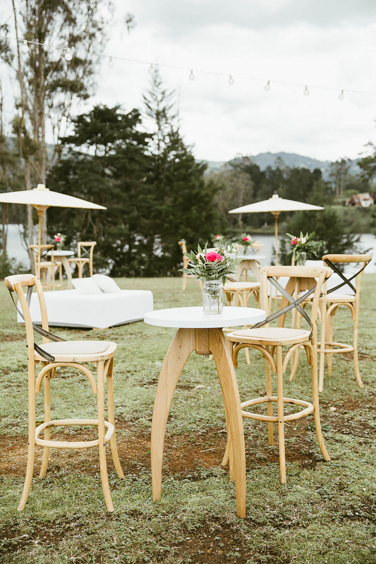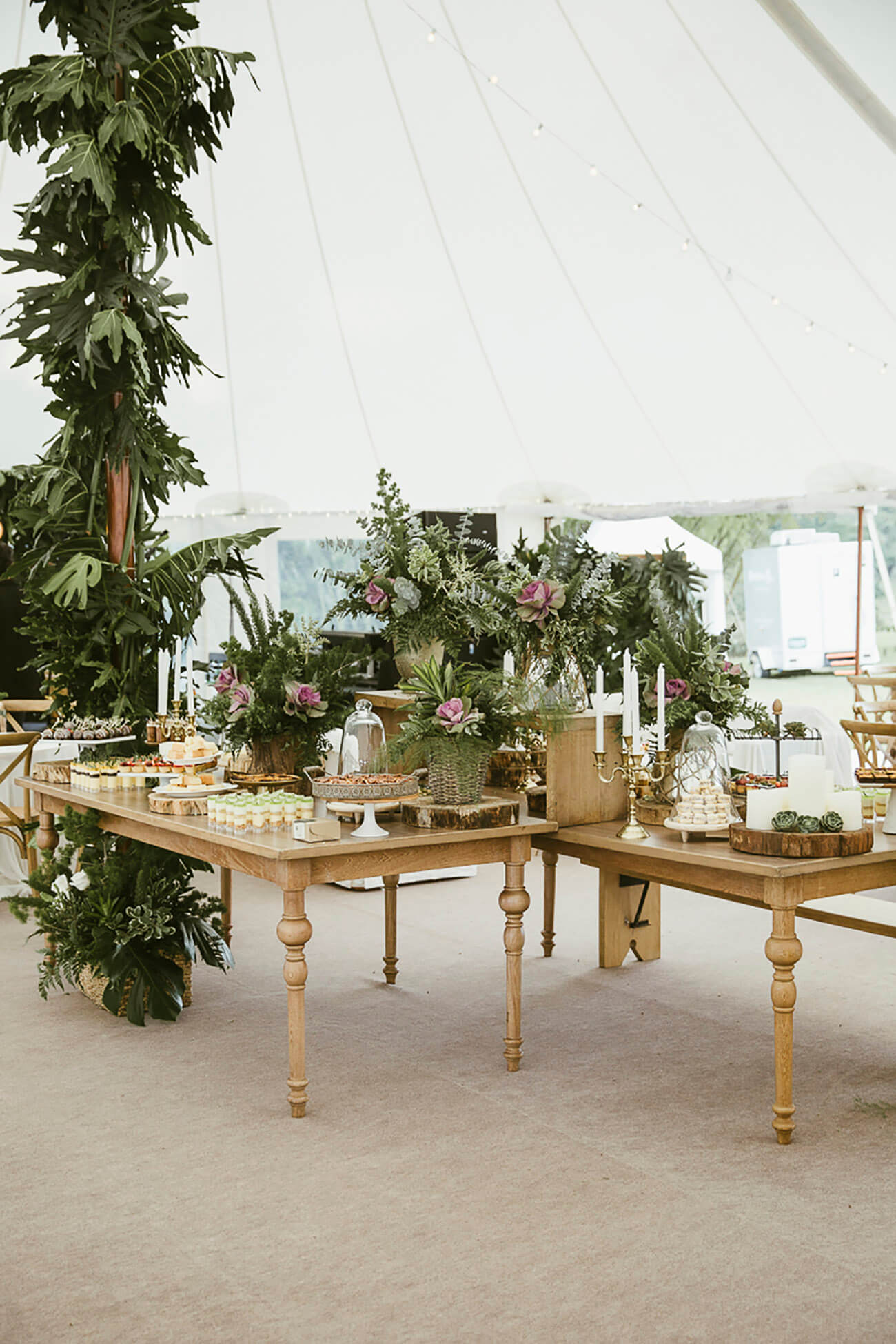 La idea inicial era ofrecer un desayuno tipo brunch, pero, ¿cómo no sacarle provecho y disfrutar más tiempo de esa carpa tan linda en medio de ese paisaje? Así que decidieron crear toda una experiencia de pequeños platos para todo el día, con una atmósfera pensada para compartir, como les gusta en su vida cotidiana. “No queríamos mesas que estuvieran marcadas y que obligaran a los invitados a sentarse en la misma todo el tiempo, ya que iban a ser muchos pequeños platos y no un único plato principal. Como tenemos muchos amigos en común, queríamos que no existiera tanto protocolo y que hubiera salas y sillones creando pequeños grupos de amigos a su antojo. También había mesas al aire libre y otras puestas para los familiares o personas que querían algo más formal”.