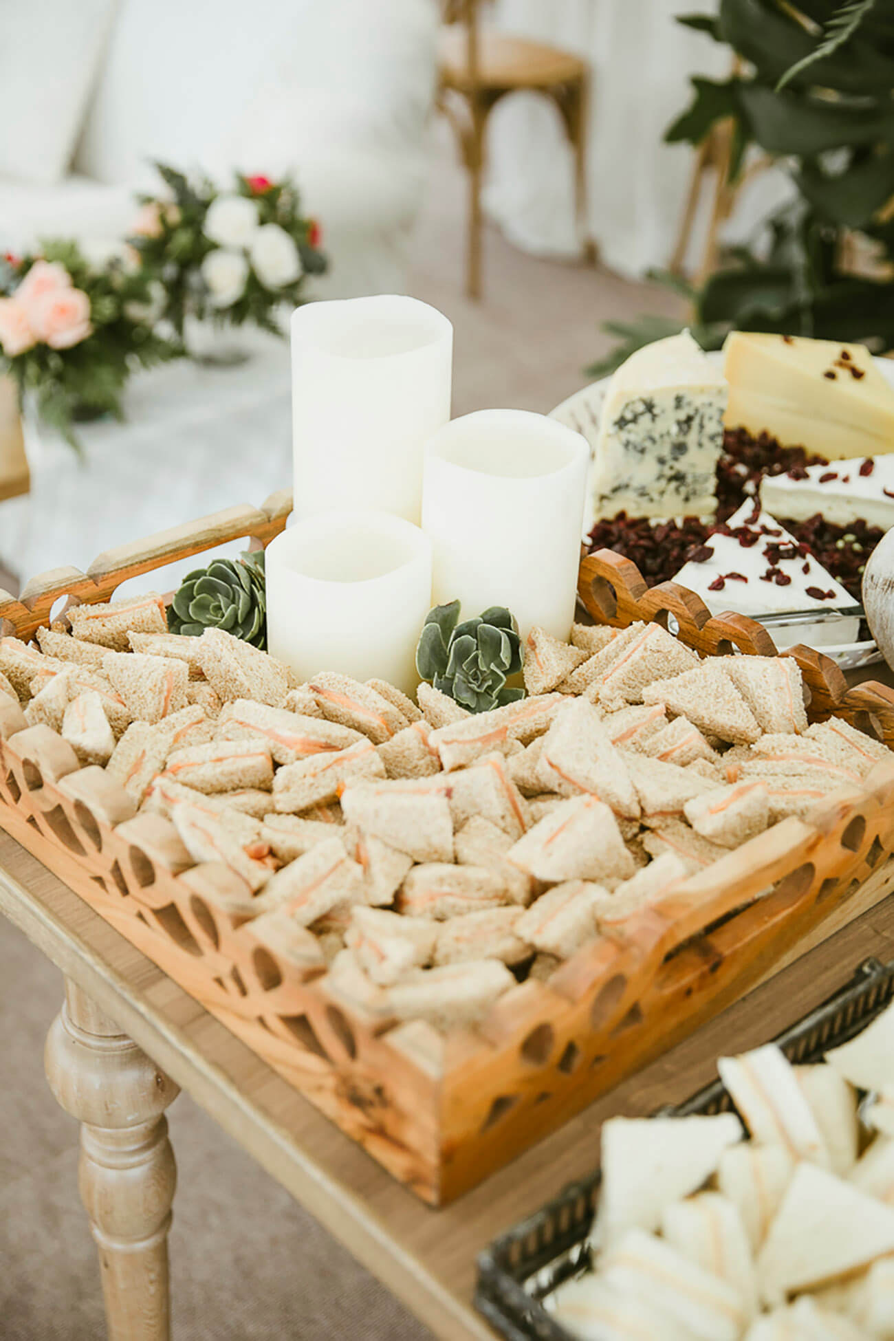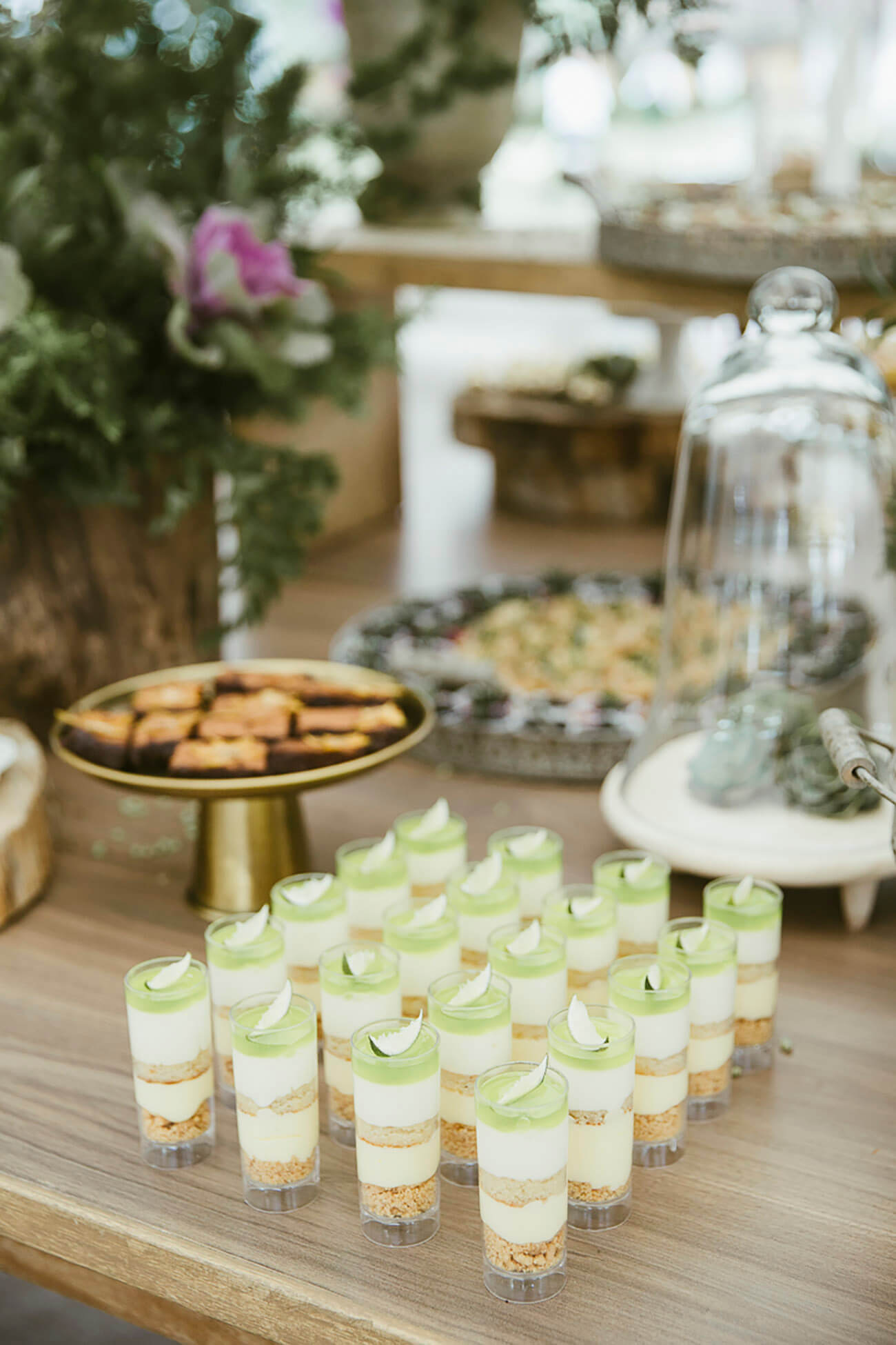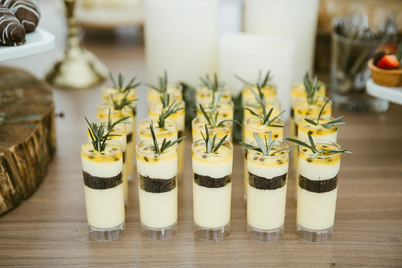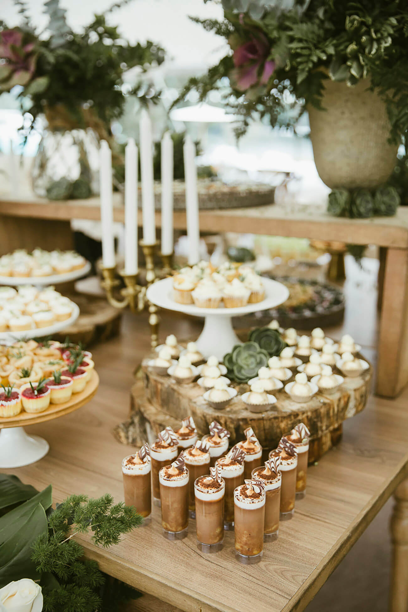 La comida estuvo a cargo de Anita Botero, de La Cafetiere de Anita, quien entendió lo que los novios querían. La lista de delicias empezó con una gran mesa de snacks, con los que dieron la bienvenida: mini sánduches, tablas de quesos y jamones, frutos secos, entre otros. Otros platos llegaron al centro de las mesas, para compartir: espárragos verdes con salsa maltesa, queso de búfala Ovoline con tomates cherry marinados en albahaca, champiñones marinados en limón y peperoncino, langostinos crocantes en salsa tártara. Para servir individual: ceviche de pescado blanco al estilo peruano, acompañado de chips de plátano verde; filete de salmón grillado con paprika, servido sobre risoni de tomates secos; boeuf bourguignon acompañado de cebollas acarameladas y tocineta, servido sobre puré de papas y crutones de pan francés; y chuleticas de cordero en salsa de tahini y comino, servidas sobre puré de frijoles blancos al limón. Y para las 9 de la noche: crema de apio y queso azul y crema de zanahoria y jengibre.
