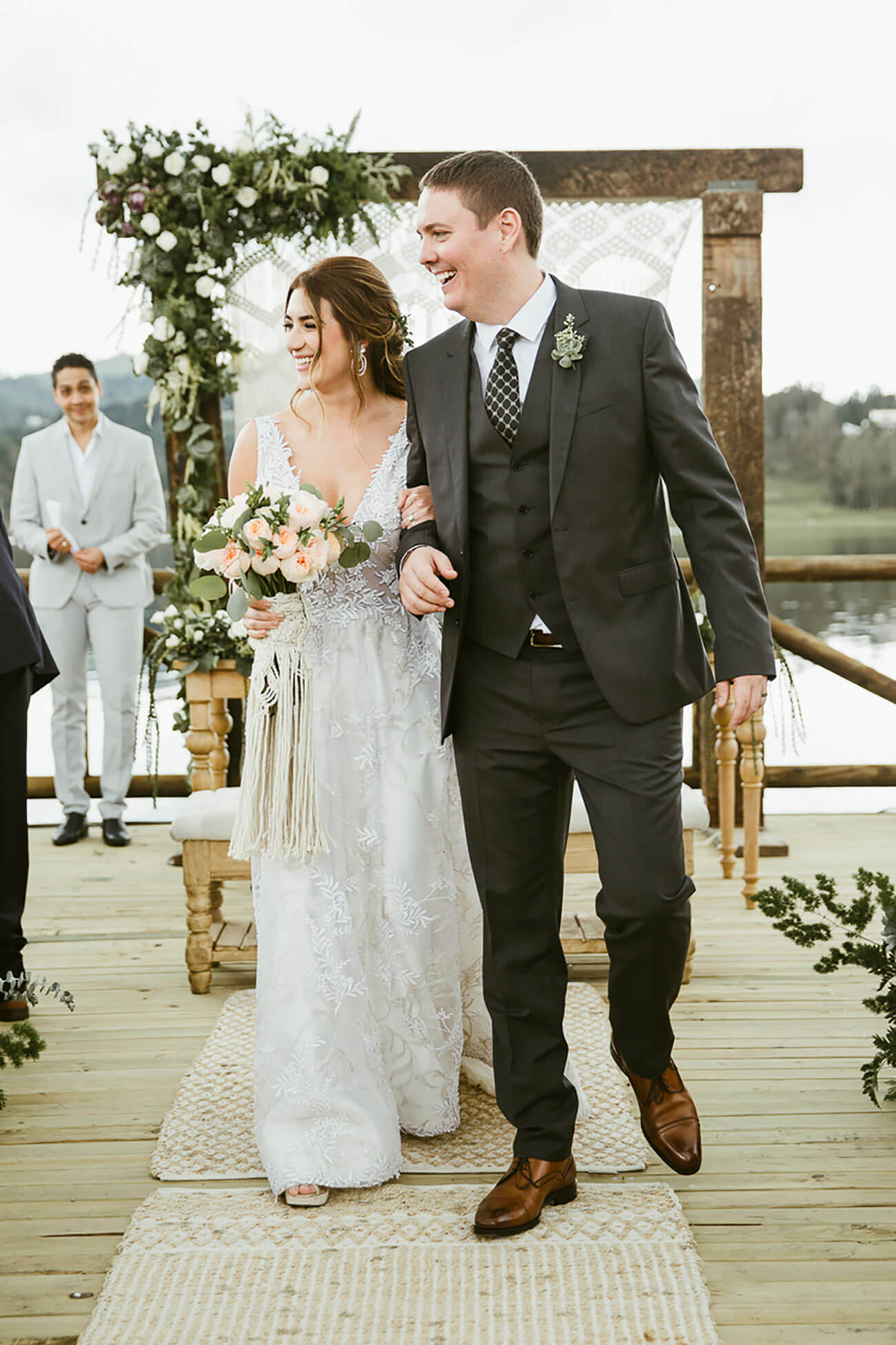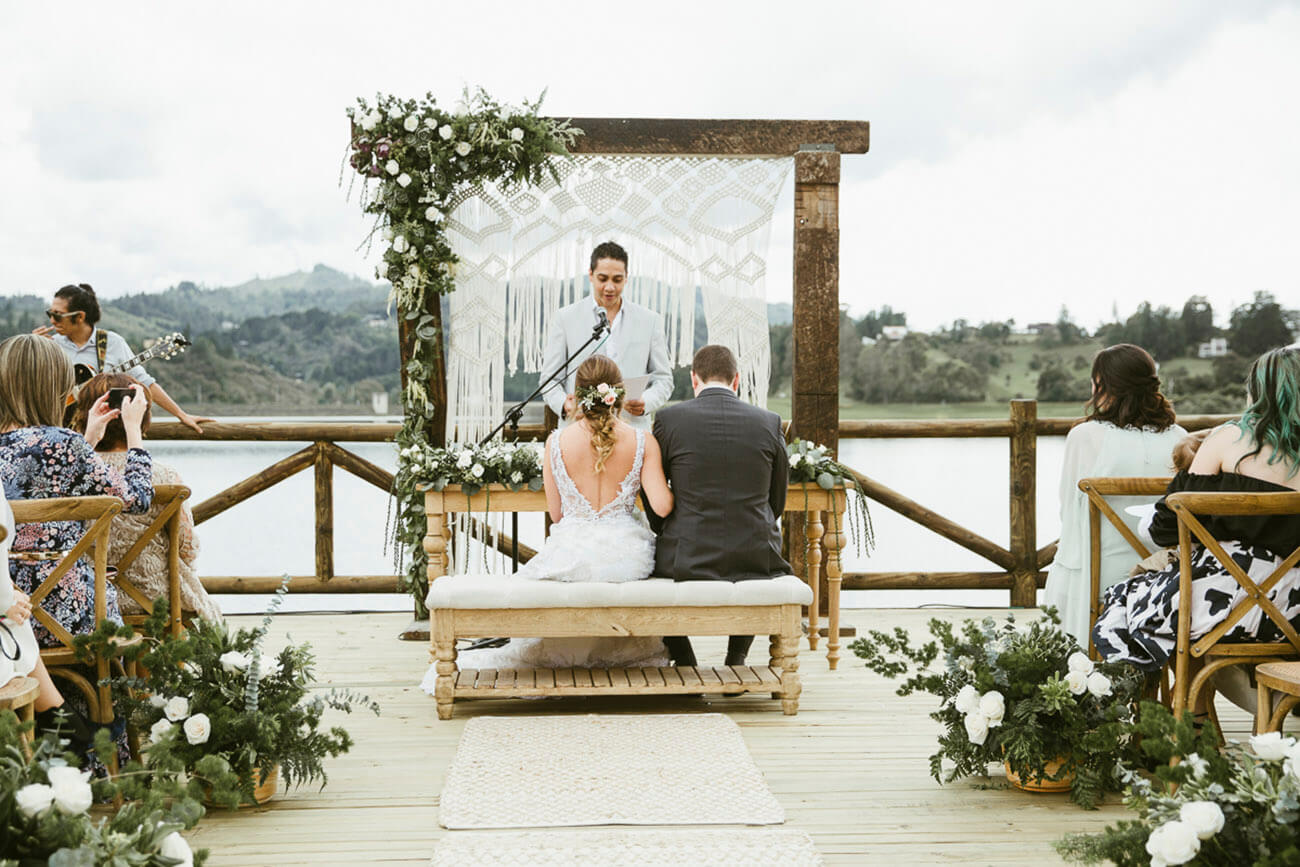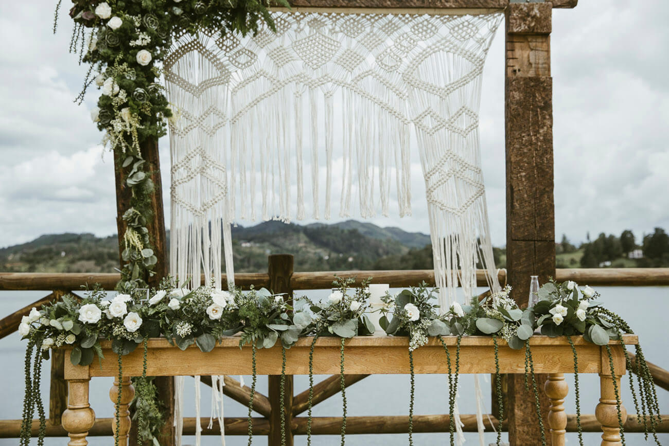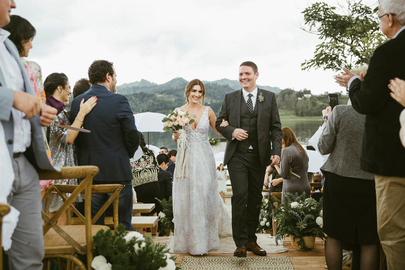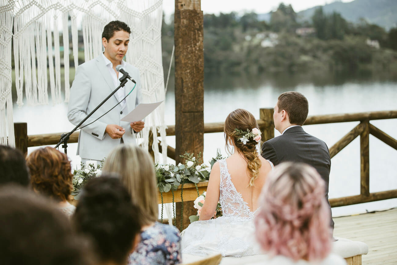 La ceremonia, con el lago como telón de fondo, un altar de madera rústica diseñado por Flores de Abril y tejido en macramé por Ukelele, tuvo momentos muy especiales. “No queríamos una ceremonia religiosa, pero tampoco dejar de hacer algo especial. María Antonia nos presentó a Mauricio Preciado, quien desde el primer momento en que lo conocimos, sentimos que estaba alineado con lo que queríamos para la ceremonia: algo corto pero especial, y sobre todo, que tuviera un significado para nosotros en ese día tan importante”. Inició con una lectura de El Principito, sobre las diferencias entre querer y amar. Continúo con un ritual de arenas, la de cada uno con un color y un significado distinto, de acuerdo con su personalidad. Para Anita, vinotinto: pasión, calidez, actividad, fuerza, movimiento. Para Alejo, beige: tranquilidad, transparencia, calma, serenidad. El resultado: alcanzar un equilibrio. “Las guardamos para que el día que construyamos nuestra casa, sirvan como cimiento de nuestro hogar. Luego hicimos la ceremonia de la luz y el intercambio de argollas. La canción con la que oficialmente fuimos esposos fue I’m Yours, en la hermosa voz de Candelaria, acompañada por La liebre”.