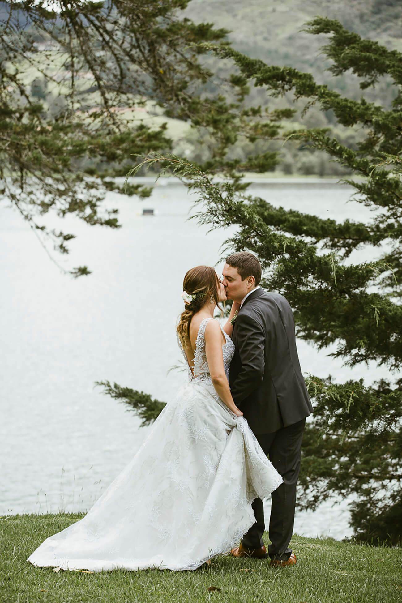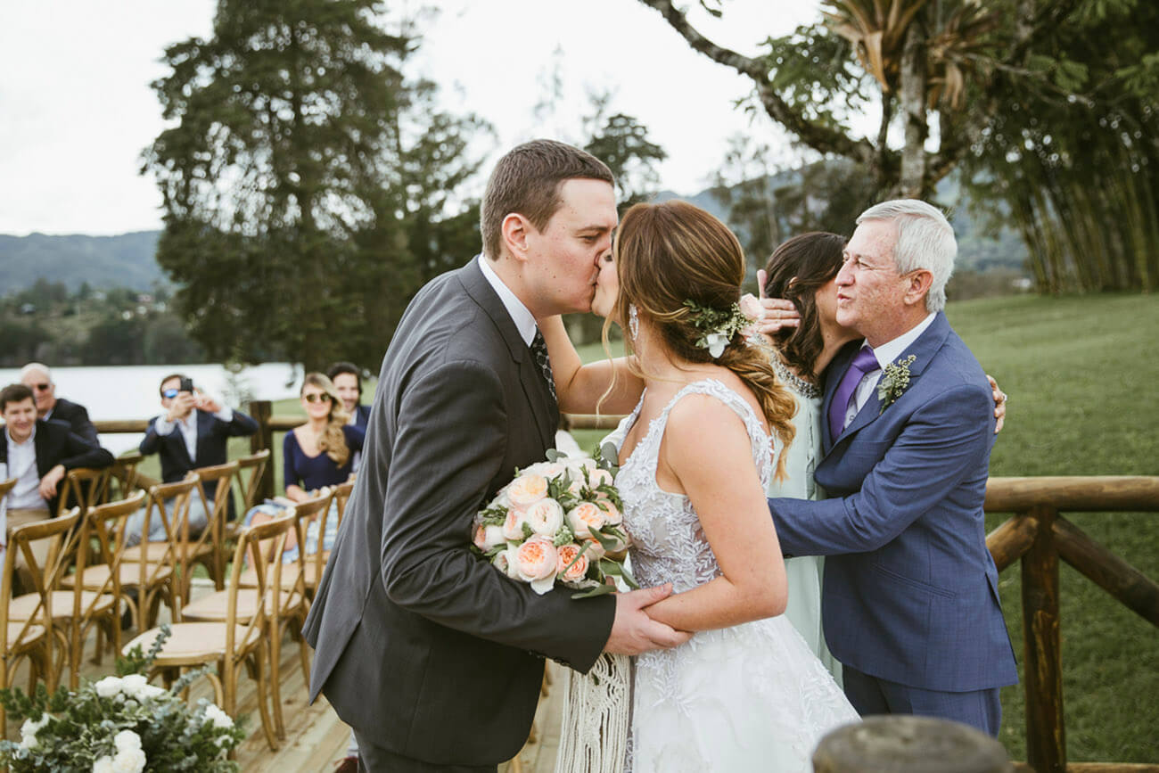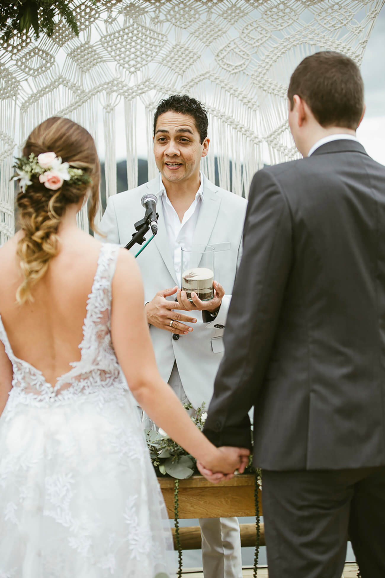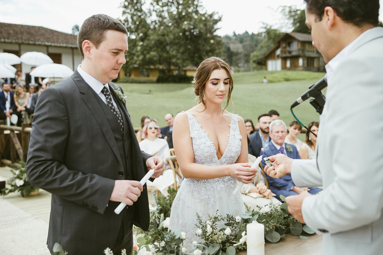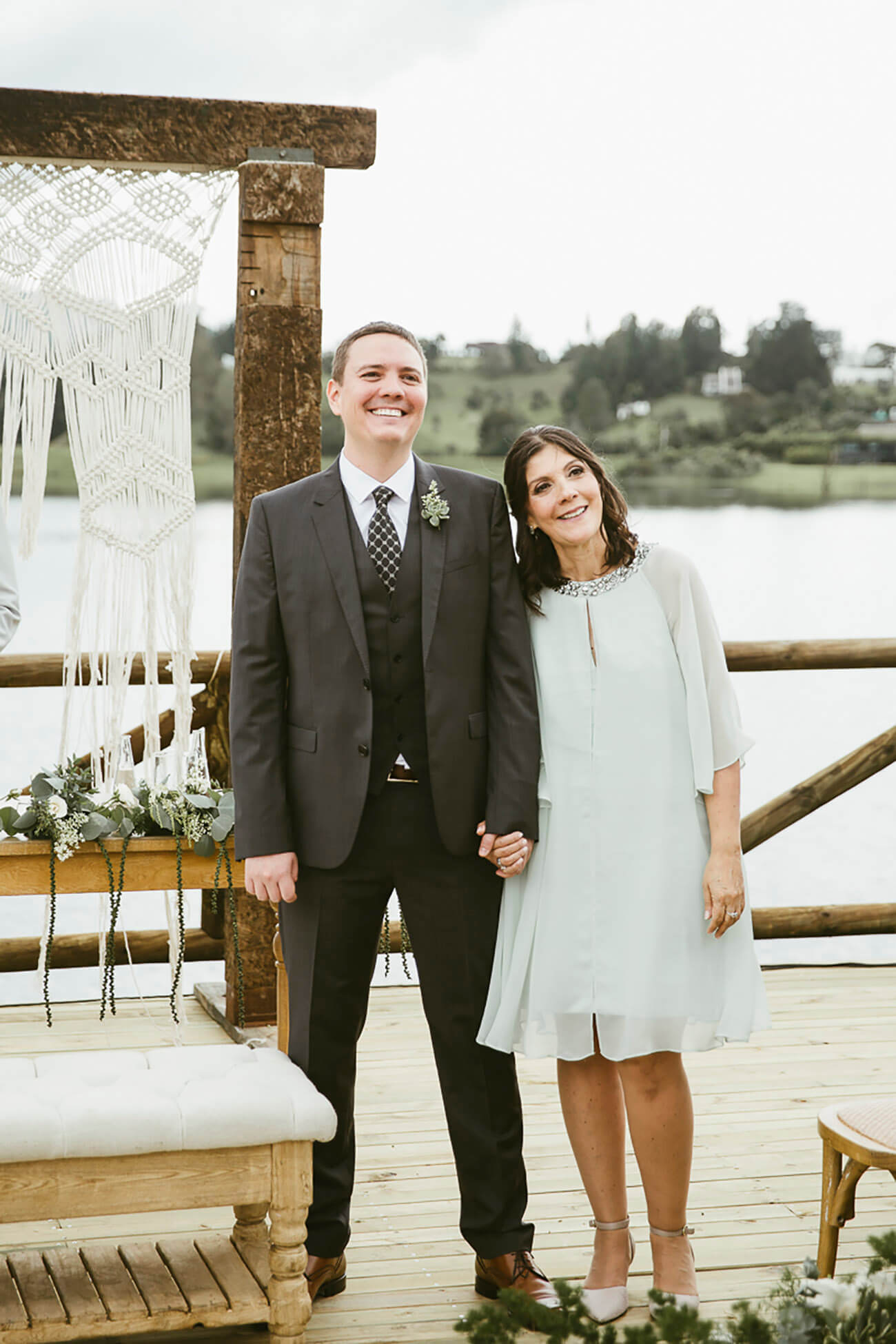 La ceremonia, con el lago como telón de fondo, un altar de madera rústica diseñado por Flores de Abril y tejido en macramé por Ukelele, tuvo momentos muy especiales. “No queríamos una ceremonia religiosa, pero tampoco dejar de hacer algo especial. María Antonia nos presentó a Mauricio Preciado, quien desde el primer momento en que lo conocimos, sentimos que estaba alineado con lo que queríamos para la ceremonia: algo corto pero especial, y sobre todo, que tuviera un significado para nosotros en ese día tan importante”. Inició con una lectura de El Principito, sobre las diferencias entre querer y amar. Continúo con un ritual de arenas, la de cada uno con un color y un significado distinto, de acuerdo con su personalidad. Para Anita, vinotinto: pasión, calidez, actividad, fuerza, movimiento. Para Alejo, beige: tranquilidad, transparencia, calma, serenidad. El resultado: alcanzar un equilibrio. “Las guardamos para que el día que construyamos nuestra casa, sirvan como cimiento de nuestro hogar. Luego hicimos la ceremonia de la luz y el intercambio de argollas. La canción con la que oficialmente fuimos esposos fue I’m Yours, en la hermosa voz de Candelaria, acompañada por La liebre”.