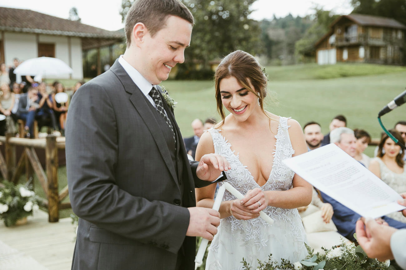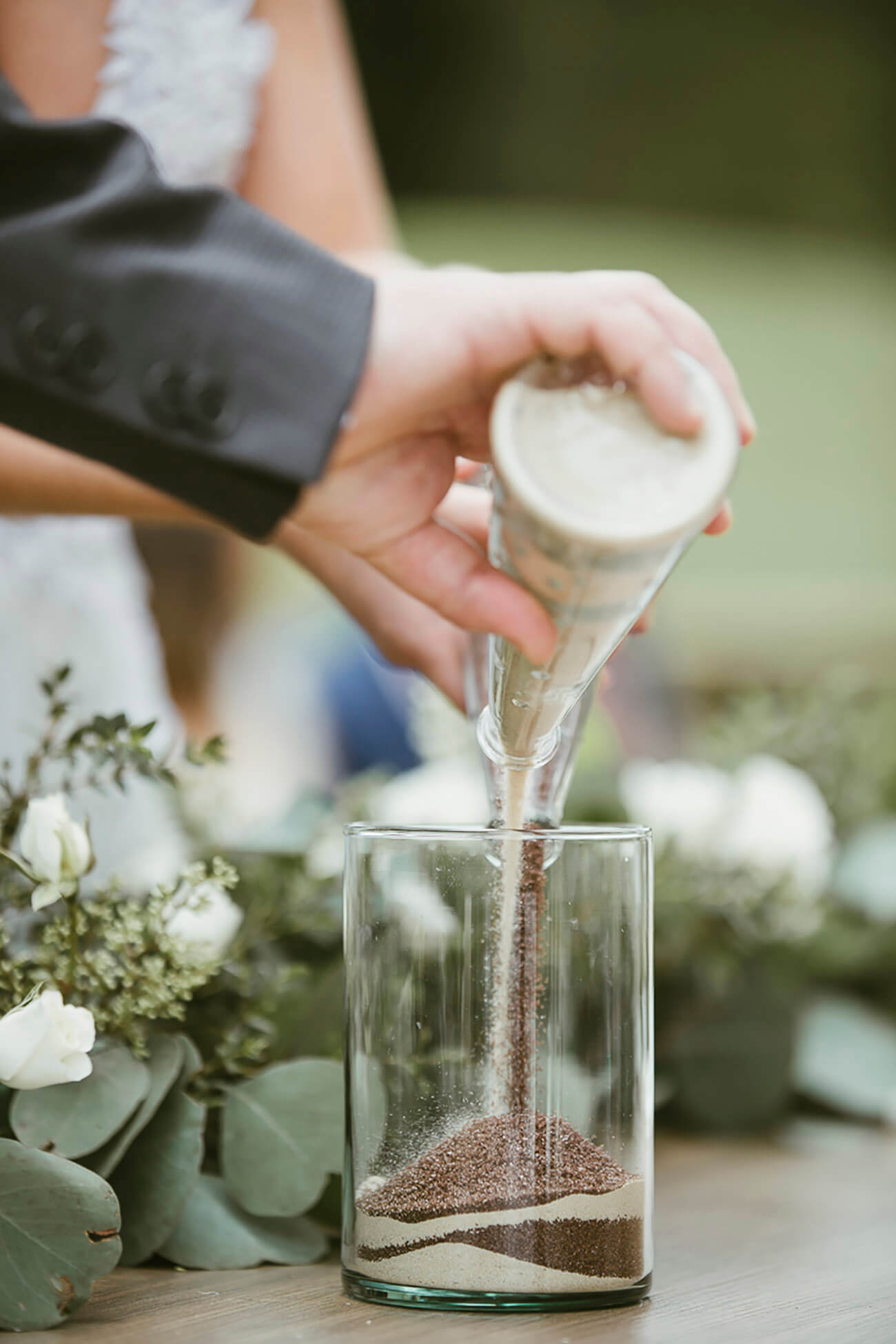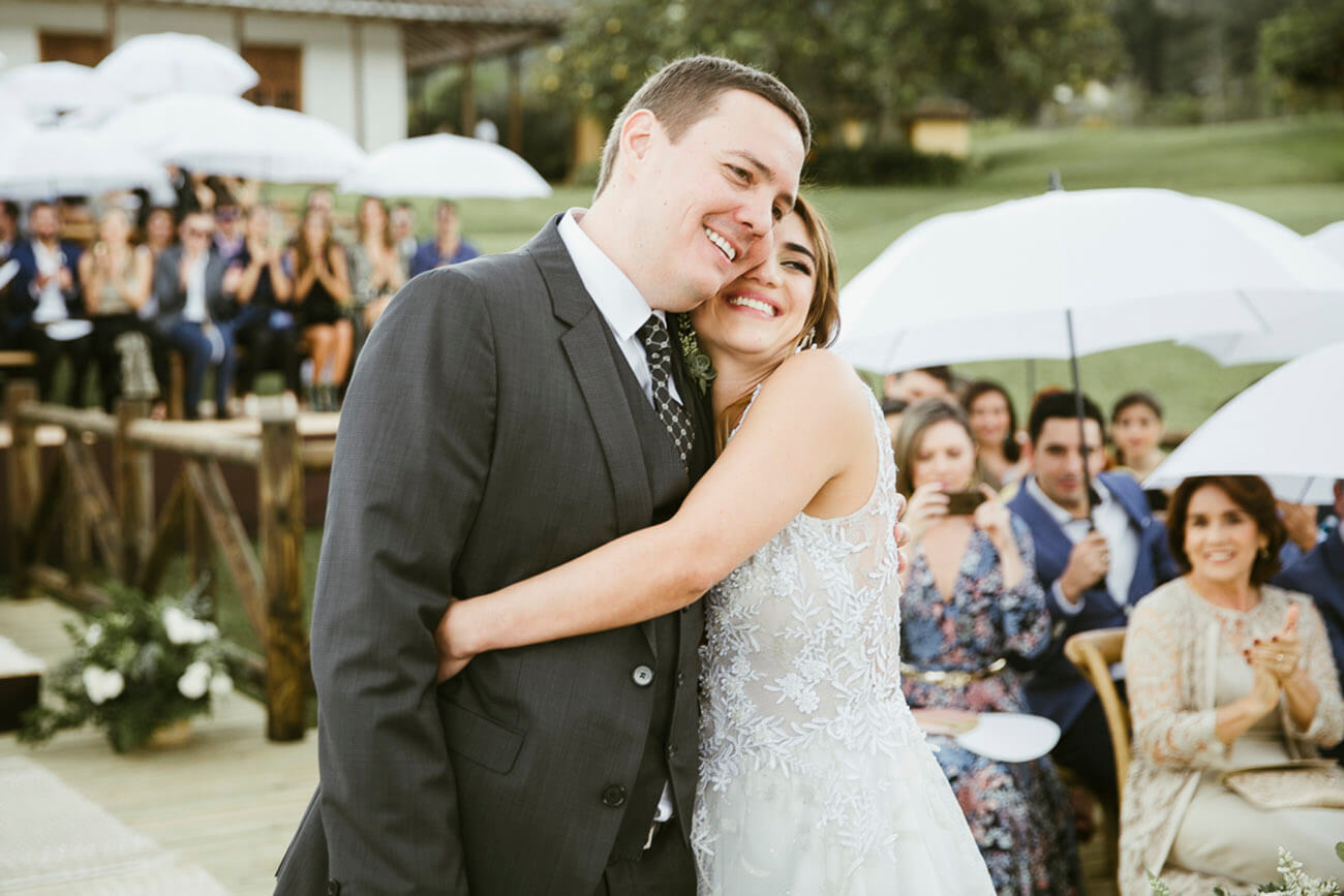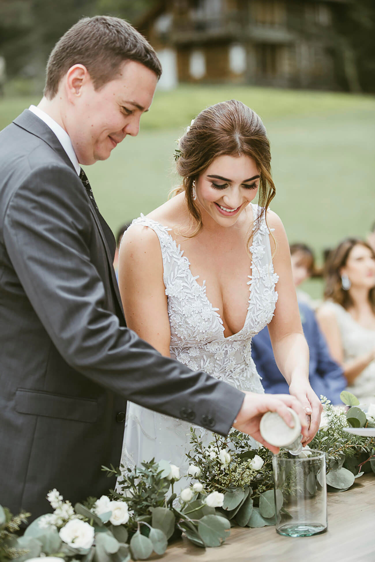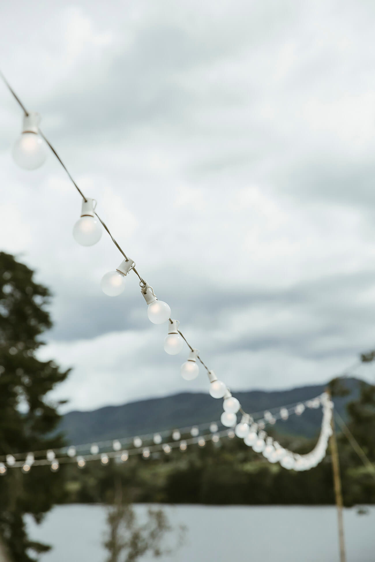 La ceremonia, con el lago como telón de fondo, un altar de madera rústica diseñado por Flores de Abril y tejido en macramé por Ukelele, tuvo momentos muy especiales. “No queríamos una ceremonia religiosa, pero tampoco dejar de hacer algo especial. María Antonia nos presentó a Mauricio Preciado, quien desde el primer momento en que lo conocimos, sentimos que estaba alineado con lo que queríamos para la ceremonia: algo corto pero especial, y sobre todo, que tuviera un significado para nosotros en ese día tan importante”. Inició con una lectura de El Principito, sobre las diferencias entre querer y amar. Continúo con un ritual de arenas, la de cada uno con un color y un significado distinto, de acuerdo con su personalidad. Para Anita, vinotinto: pasión, calidez, actividad, fuerza, movimiento. Para Alejo, beige: tranquilidad, transparencia, calma, serenidad. El resultado: alcanzar un equilibrio. “Las guardamos para que el día que construyamos nuestra casa, sirvan como cimiento de nuestro hogar. Luego hicimos la ceremonia de la luz y el intercambio de argollas. La canción con la que oficialmente fuimos esposos fue I’m Yours, en la hermosa voz de Candelaria, acompañada por La liebre”.