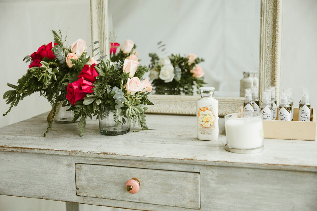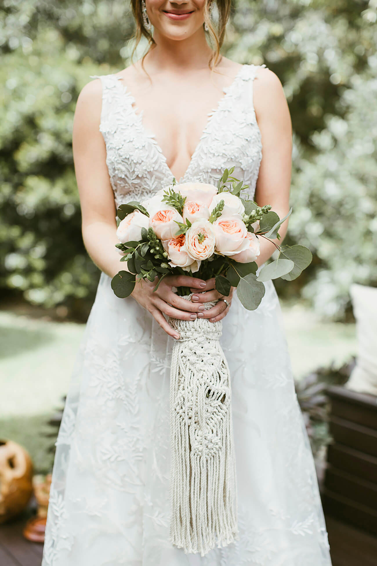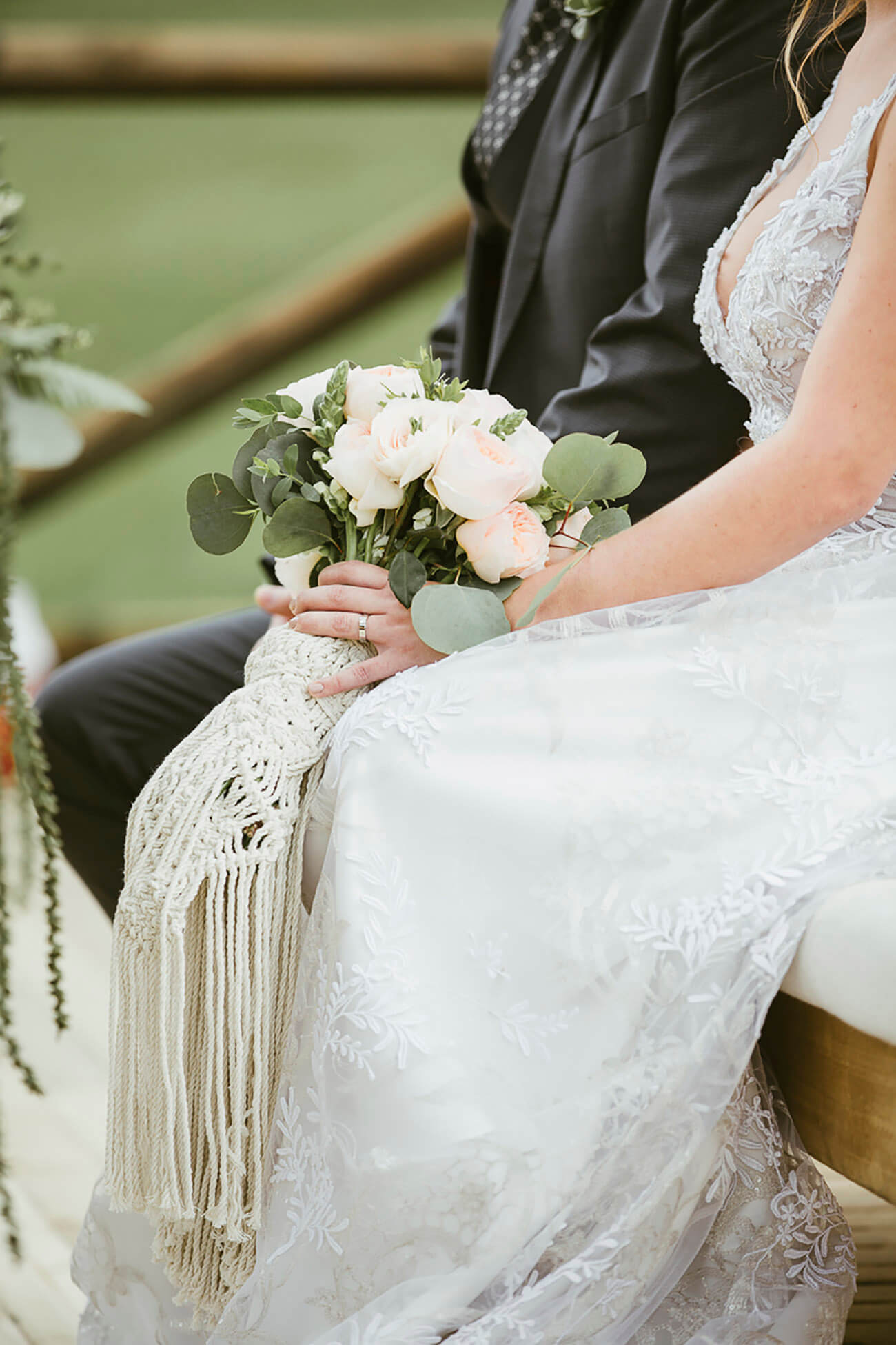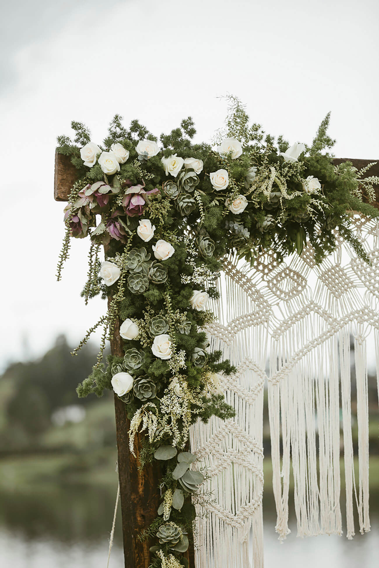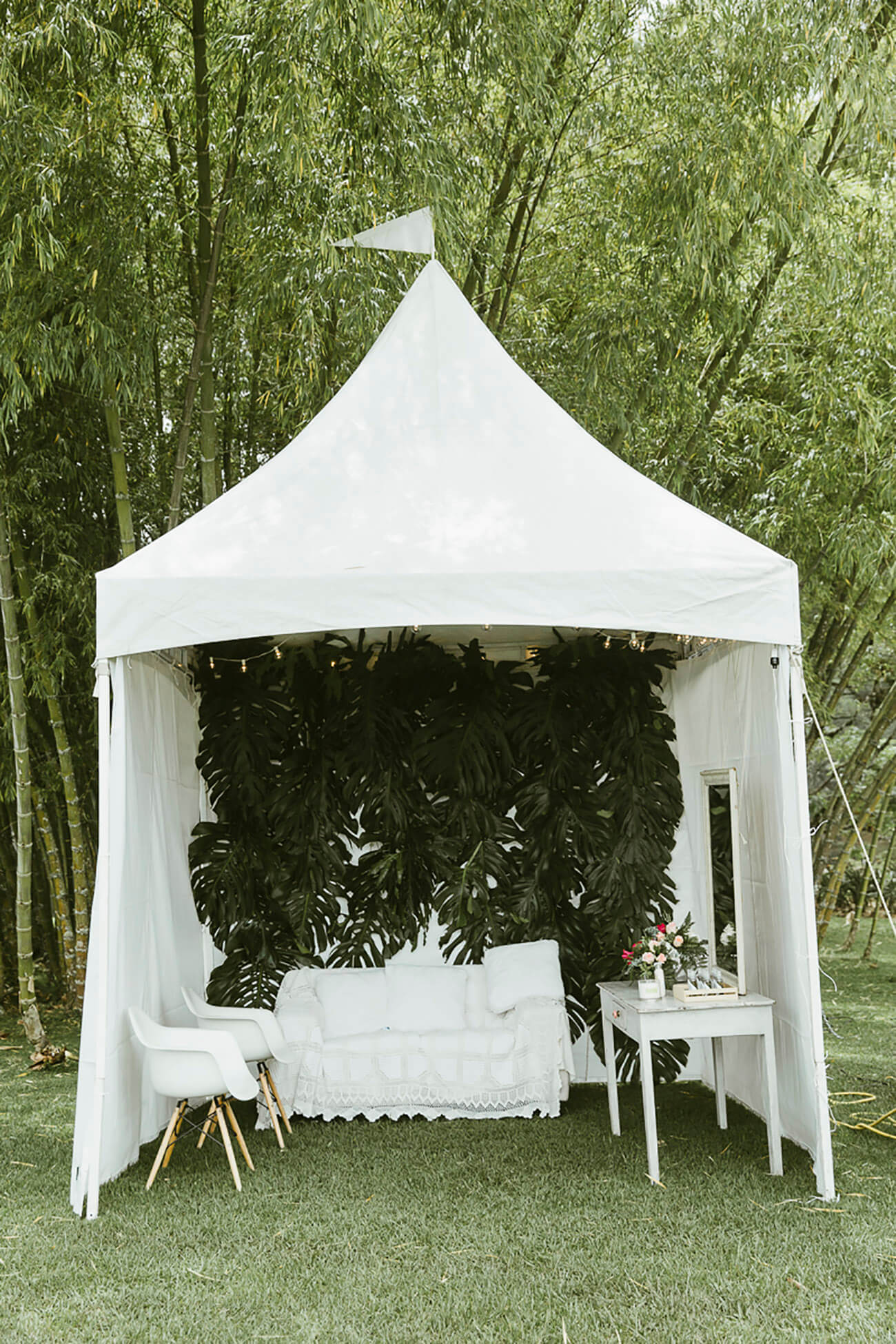 Alejo y yo confiamos en el talento de Flores de Abril y en su buen gusto. Amamos cada detalle de nuestro matrimonio. La carpa, el mobiliario, las flores, los toques boho, el altar con macramé, los tapetes, todo el escenario. Incluso el baño, que era un trailer hermoso con una pequeña carpa al lado, un espejo y un sillón, para que la espera fuera agradable. No pudimos estar en mejores manos