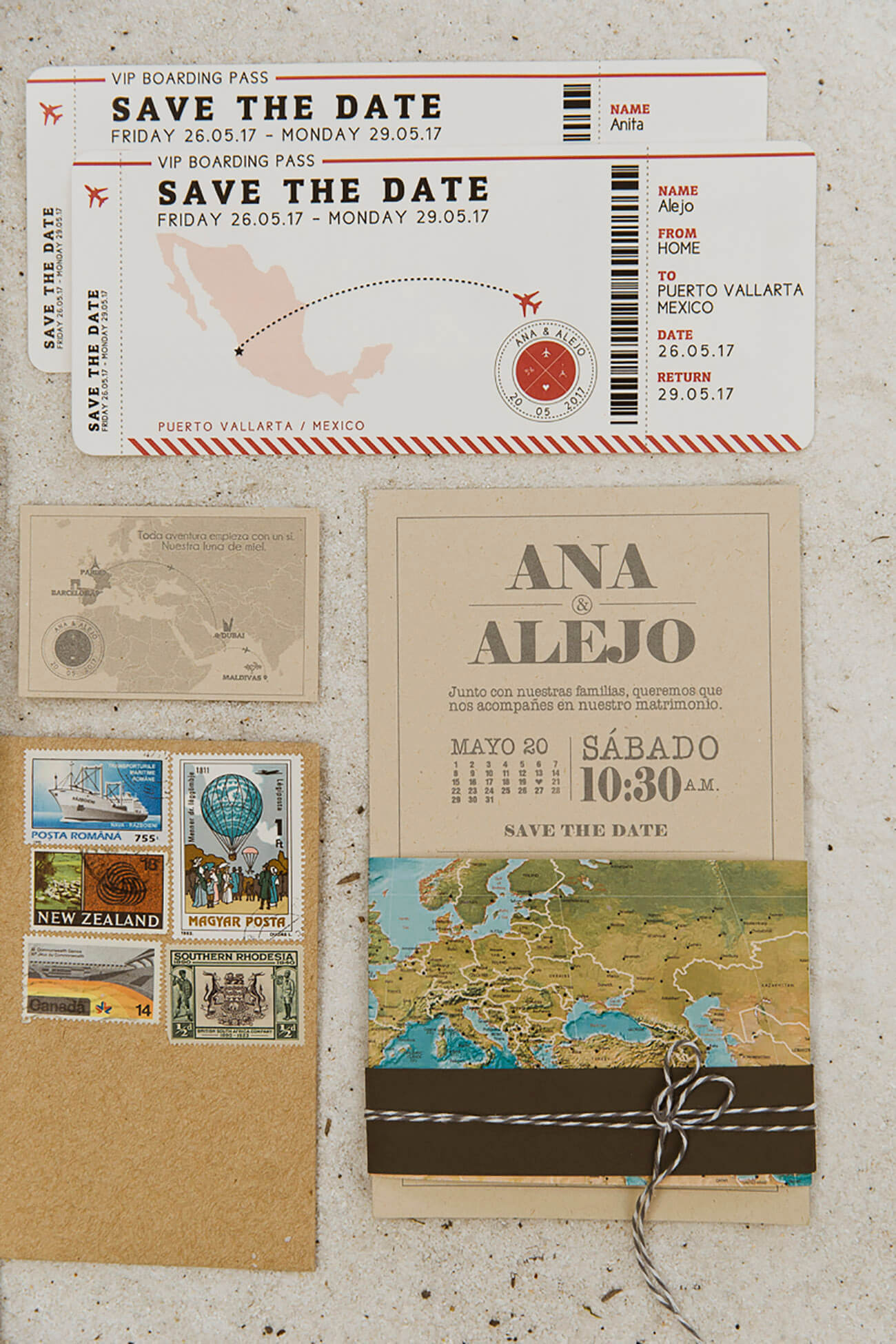 "Como Alejo y yo ya vivíamos juntos y queríamos hacer un viaje de celebración con nuestros amigos, además del matrimonio acá, el tema de las invitaciones estaba relacionado con nuestra luna de miel y los destinos que íbamos a visitar. No queríamos lista de novios, entonces abrimos una cuenta de ahorro en la que los invitados nos daban su regalo para el viaje. Mari, de La libreta morada, nos ayudó a que el texto contara lo que queríamos de una manera hermosa. Los sobres tenían estampillas y un mapa que mostraba la ruta de nuestra luna de miel".