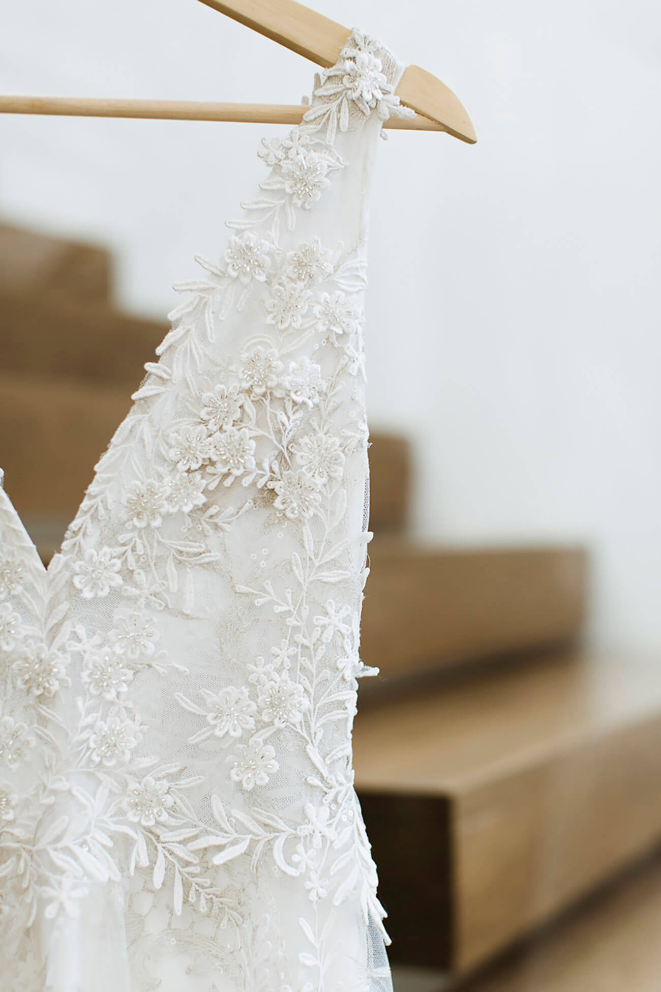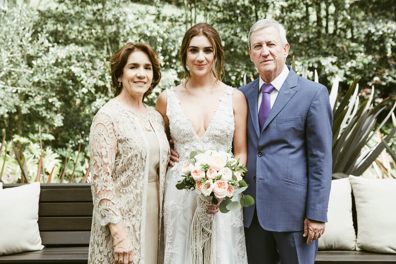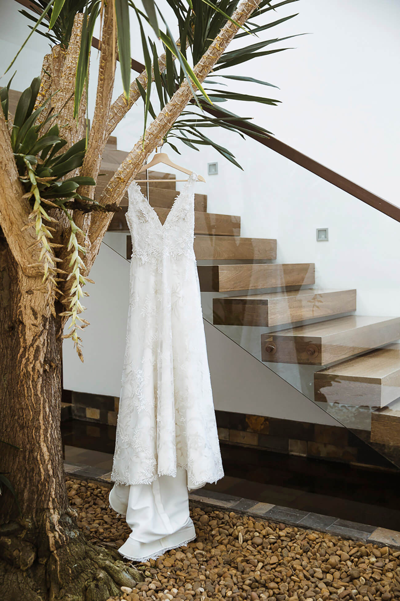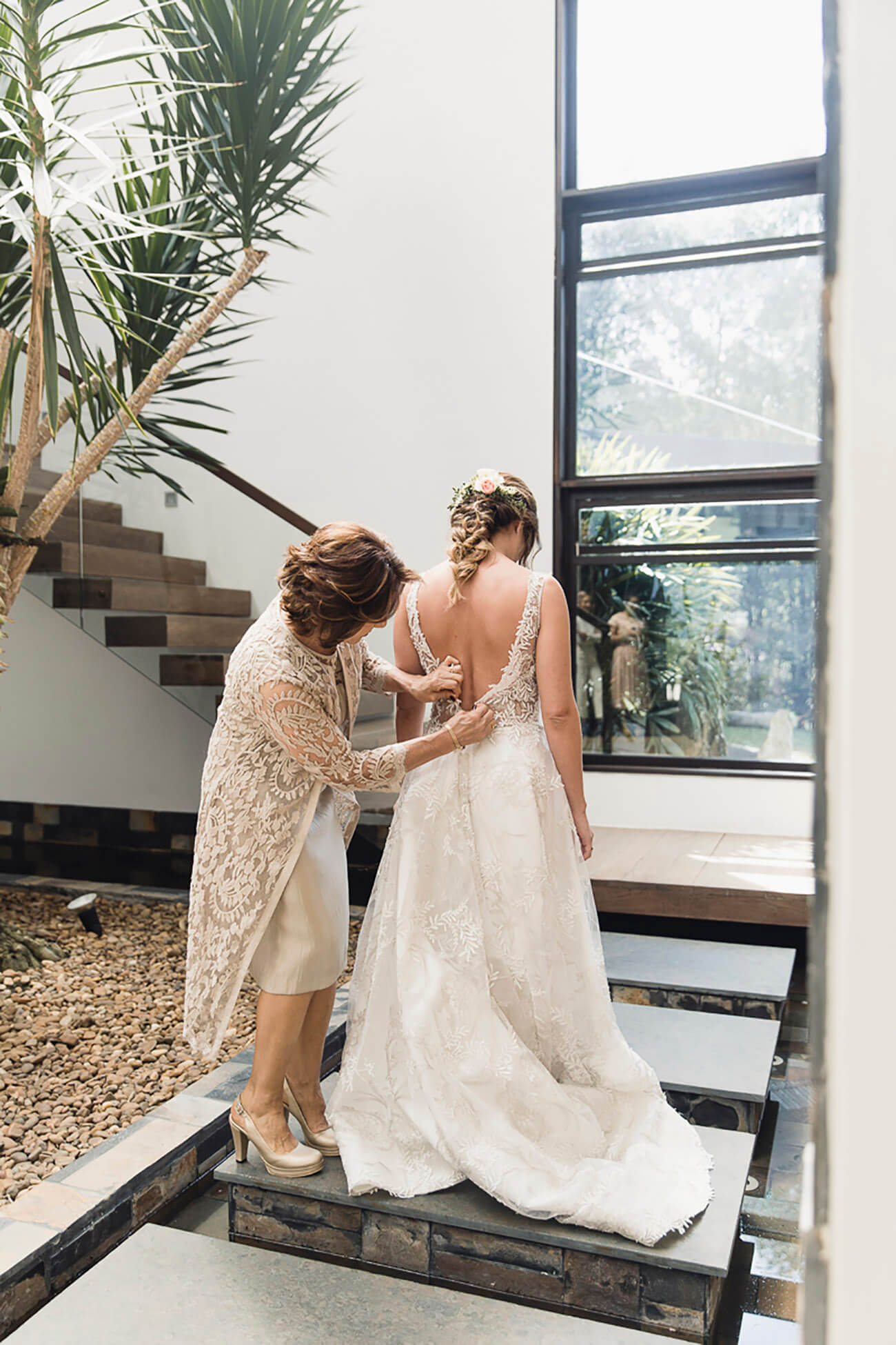 El vestido llevaba la firma de Luisa Nicholls. “Inicialmente tenía en mente un vestido de Anna Campbell o de Grace Love Lace, pero por el poco tiempo no alcanzaba a llegarme desde Australia. Decidí ir donde Luisa, le mostré mis referentes y me dejé asesorar. Me encantó el resultado. Luisa y su equipo entendieron todo lo que quería, las telas que tienen son hermosas, disfruté mucho todo el proceso, ya que nunca había soñado casarme y menos con el vestido de novia”. David Hoyos, su peluquero de toda la vida, se encargó de su maquillaje y peinado. Al ser una celebración de día, quería algo muy natural, desestructurado. Para la ceremonia, Anita llevó un accesorio de flores naturales; y para la fiesta, lo reemplazó por una pieza de Zawadzky.