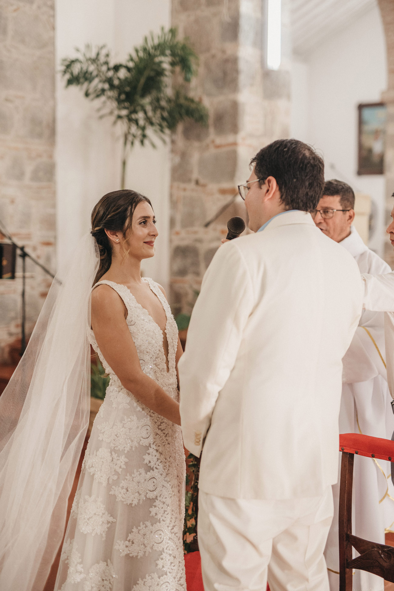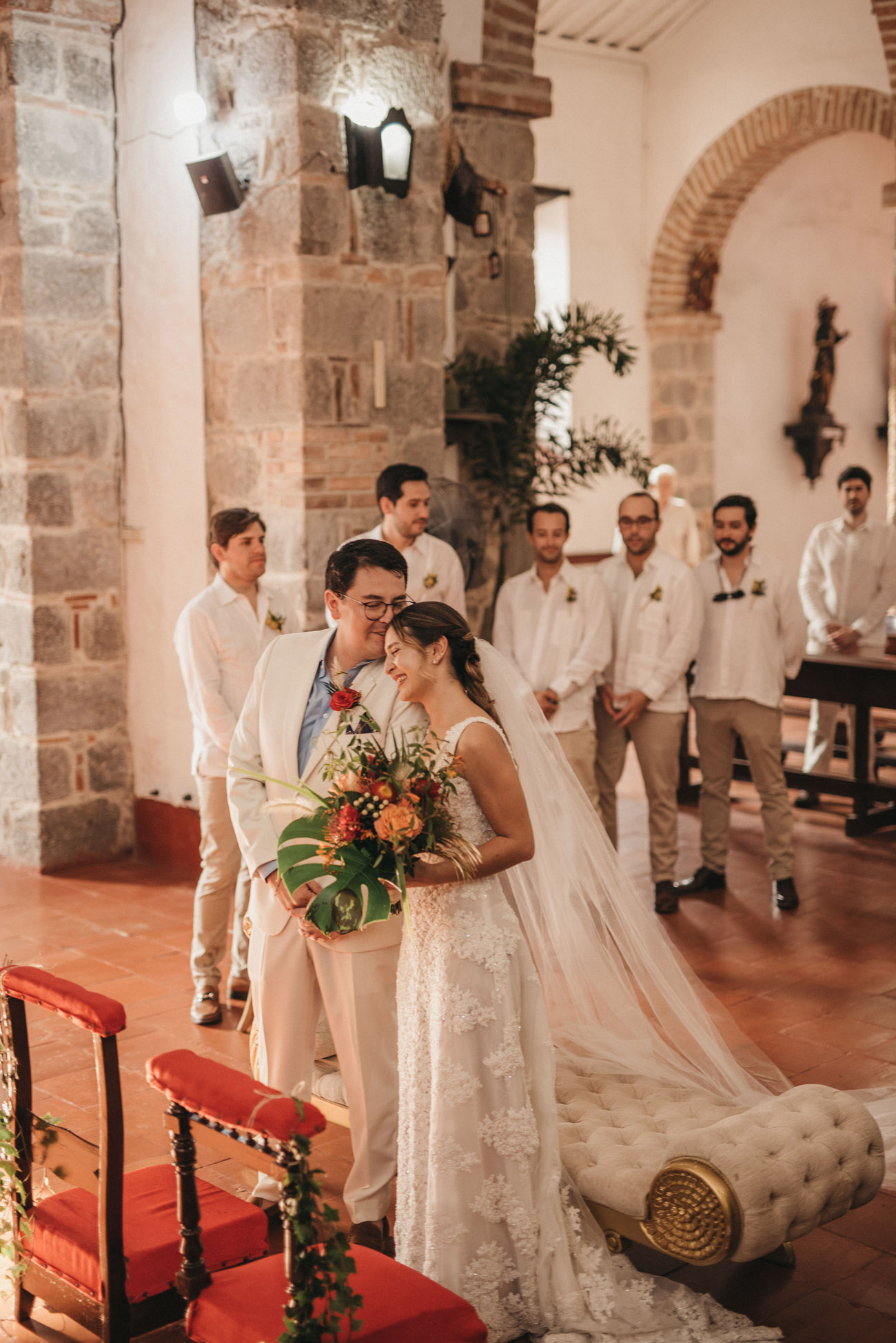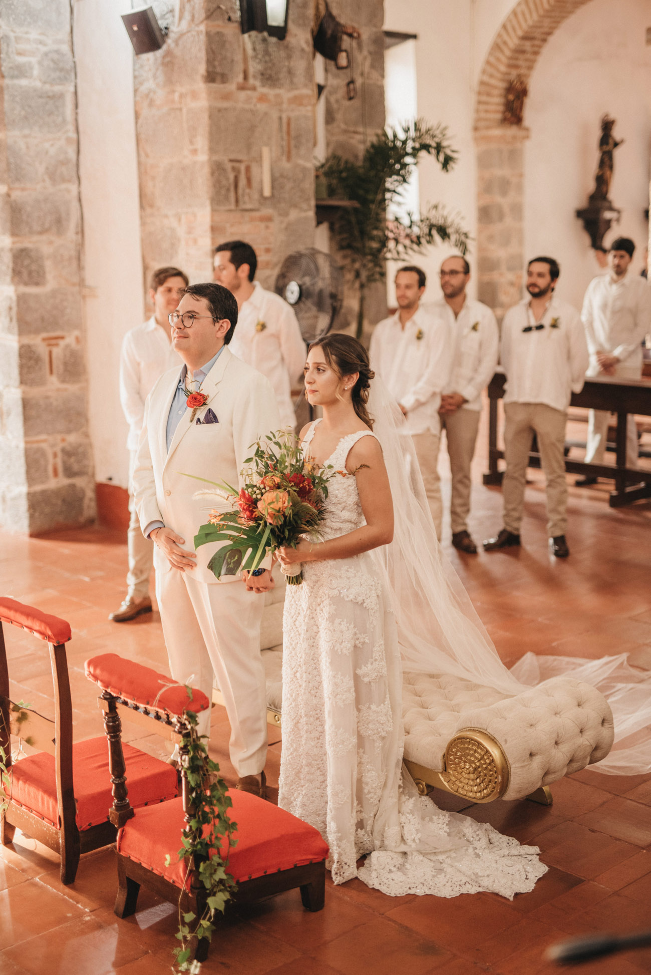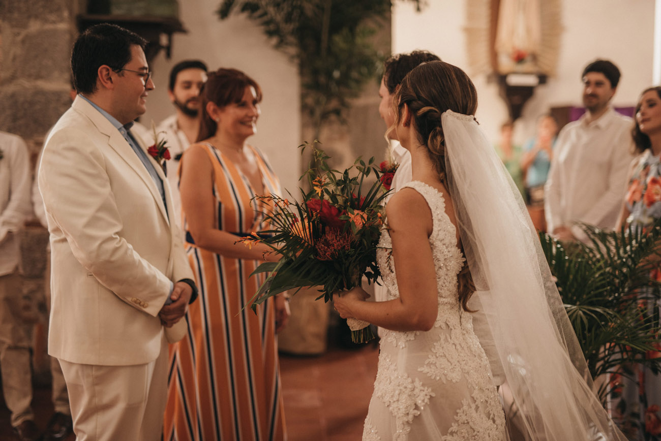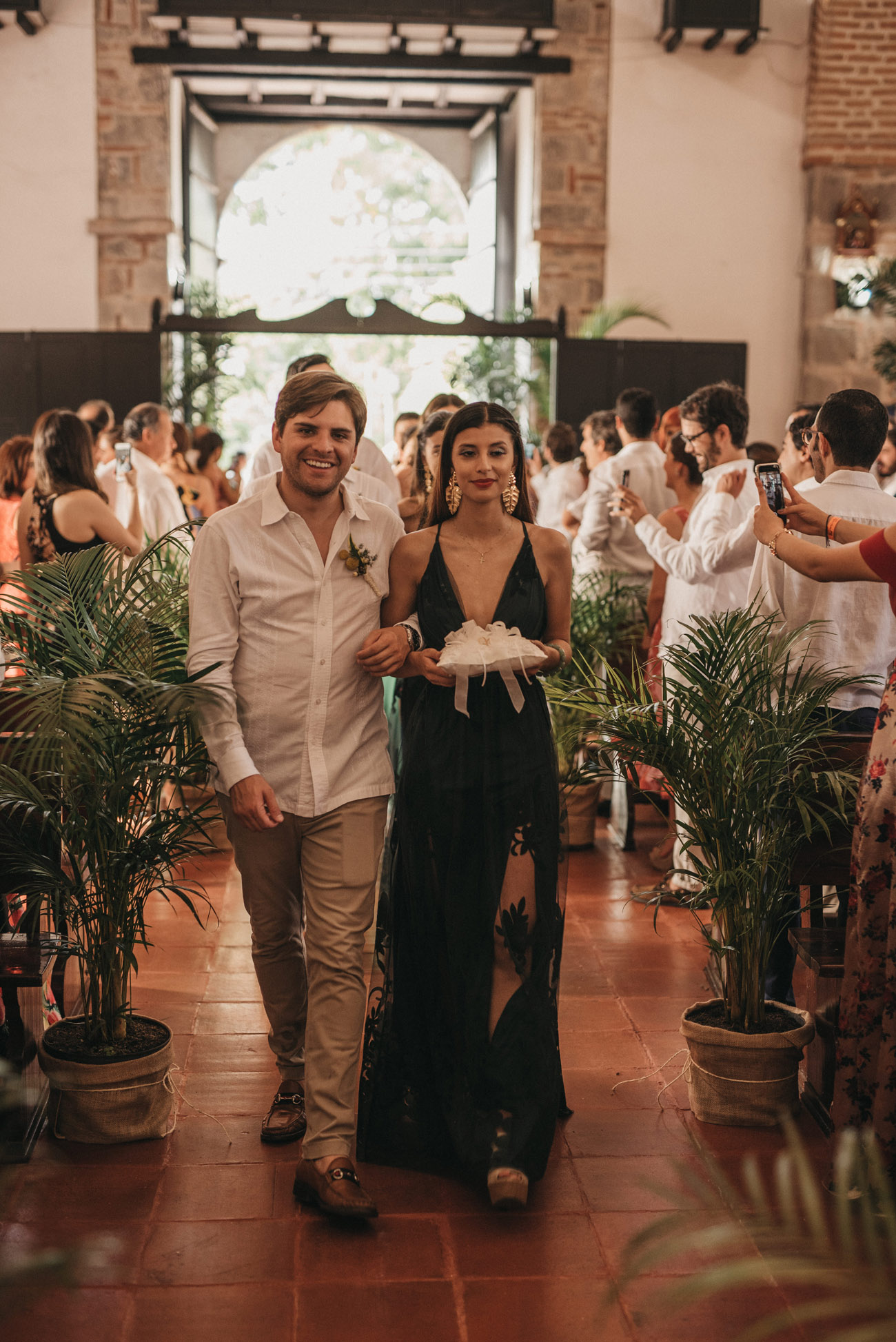 Soñaba con que su vestido de novia lo hiciera su tía Jenny Amador. Fue la que diseñó su vestido de bautizo, cuando aún no era consciente del cariño que le tiene ahora, el de la primera comunión, sus quince años, su grado… Lo quería bordado, después liso completamente, luego con flores de colores. Cuando supo que sería en Honda, se antojó de algo ligero, romántico y cómodo, un vestido para bailar y fluir. Entonces viajaron a Cartagena, al taller de Jenny, y al llegar, Camila se enamoró de una tela que después se convirtió en su vestido: hecho a mano cien por ciento, con pedrería, de escote profundo adelante y atrás y manga sisa. Sencillo, con la sutileza de los detalles bien pensados. Alrededor de su vestido (que se lo regaló su papá) hubo un montón de significados más; desde el maquillaje y el peinado, realizados por sus estilistas-amigos de toda la vida; el yugo, hecho por Don Eloy, empresa que quiere mucho y en la que trabajó, hasta las joyas: un anillo que su mamá le prestó y las aretas que su suegra le regaló.
