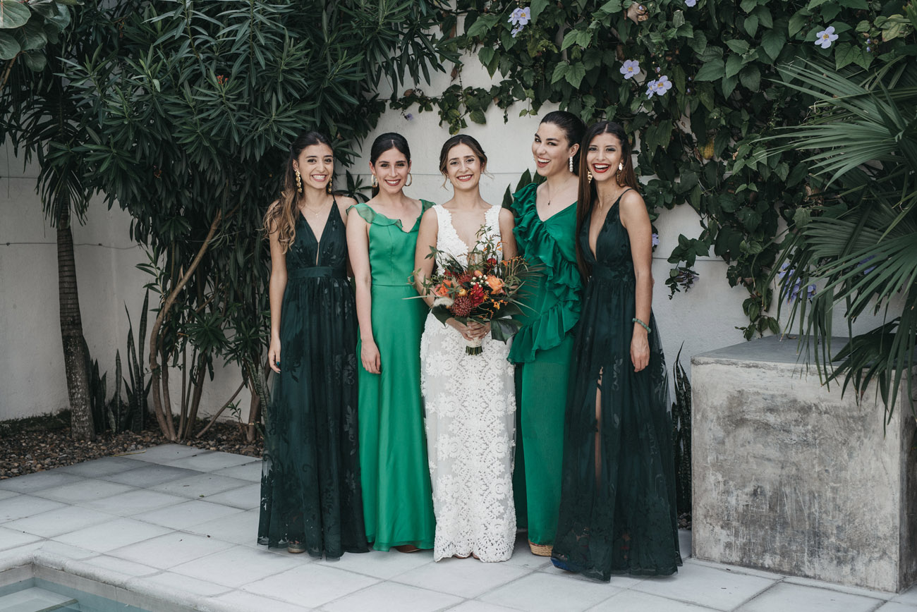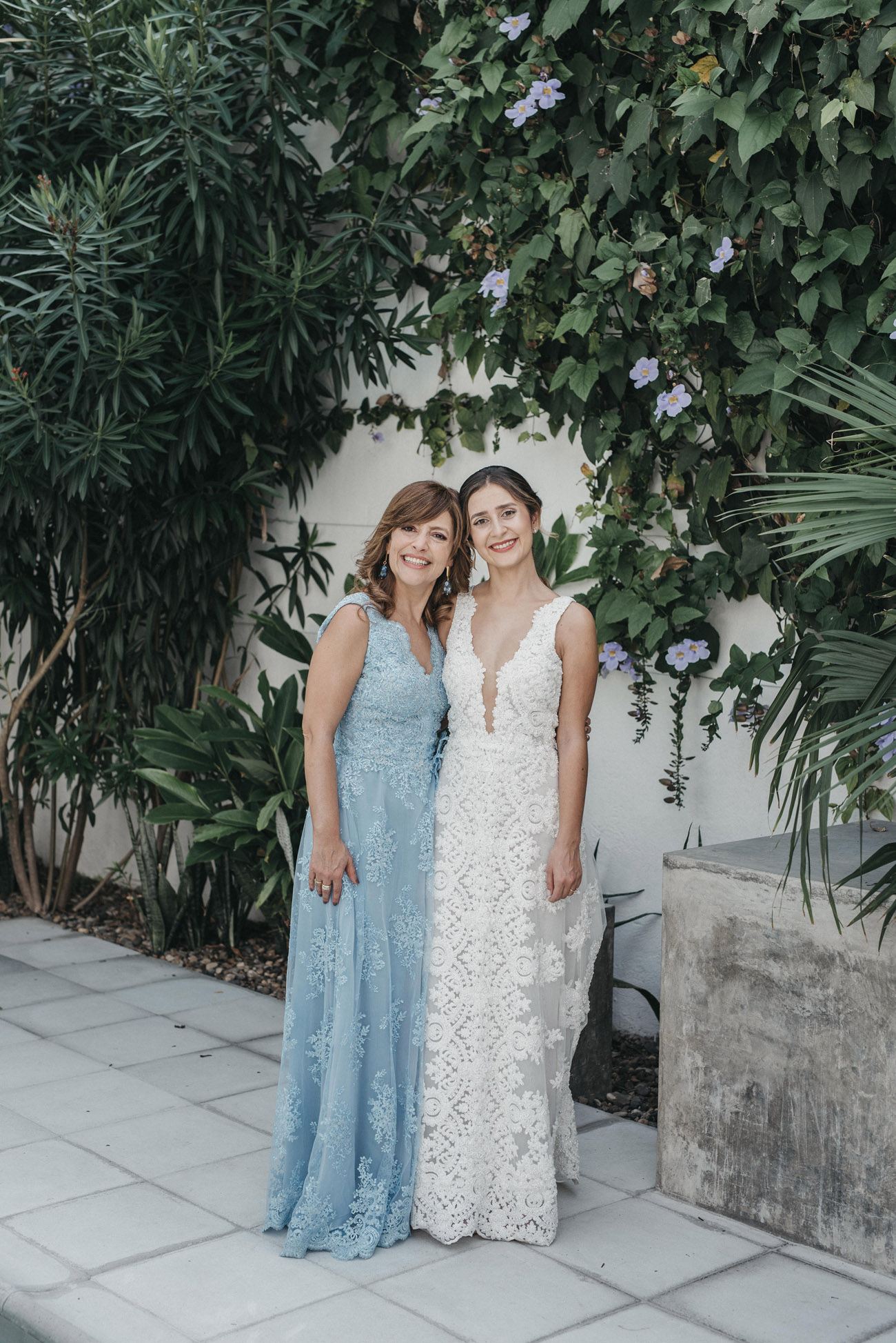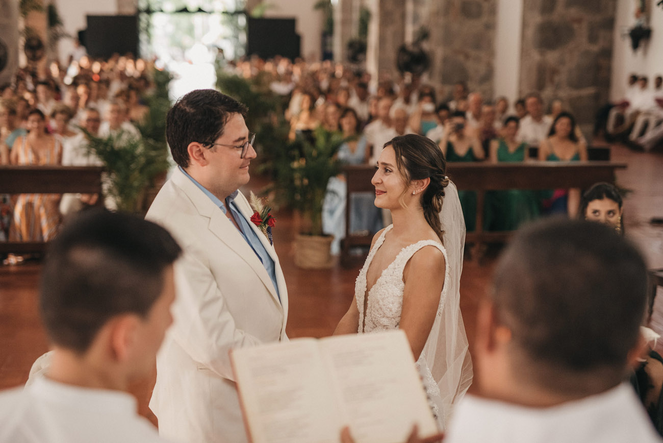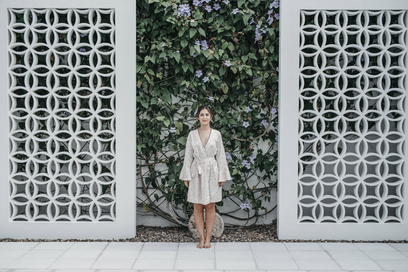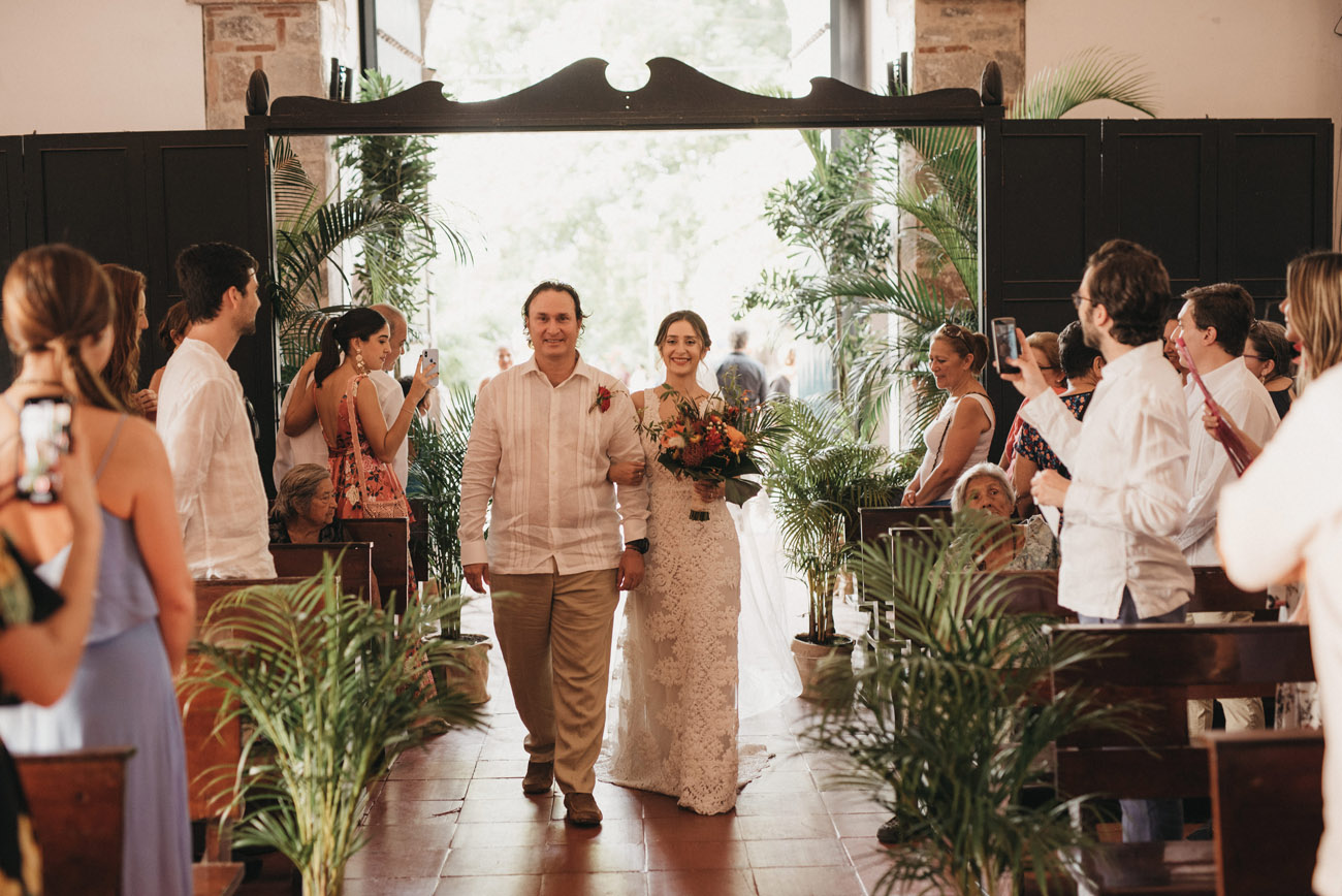 Soñaba con que su vestido de novia lo hiciera su tía Jenny Amador. Fue la que diseñó su vestido de bautizo, cuando aún no era consciente del cariño que le tiene ahora, el de la primera comunión, sus quince años, su grado… Lo quería bordado, después liso completamente, luego con flores de colores. Cuando supo que sería en Honda, se antojó de algo ligero, romántico y cómodo, un vestido para bailar y fluir. Entonces viajaron a Cartagena, al taller de Jenny, y al llegar, Camila se enamoró de una tela que después se convirtió en su vestido: hecho a mano cien por ciento, con pedrería, de escote profundo adelante y atrás y manga sisa. Sencillo, con la sutileza de los detalles bien pensados. Alrededor de su vestido (que se lo regaló su papá) hubo un montón de significados más; desde el maquillaje y el peinado, realizados por sus estilistas-amigos de toda la vida; el yugo, hecho por Don Eloy, empresa que quiere mucho y en la que trabajó, hasta las joyas: un anillo que su mamá le prestó y las aretas que su suegra le regaló.